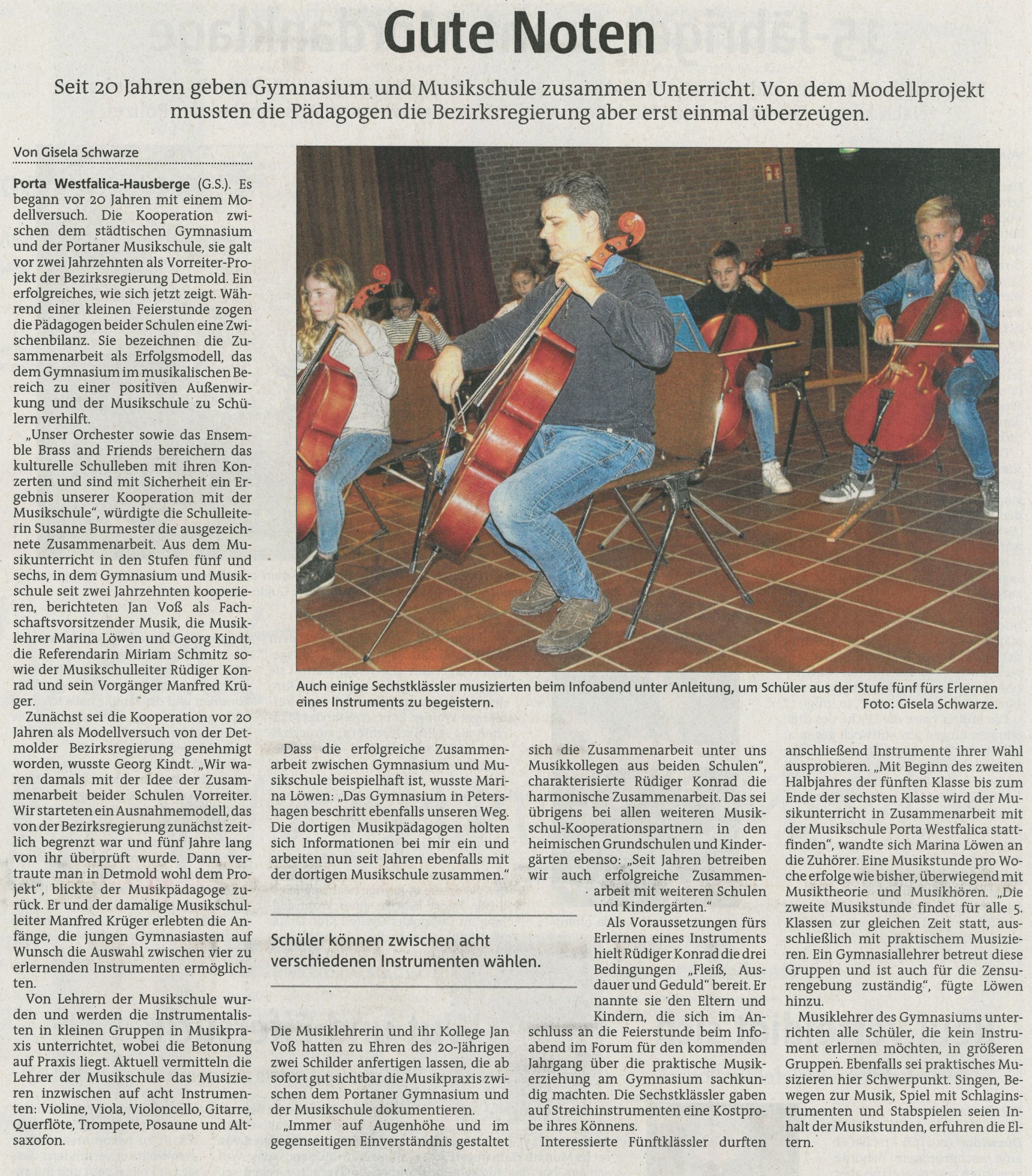 Susanne Burmester (Leiterin des Gymnasiums), Rüdiger Konrad (Leiter der Musikschule), Georg Kindt (ehemaliger Musiklehrer und ein Motor der Kooperation), Manfred Krüger (ehemaliger Leiter der Musikschule und ein weiterer Motor der Kooperation), Marina Löwen, Miriam Schmitz und Jan Voß (als aktive Musiklehrkräfte) erinnerten sich im Rückblick an die Grundidee vom praktischen Musikunterricht und die daraus erwachsenden Früchte, die die Musikpraxis sowie für Schülerinnen und Schüler als auch für Musikschule und Gymnasium trägt.