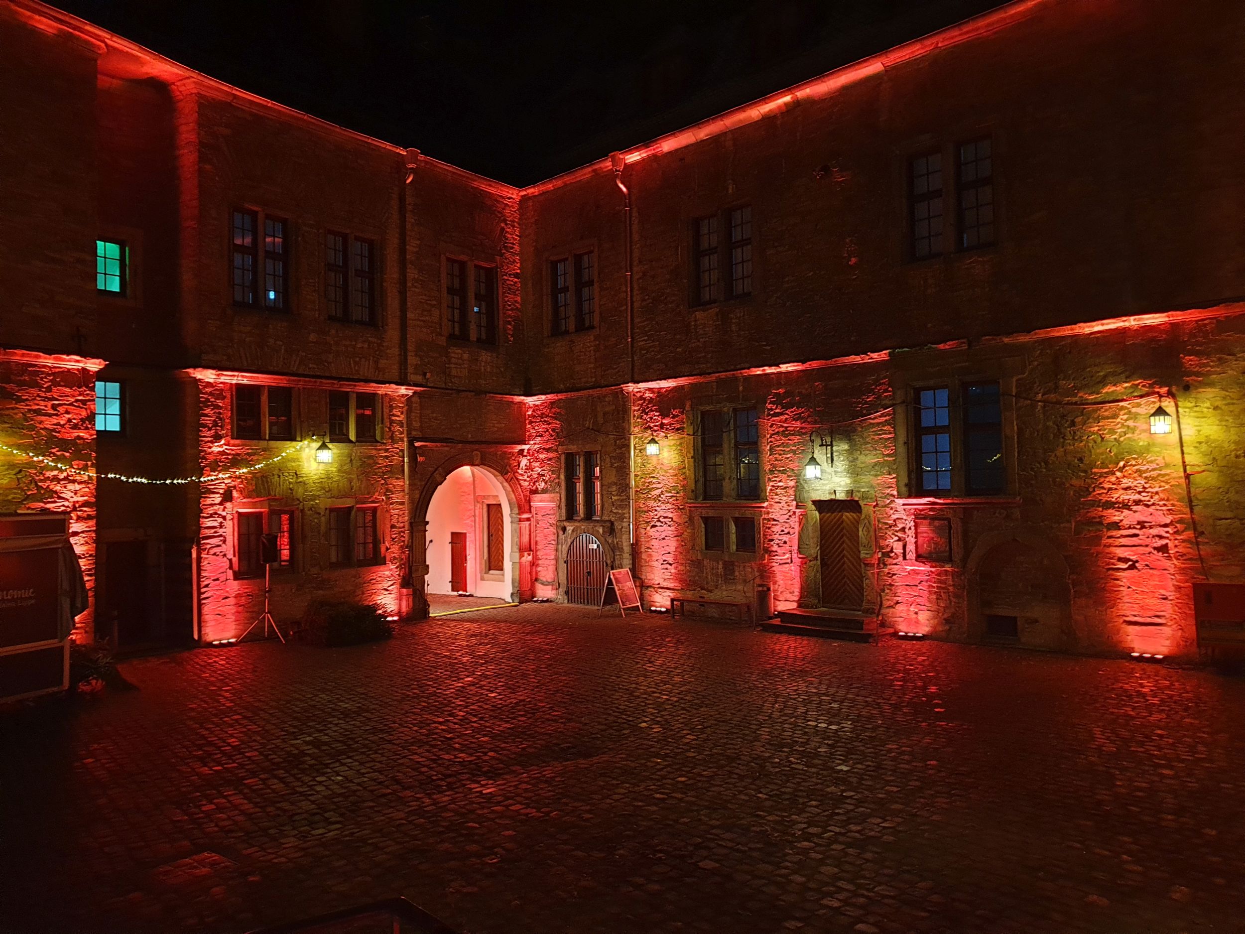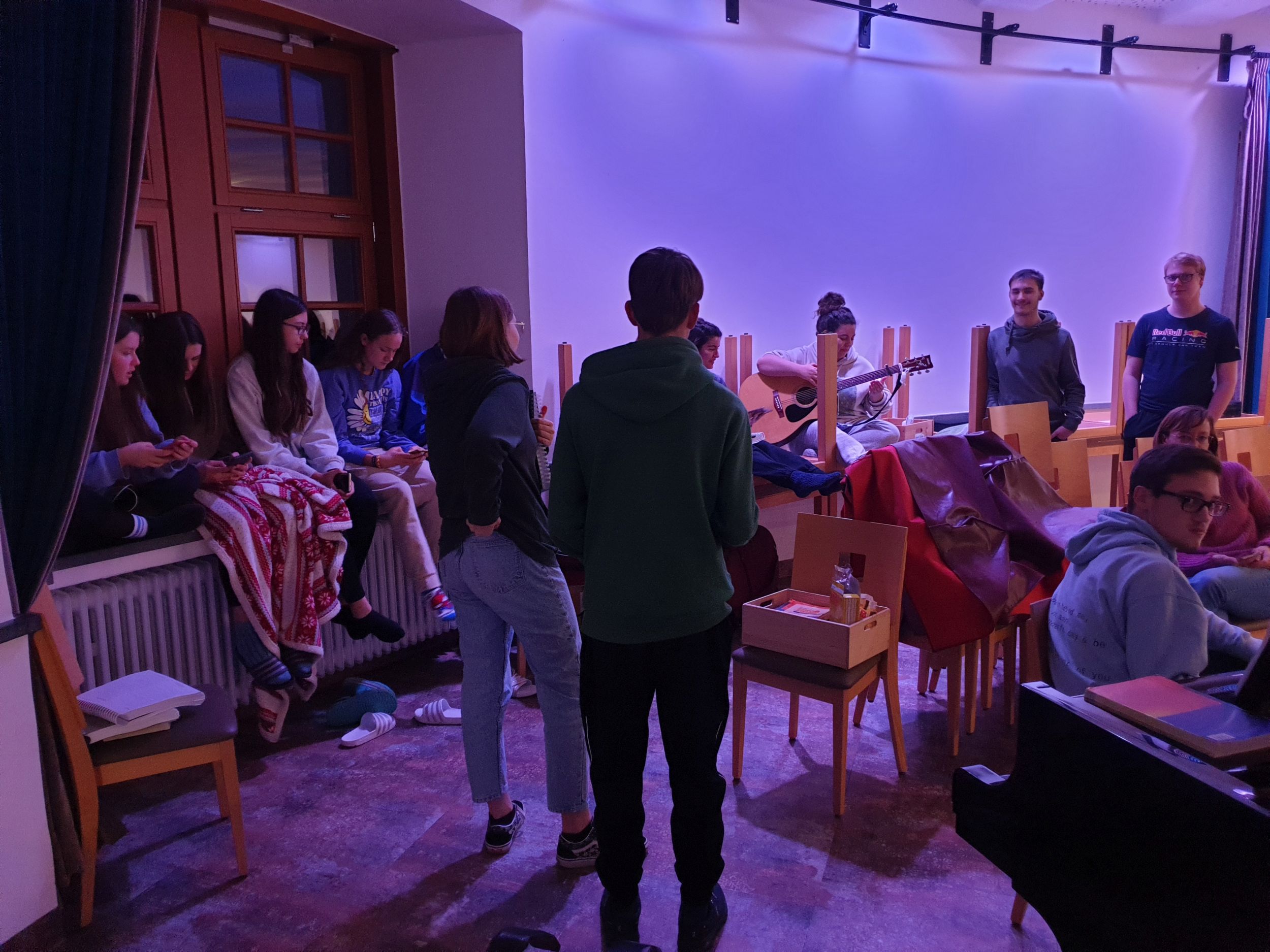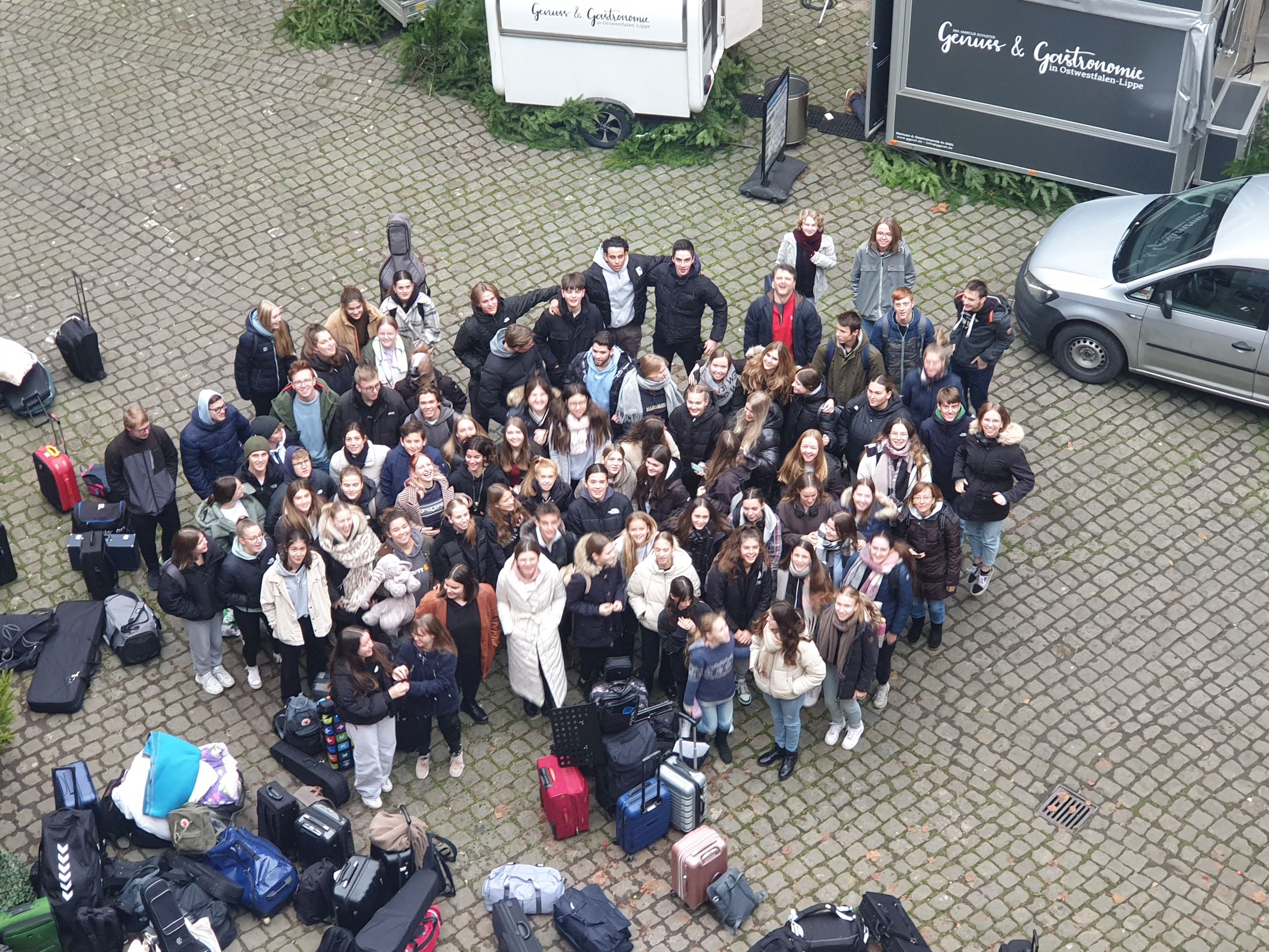 Am Donnerstag, dem 1.12.22, machten wir uns nach der 6. Stunde auf und fuhren mit zwei Bussen Richtung Wewelsburg. Nach Ankunft und Beziehen der Zimmer ging es dann auch schon mit den ersten Proben los. Beim Abendessen im Anschluss waren – laut Aussage der Schülerinnen an einem Tisch – die Kartoffeln sowohl zu weich als auch zu hart, sowohl zu gelb als auch zu blass … so oder so ähnlich ist es bei den Lehrkräften angekommen. Dass sonst kaum Kritik am Essen der Jugendherberge geübt wurde, ist für so einen Betrieb wohl ein Ritterschlag! Abends schloss sich noch eine weitere Probe an und ging dann für viele Teilnehmer*innen nahtlos ins gemeinsame Singen im großen Festsaal über. Andere wiederum lieferten sich in den Gängen der Burg eine Schlacht mit Nerf-Schaumgummipfeilen. Die Nachtruhe sollte kommen und kam dann irgendwann auch. Tims 18. Geburtstag kann schließlich nicht jäh unterbrochen werden… Wir wünschen dir noch einmal alles Gute. Schön, dass du trotz des großen Tages dabei warst!