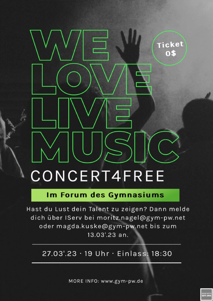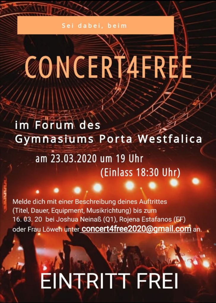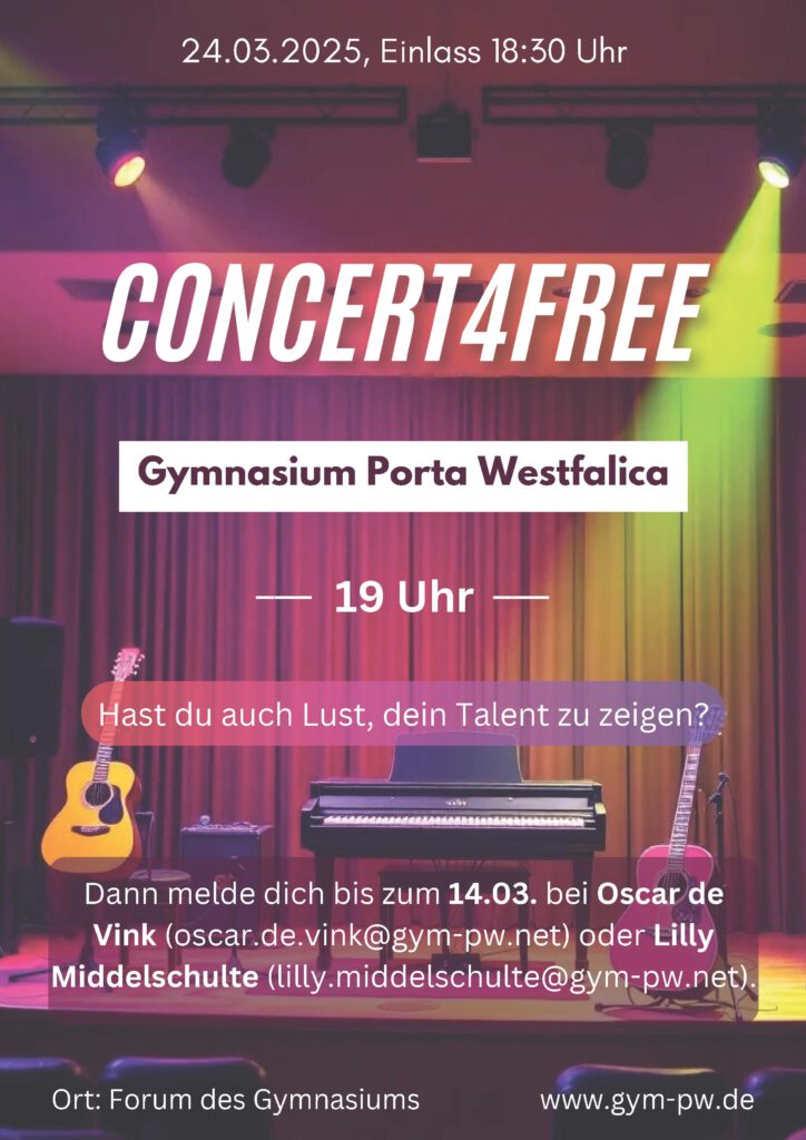 Spielst du ein Instrument oder singst du gerne und möchtest dein Können vor einem Publikum präsentieren? Dann bist du beim diesjährigen Concert4free genau richtig. Unser diesjähriges Concert4free findet am 23.03.2020 um 19 Uhr im Forum des Gymnasiums statt. Einlass ist um 18:30 Uhr, der Eintritt ist frei. Anmelden kannst du dich als Solokünstler oder auch in einer Gruppe bei Joshua Neinaß (Q1), Rojena Estafanos...weiterlesen