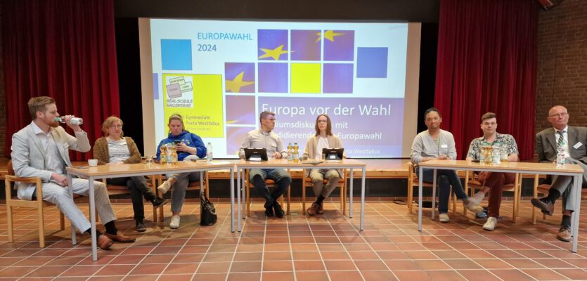 Am 06. Juni 2024 fand anlässlich der anstehenden Europawahl eine neunzigminütige Podiumsdiskussion im Forum statt. Es nahmen Anna Lena Zarebski (CDU), Gesine Frank (Die Linke), Julius Missner (FDP), Ingo Stucke (SPD), Dave Daniel Pador-Sundermeyer (Grüne) und Maximilian Kneller (AfD) daran teil. Schülerinnen Schüler der Q1 und des Jahrgangs 10 nutzten die Gelegenheit, aktiv an der Veranstaltung teilzunehmen und ihre...weiterlesen