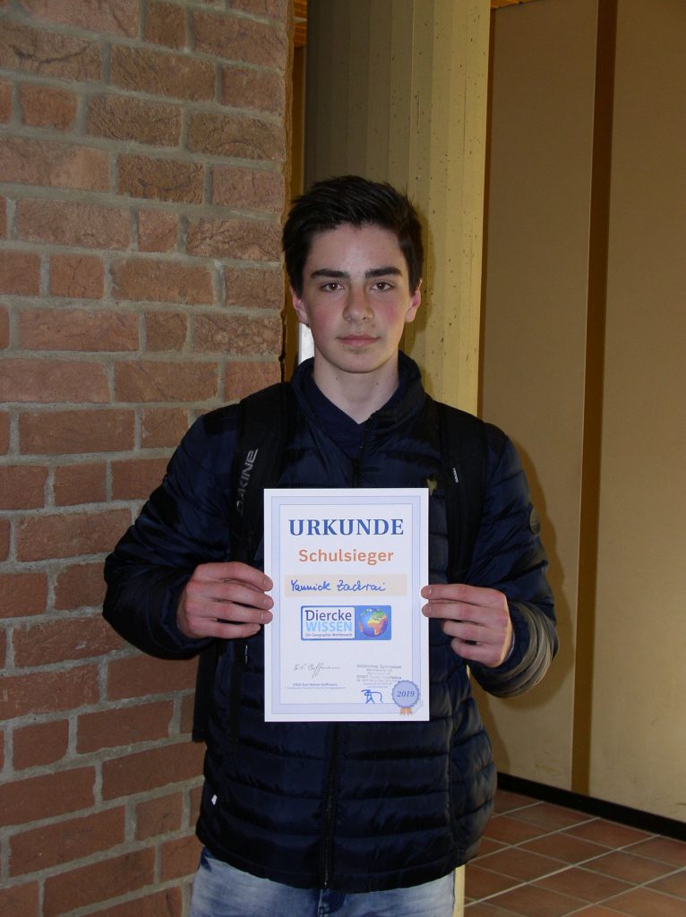 Yannick Zachrai aus der 8C ist unser Schulsieger Etwa 170 SchülerInnen unserer Schule nahmen am diesjährigen Erdkunde-Wettbewerb, welcher bereits im Januar begann, teil. Seit Ende März steht der Schulsieger fest: Yannick Zechrai aus der 8C belegt den ersten Platz, gefolgt von Savas Schmidt aus der 7D und Maarten Deerberg aus der 9C. Die SchülerInnen mussten sich verschiedenen Fragen und Aufgaben stellen...weiterlesen