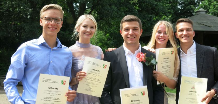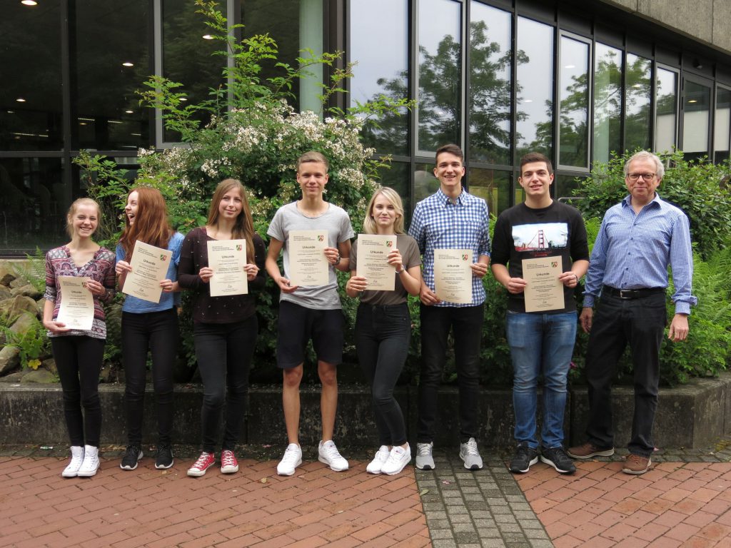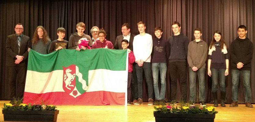 Engagierte Mathematiker arbeiten im Team im Rahmen von „macht mathe: Alympiade" und „macht mathe: B-Tag" und freuen sich - zusammen mit der Schulleiterin Frau Burmester und dem Koordinator für Mathematik-Wettbewerbe Jürgen Depping - über ihre erfolgreiche Teilnahme und die Urkunden der Landesregierung des Landes NRW.Ein herzlicher Glückwunsch geht an folgende Teams: Team 1 (Jg. EF * Alympiade): Julia Hecke; Mika...weiterlesen