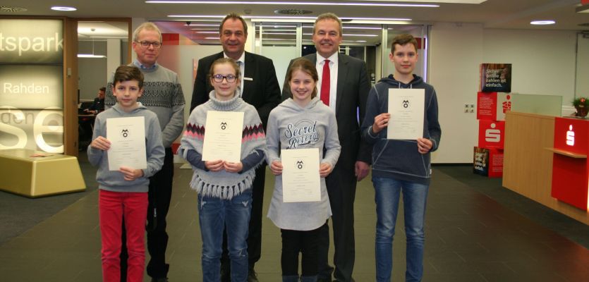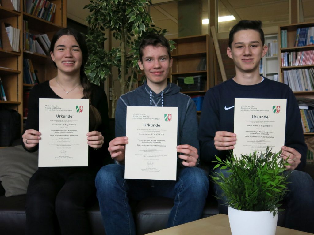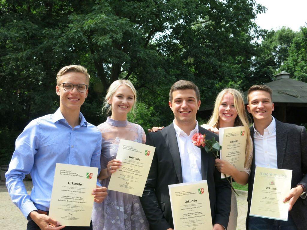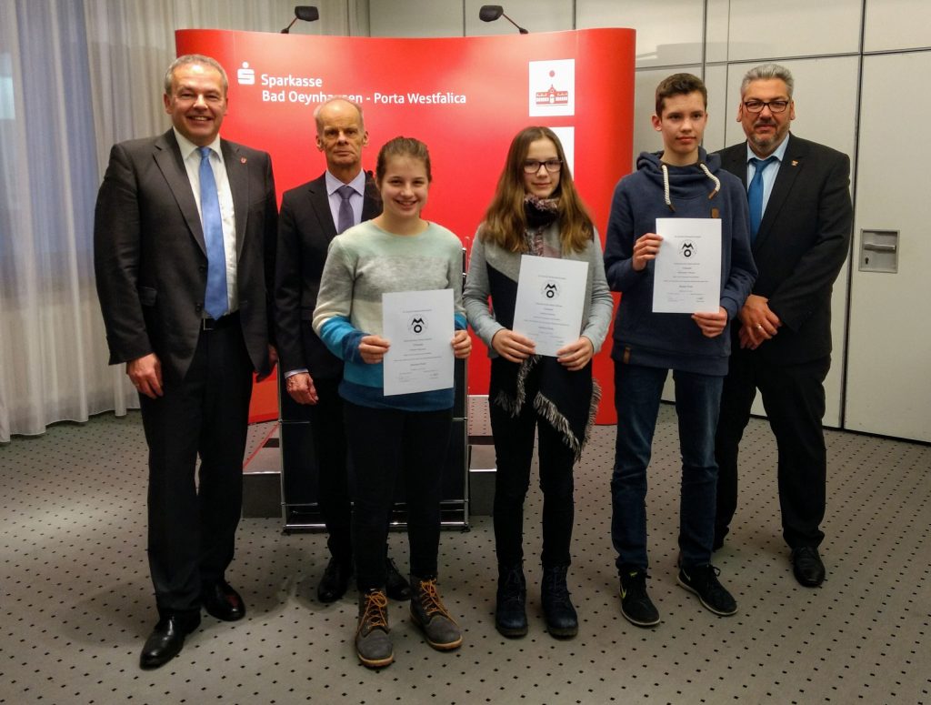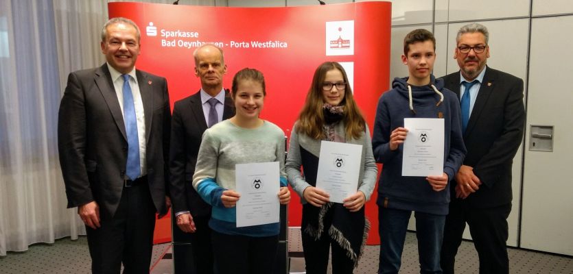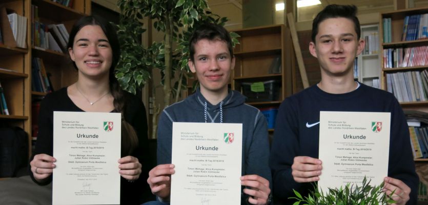 Die diesjährige Preisverleihung der Mathematik-Olympiade fand am 17.01.2019 im Rahmen einer kreisweiten Feierstunde in der Sparkasse Bad Oeynhausen-Porta Westfalica in Bad Oeynhausen statt. In ihrer jeweiligen Jahrgangsstufe konnten Julian Robin Völlmecke (EF), Charlotte Beckmann (9a) und Josephine Beckmann (6a) ausgezeichnete Leistungen erbringen, sich auf Kreisebene ganz vorn platzieren und teilweise für die Landesrunde...weiterlesen