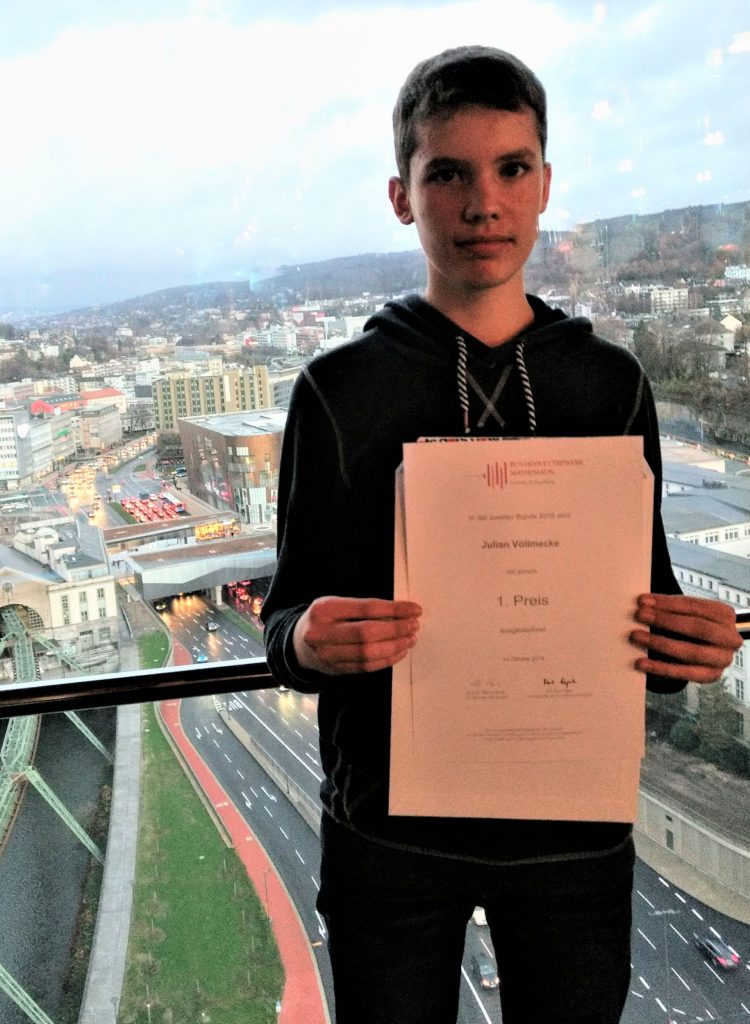 Im Finale des Bundeswettbewerbs Mathematik (BWM) konnte Julian Robin Völlmecke (15-jähriger Schüler der EF unseres Gymnasiums) wieder ganz hervorragende Ergebnisse und so den außergewöhnlichen Bundessieg erringen. Zwei Tage lang fand in Hofgeismar bei Kassel die letzte, entscheidende Bundesrunde statt. Nach seiner Qualifikation in zwei Vorrunden musste sich Julian nun in einem einstündigen Kolloquium beweisen...weiterlesen