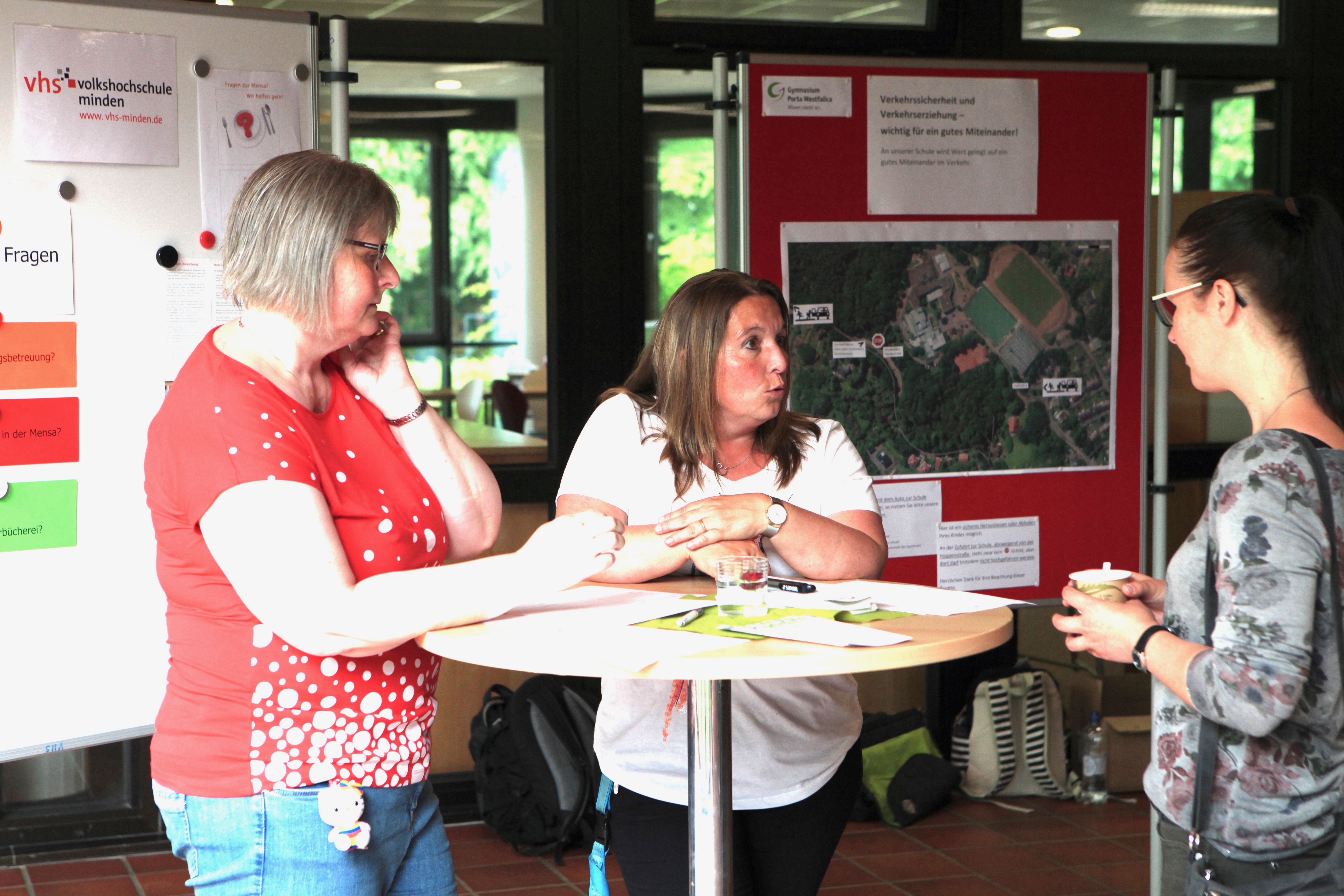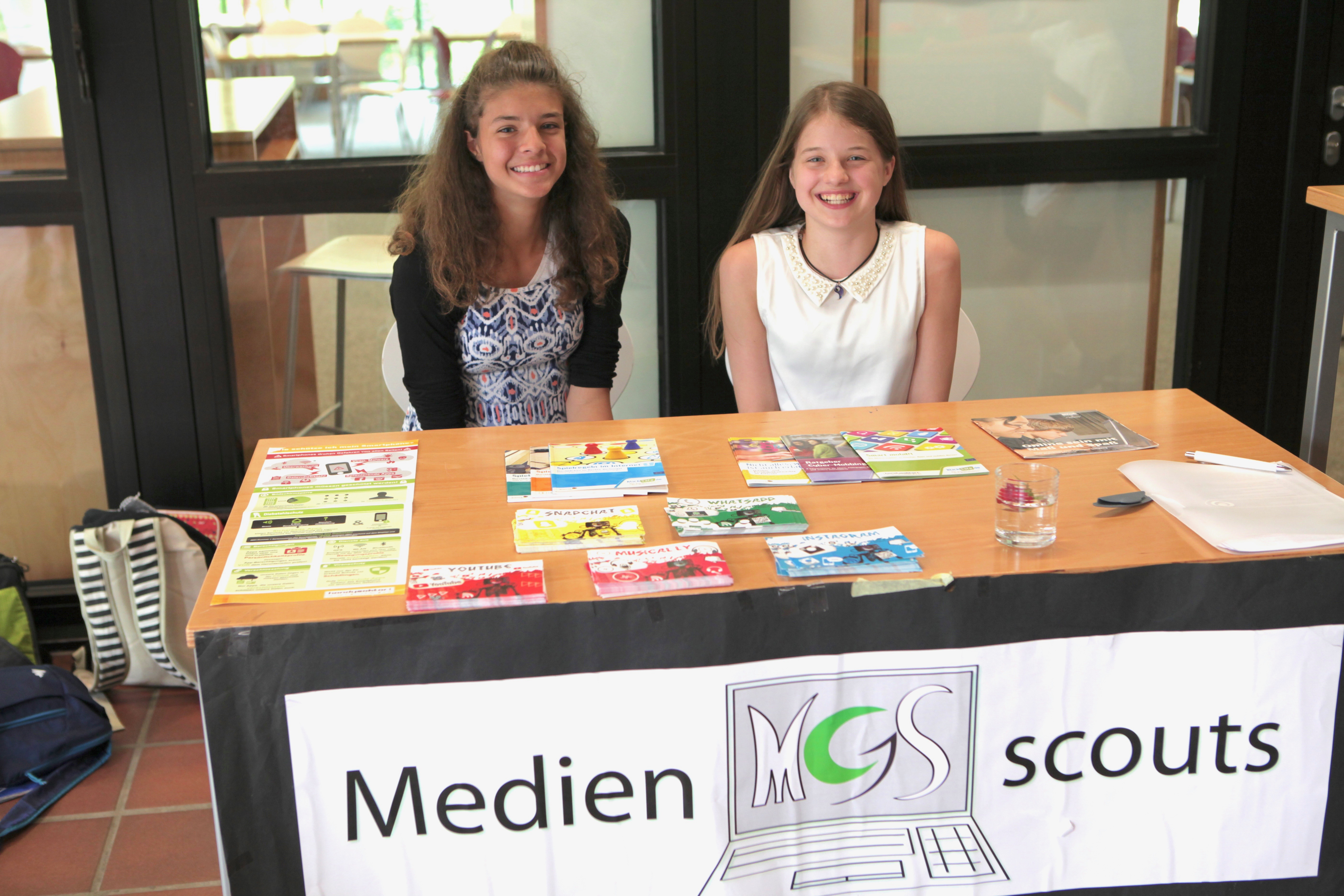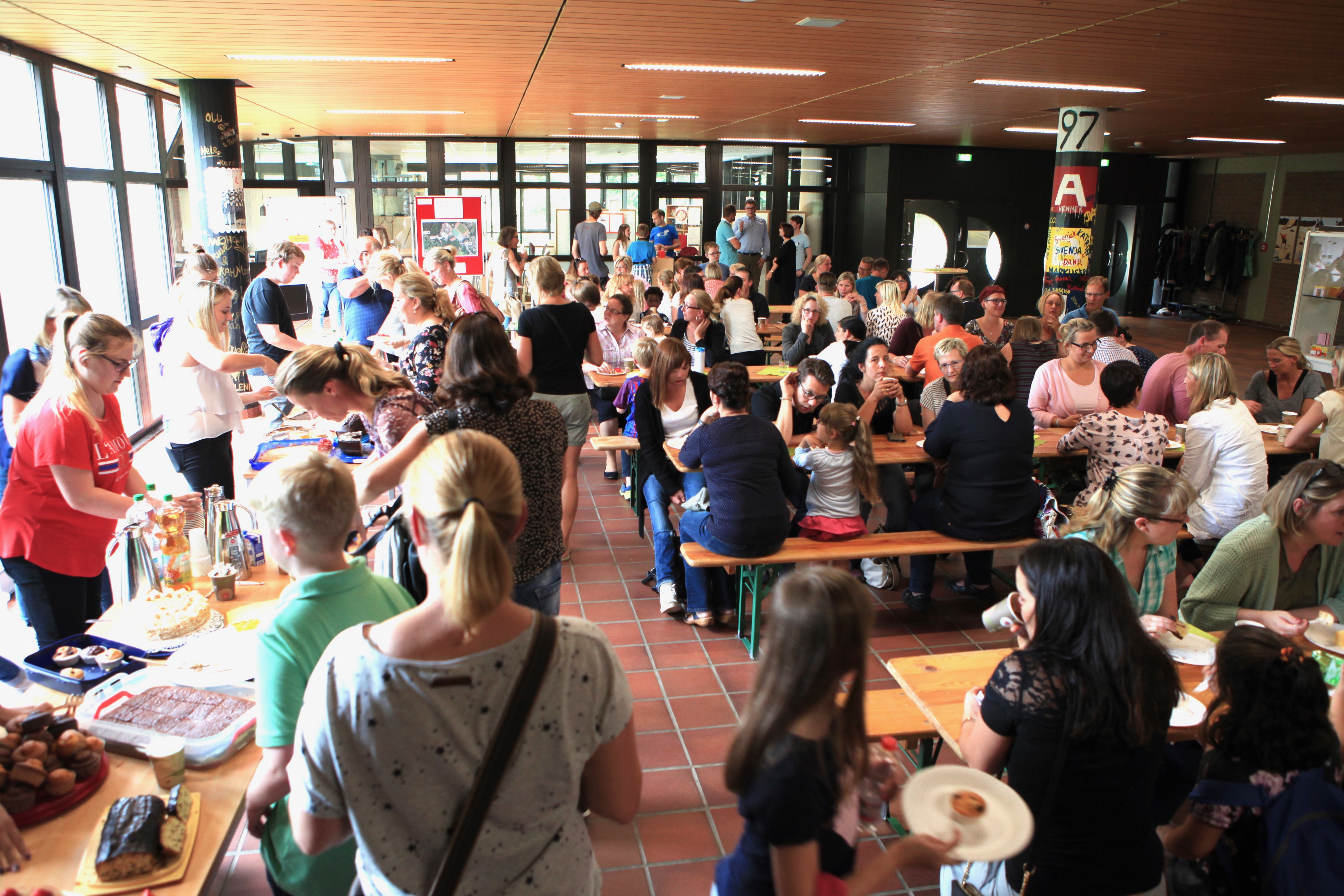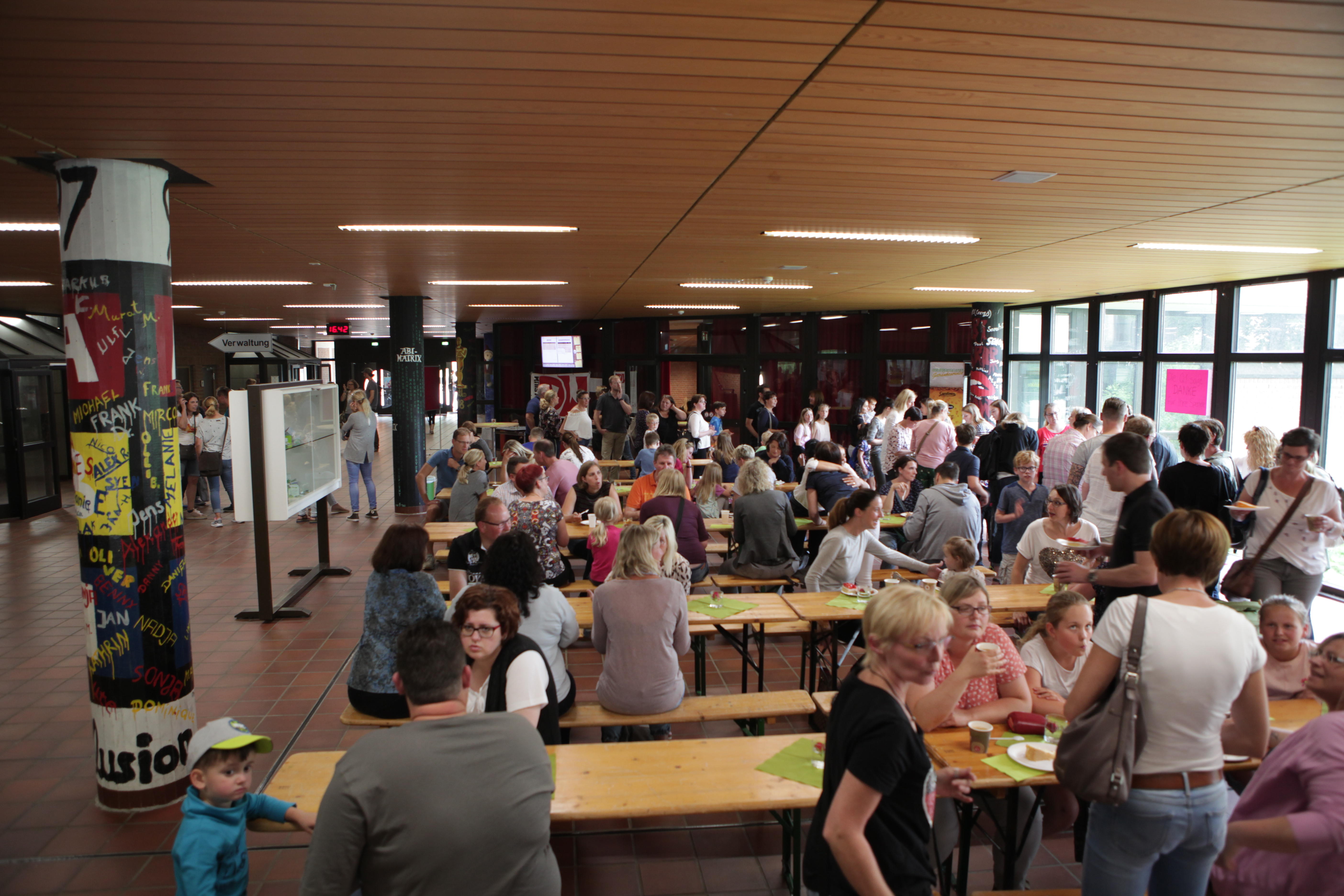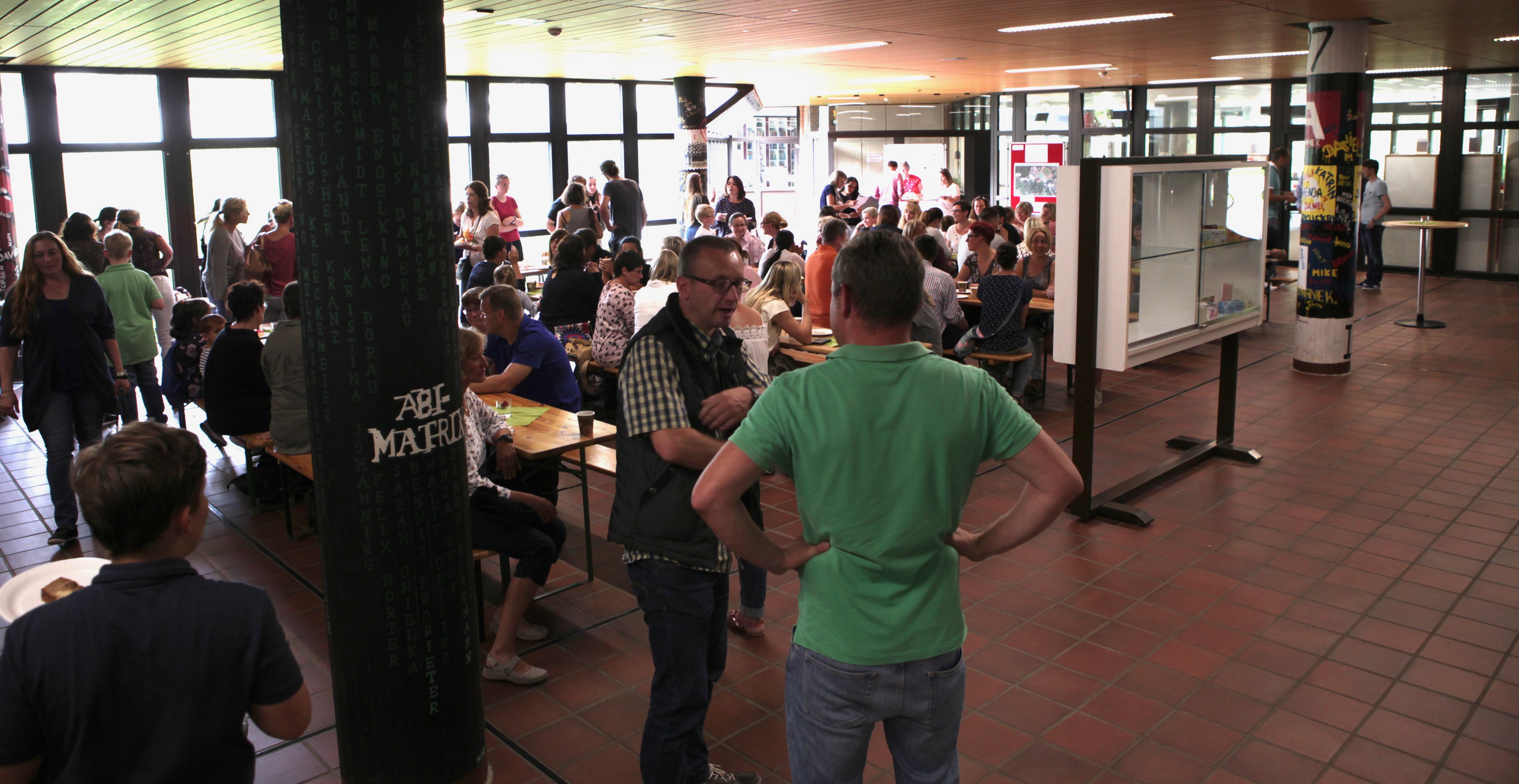 Währenddessen hatten die Eltern die Gelegenheit, sich bei Kaffee und Kuchen in der Schulstraße über die Angebote der Übermittagsbetreuung, der SV, der Schulsozialarbeit und der Medienscouts zu informieren. Viele nutzen auch das Angebot, sich durch das Schulgebäude und über das Schulgelände führen zu lassen.