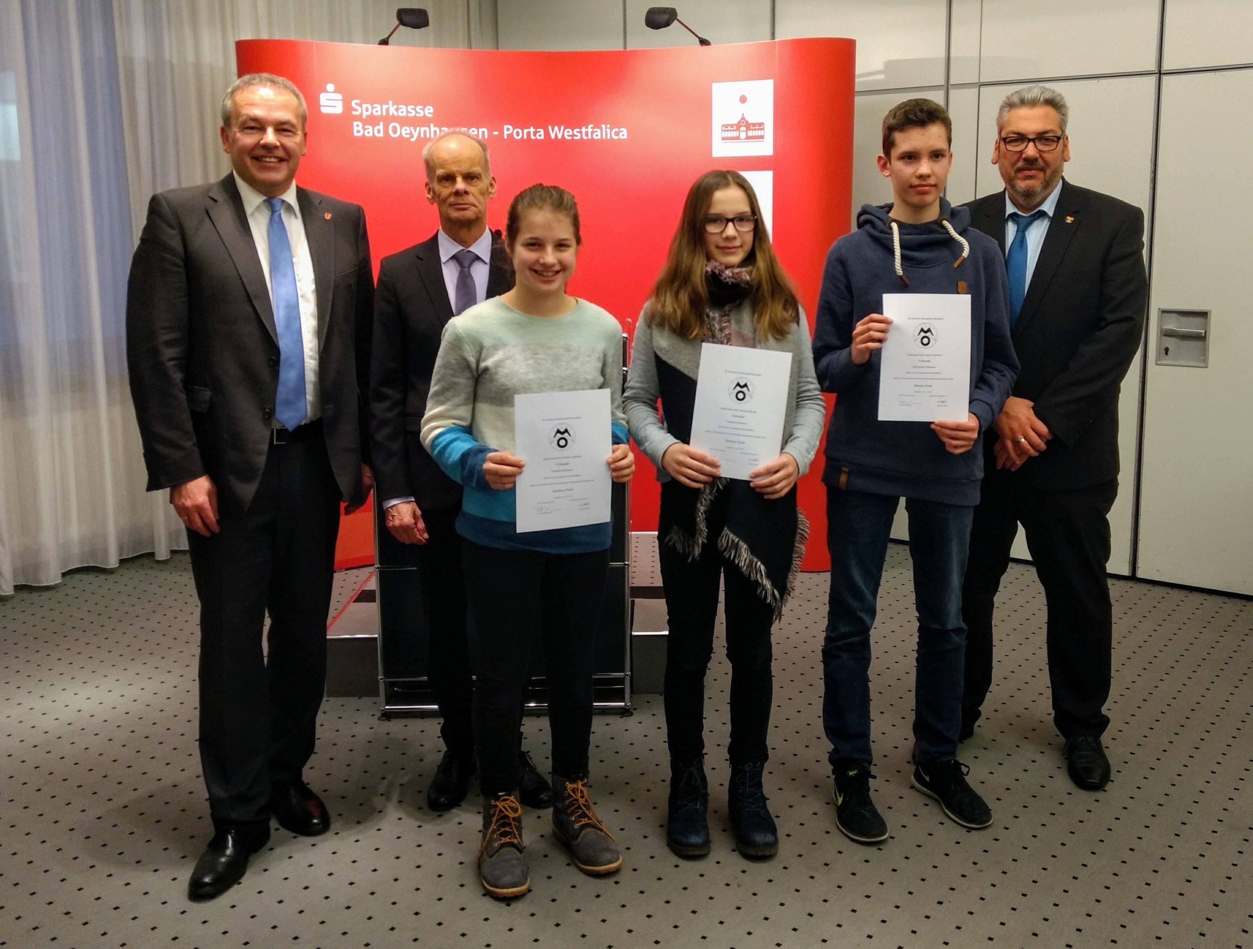 Die diesjährige Preisverleihung der Mathematik-Olympiade fand am 17.01.2019 im Rahmen einer kreisweiten Feierstunde in der Sparkasse Bad Oeynhausen-Porta Westfalica in Bad Oeynhausen statt. In ihrer jeweiligen Jahrgangsstufe konnten Julian Robin Völlmecke (EF), Charlotte Beckmann (9a) und Josephine Beckmann (6a) ausgezeichnete Leistungen erbringen, sich auf Kreisebene ganz vorn platzieren und teilweise für die Landesrunde NRW qualifizieren.