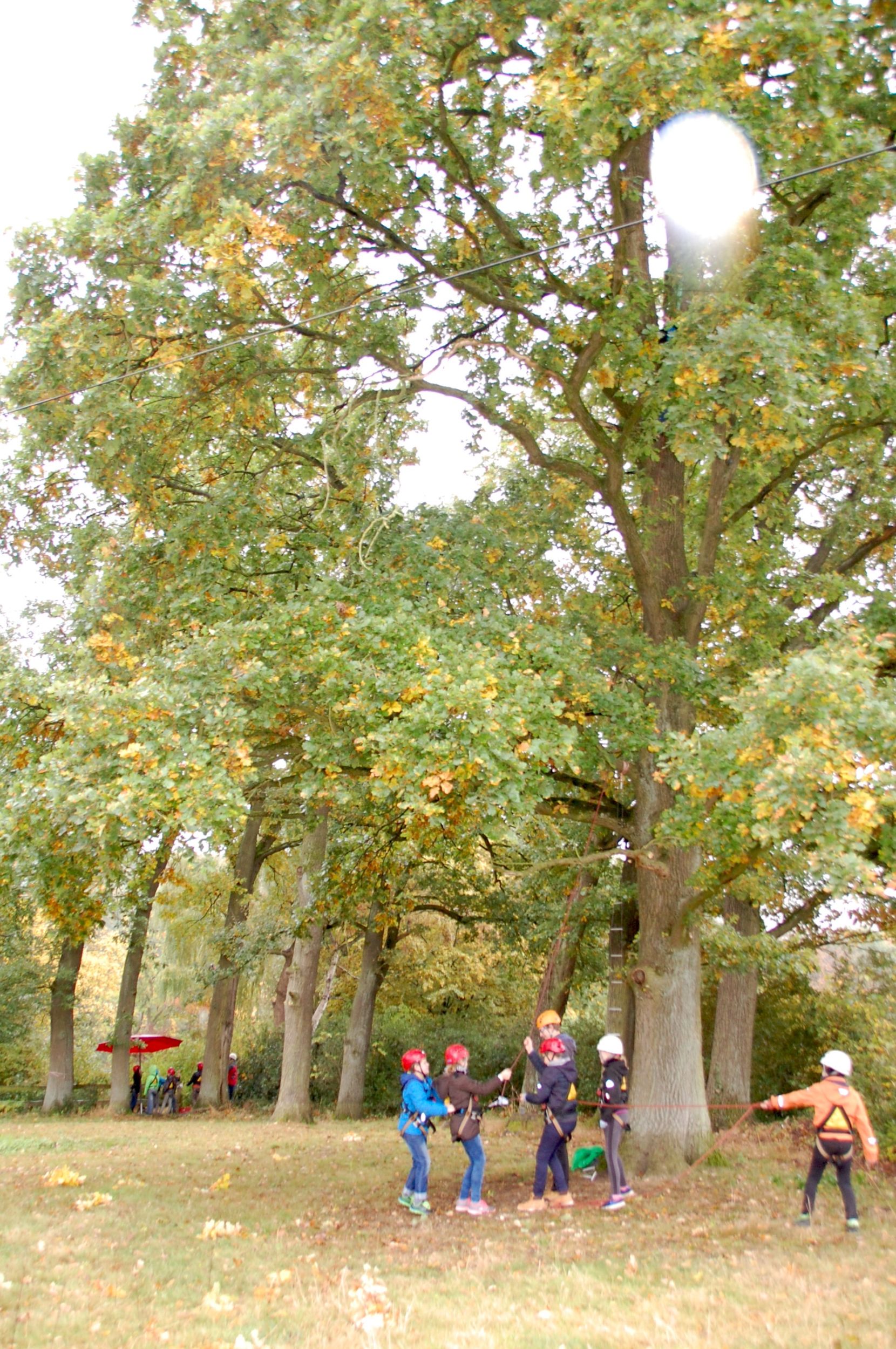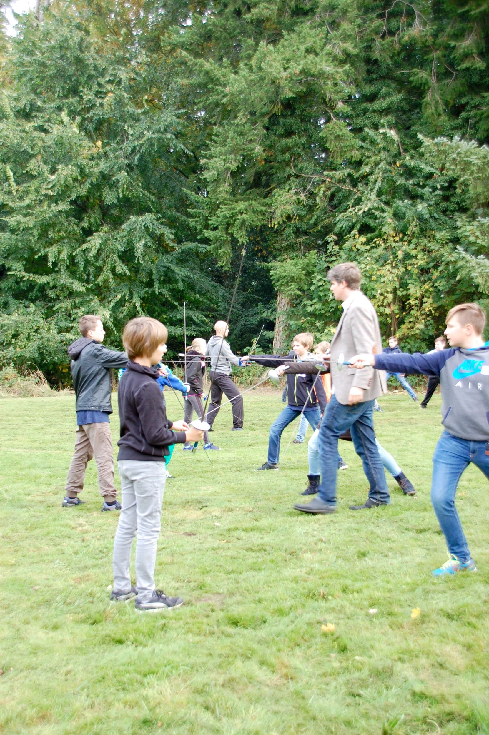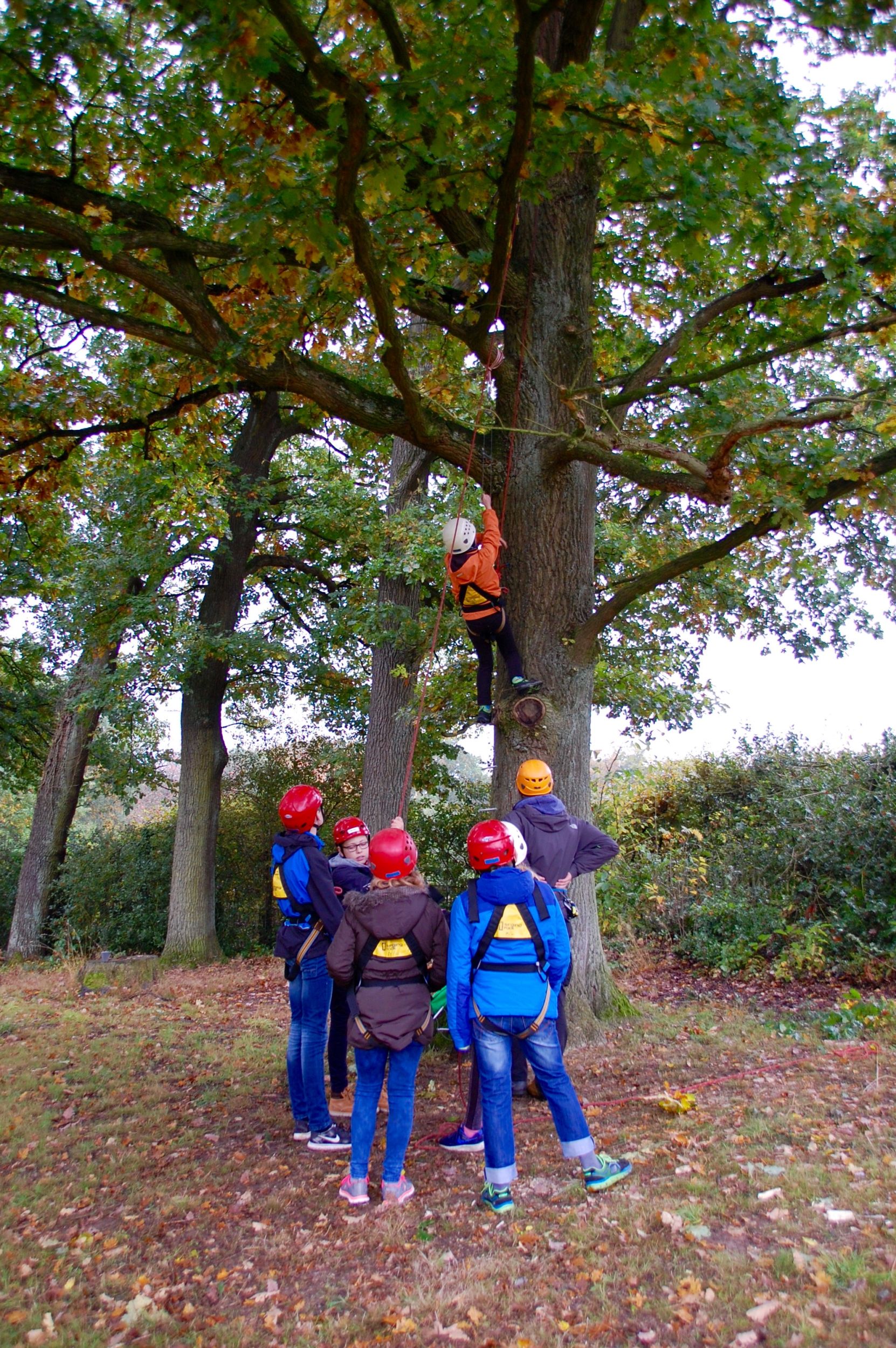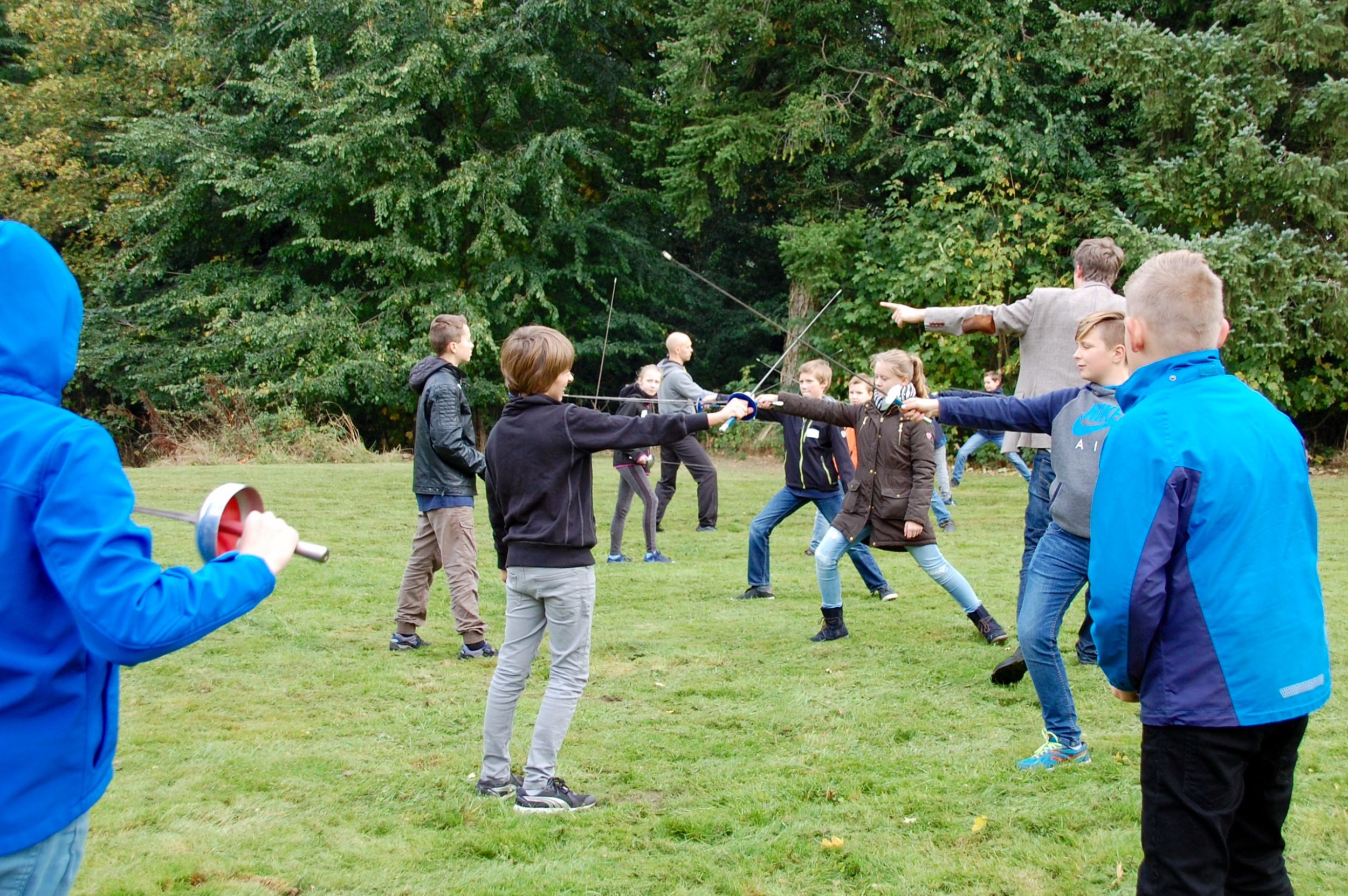 Das galt auch für unsere Schüler beim Herbstcamp auf dem Hof von Laer & TeichHof Schmiede in Herford , zu dem das Literaturbüro OWL auch 2016 eingeladen hatte: Zuerst Lesungen aus den Romanen „Der wilde Wald“ und „Die schwarze Stadt“ lauschen, dann wie die Helden in den Romanen unter fachkundiger Anleitung fechten, raufen und in Bäumen klettern… In Aktion zu sehen sind Hendrik Spieß und Niklas Mohme (Jgst. 6) und Joris Vanhoof und Julius Spieß (Jgst. 8).