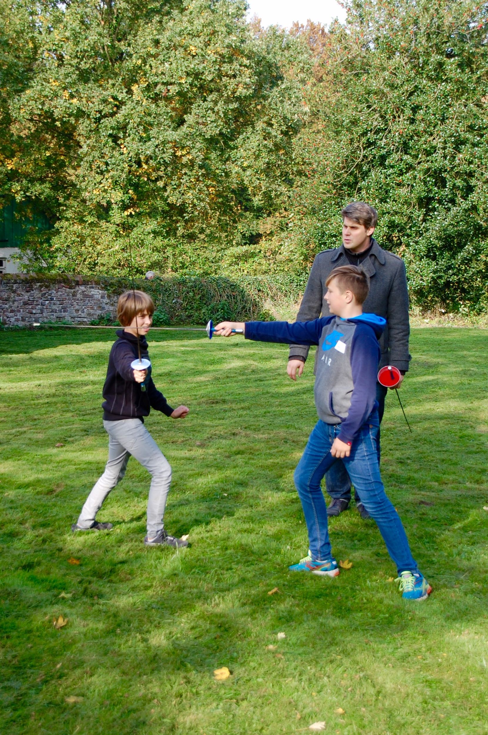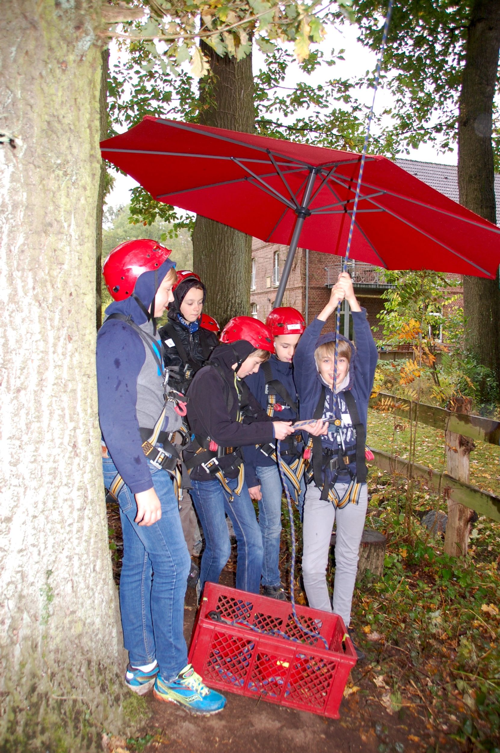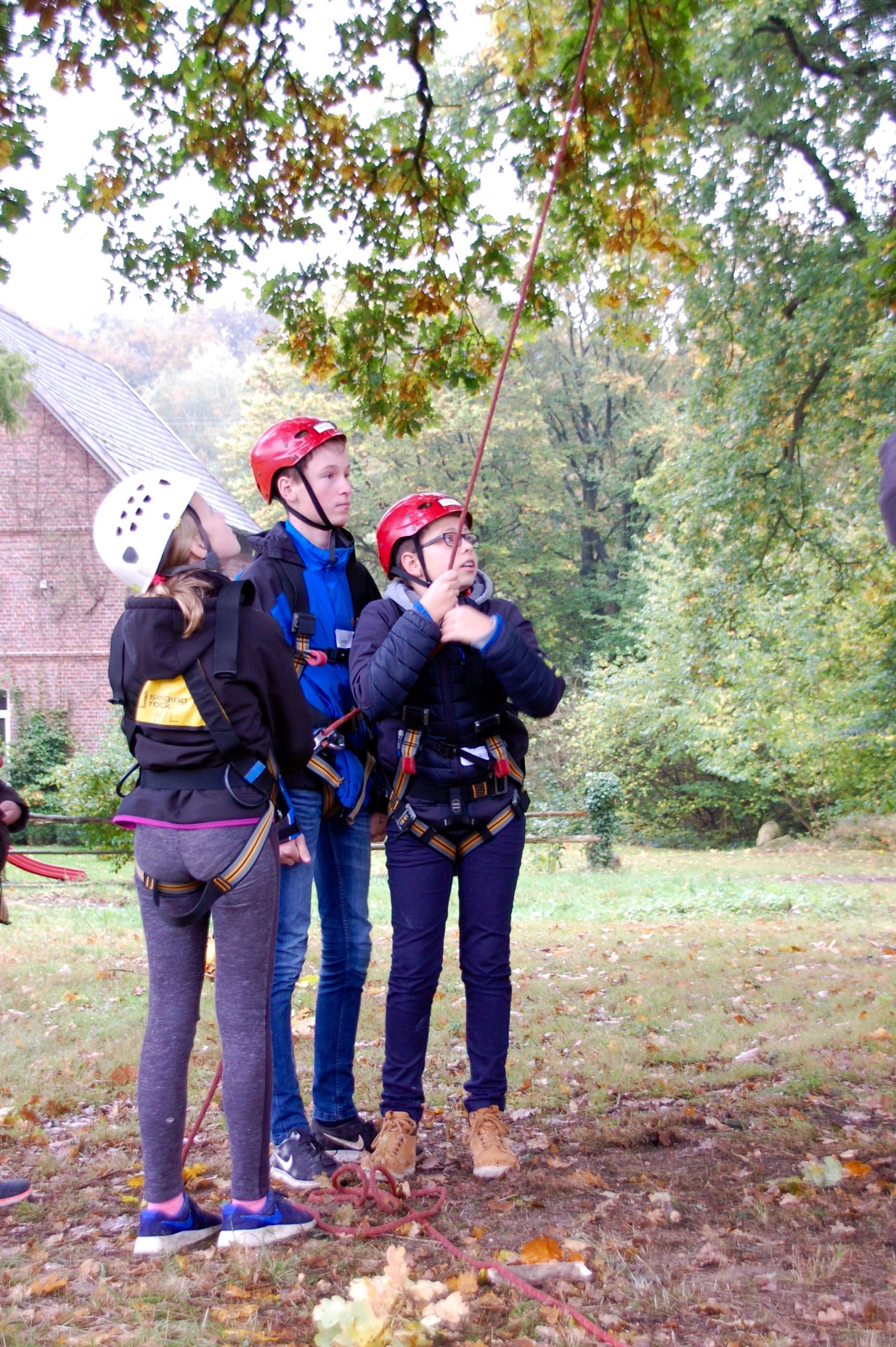 Das galt auch für unsere Schüler beim Herbstcamp auf dem Hof von Laer & TeichHof Schmiede in Herford , zu dem das Literaturbüro OWL auch 2016 eingeladen hatte: Zuerst Lesungen aus den Romanen „Der wilde Wald“ und „Die schwarze Stadt“ lauschen, dann wie die Helden in den Romanen unter fachkundiger Anleitung fechten, raufen und in Bäumen klettern… In Aktion zu sehen sind Hendrik Spieß und Niklas Mohme (Jgst. 6) und Joris Vanhoof und Julius Spieß (Jgst. 8).
