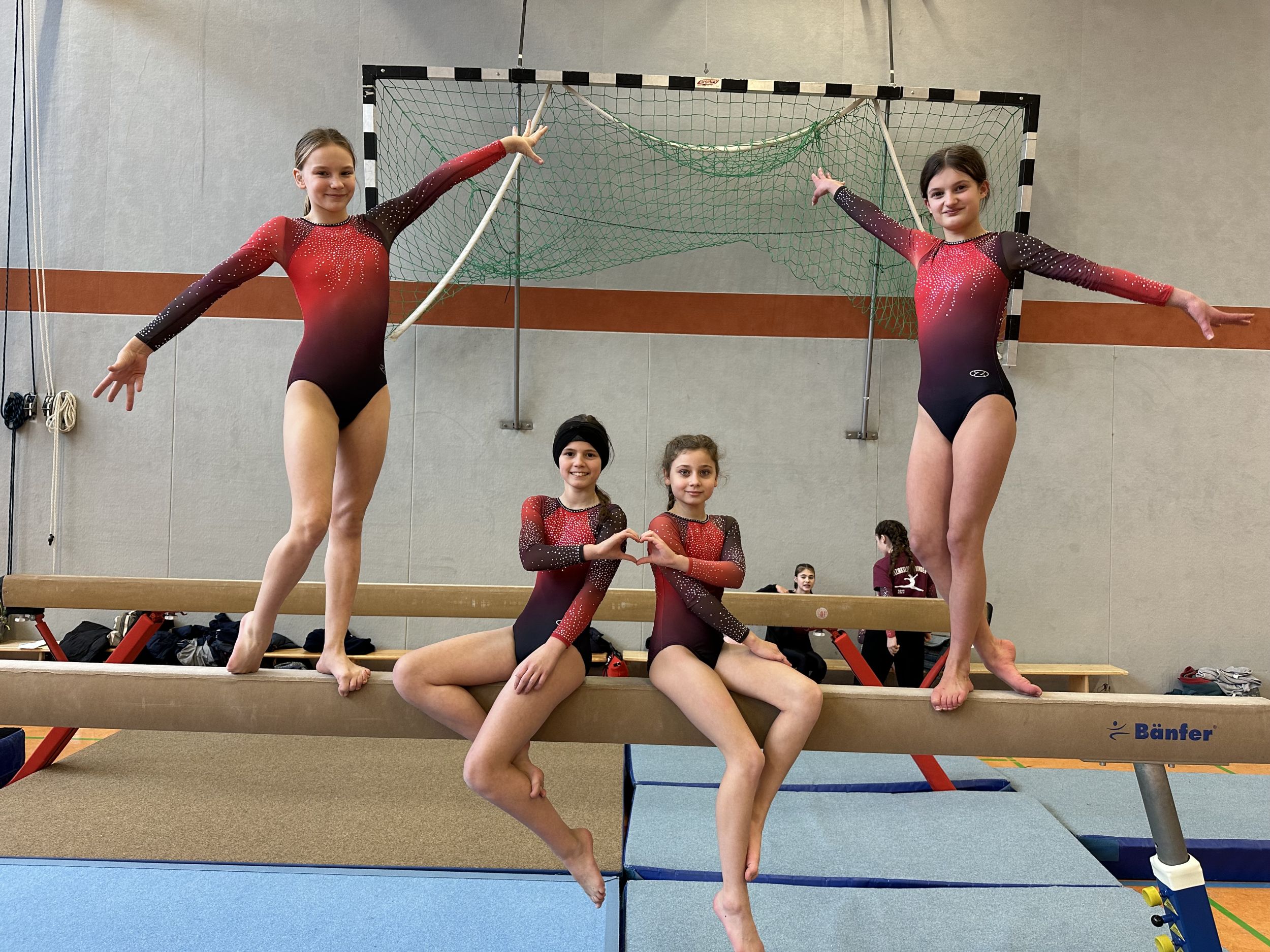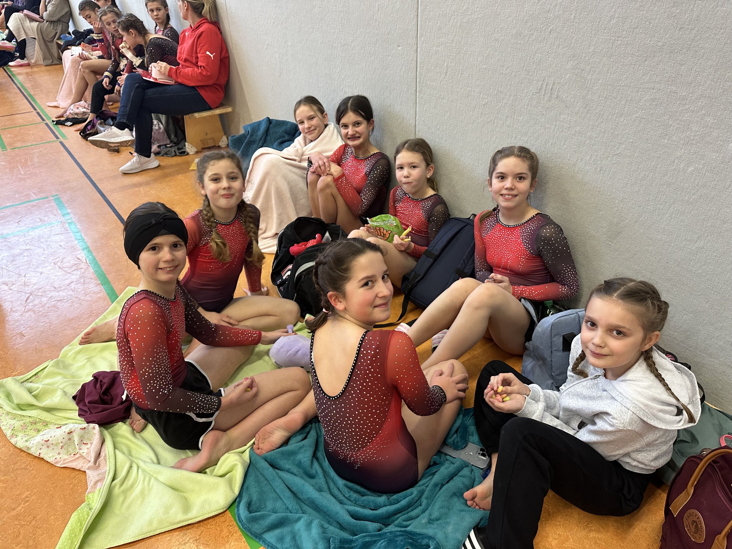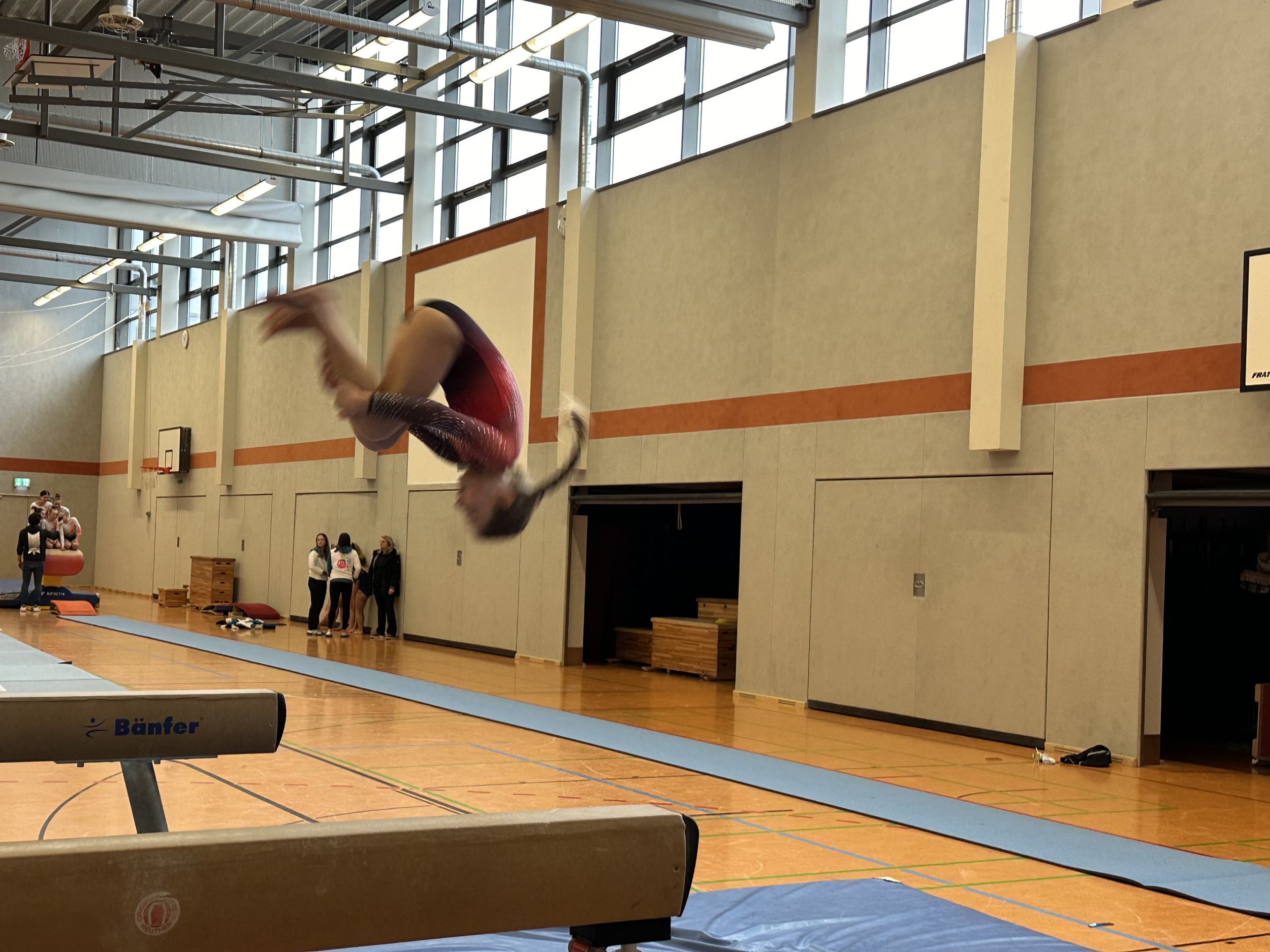 Mit Emily und Frau Zimmermann hatten die Mädchen gute Unterstützung. Die Schülerinnen haben sich alle sehr angestrengt und ihr Bestes gegeben. Leider gab es noch beim Aufwärmen eine kleine Verletzung und die Schülerin aus dem zweiten Team konnte am Wettkampf nicht mehr teilnehmen. Das bedeute für die Mannschaft leider auch, dass nicht bei jedem Gerät genug Mädchen an den Start gehen konnten und dadurch Punkte abgezogen wurden. Außerdem gab es leider ein paar Probleme mit der Musik. Die noch sehr jungen Turnerinnen sind sich aber sicher, dass sie im nächsten Jahr wieder an den Start gehen wollen und sich in der Zwischenzeit verbessern werden. Sie hatten sehr viel Spaß, was auch die guten Leistungen zeigten.