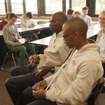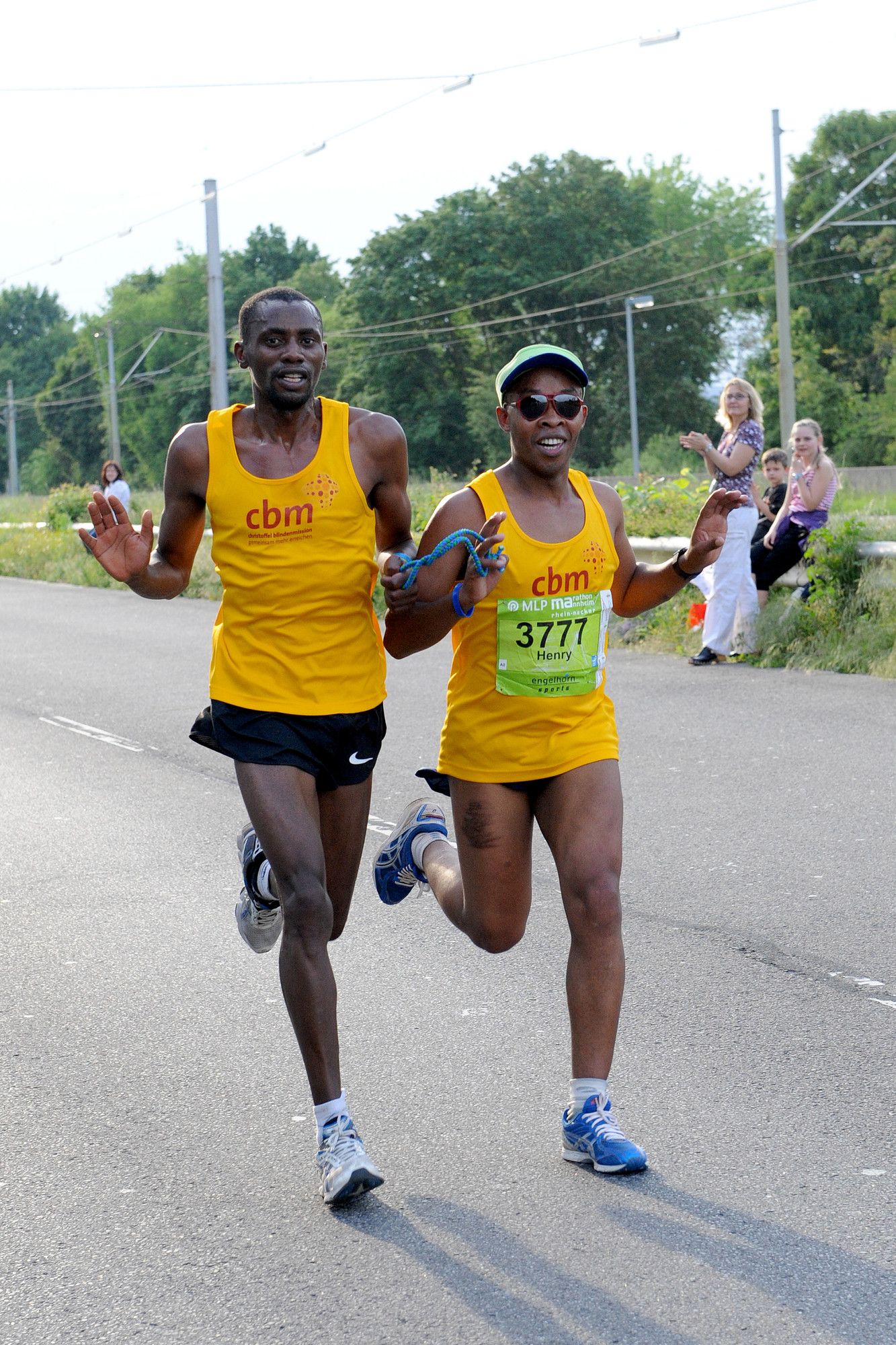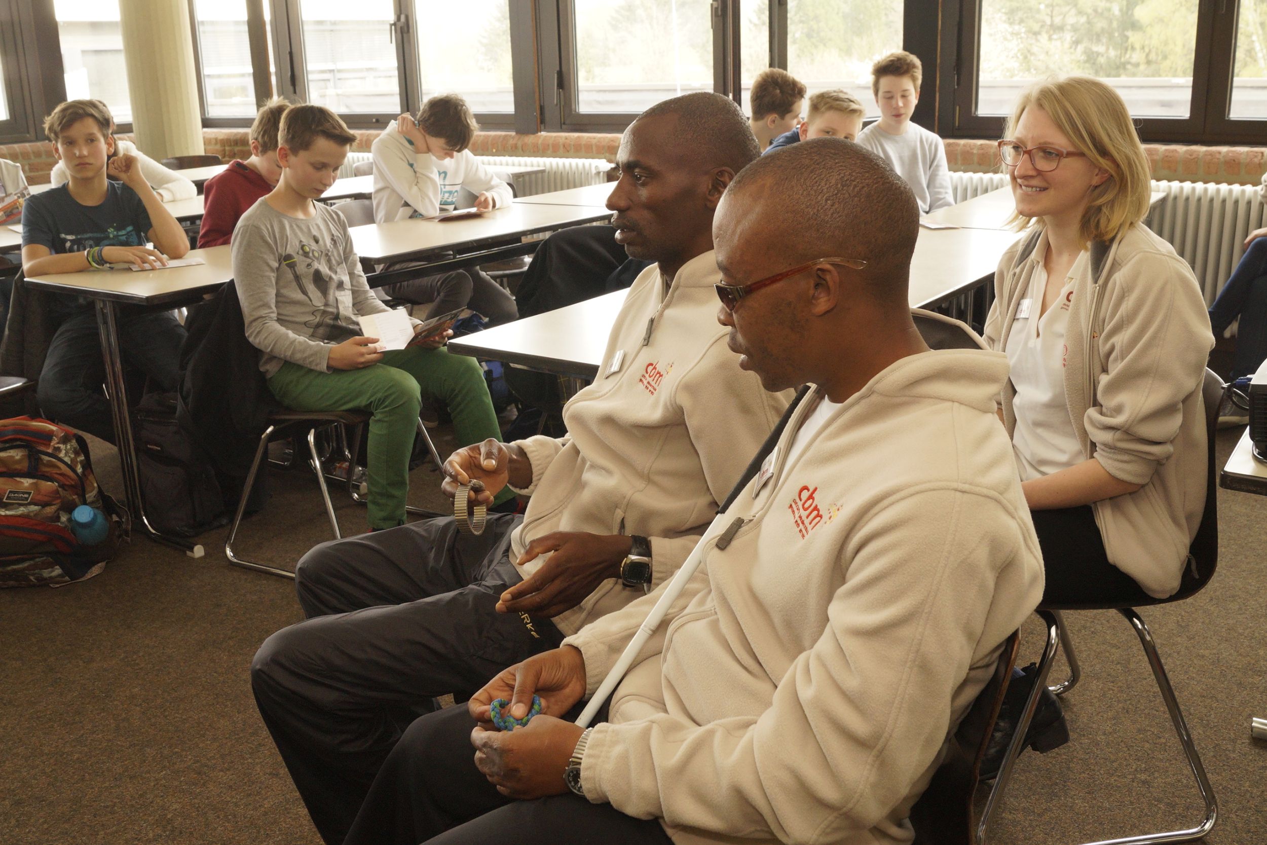 Nach diesem Erlebnis konnten wir uns mit Henry Wanyoike und seinem Begleitläufer und Freund Joseph Kibunja unterhalten. Die beiden Langstreckenläufer kommen aus Kenia. Henry ist nach einem Schlaganfall erblindet, trotzdem gewann er mit Unterstützung der Christoffel Blindenmission bei mehreren Paralympics und stellte über 5 km den Weltrekord auf. Er und Joseph zeigten uns, wie sie durch ein Band verbunden miteinander laufen. Wir durften die beiden alles fragen, was wir wollten, und haben dabei nicht nur Englisch gelernt.
