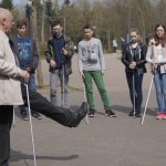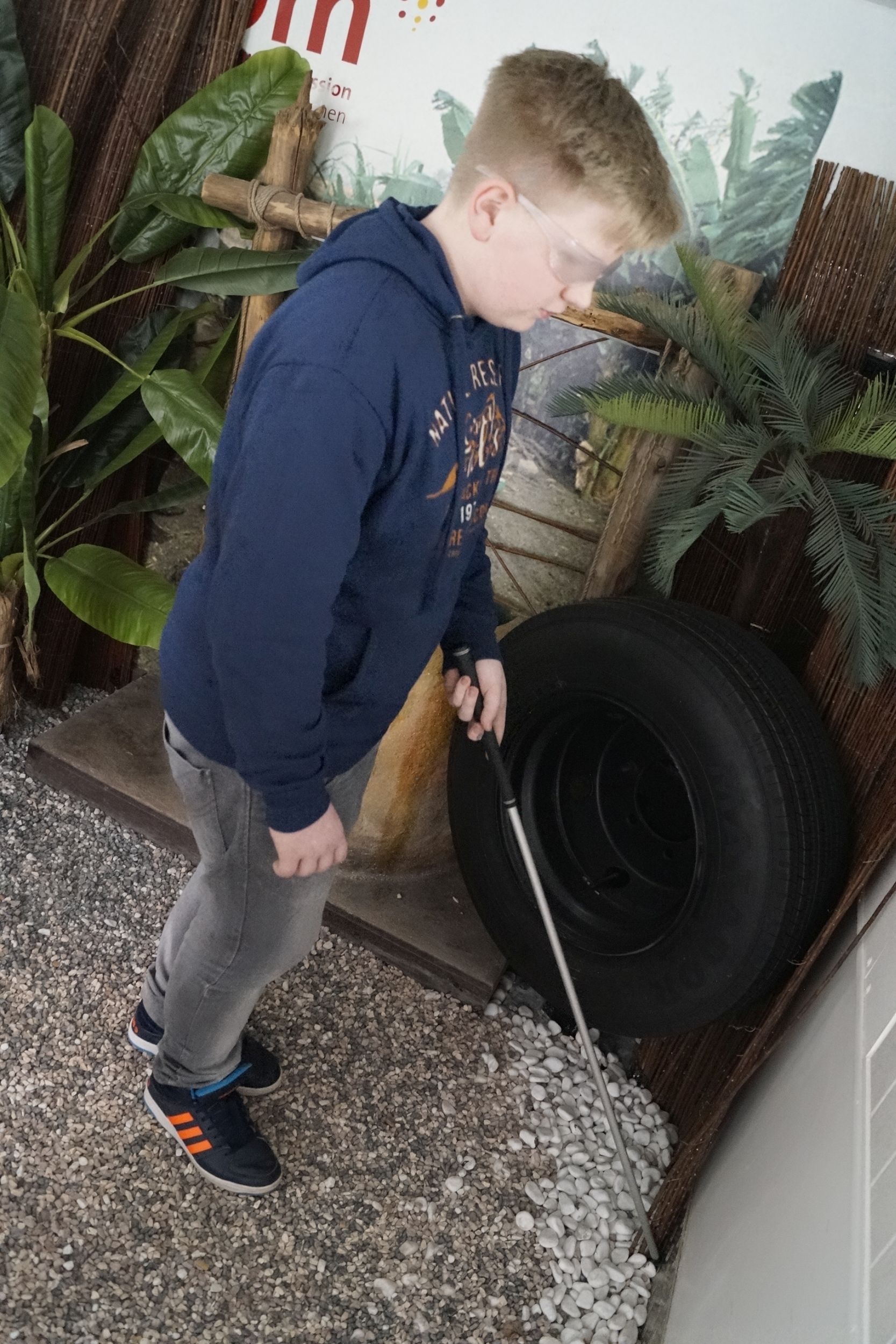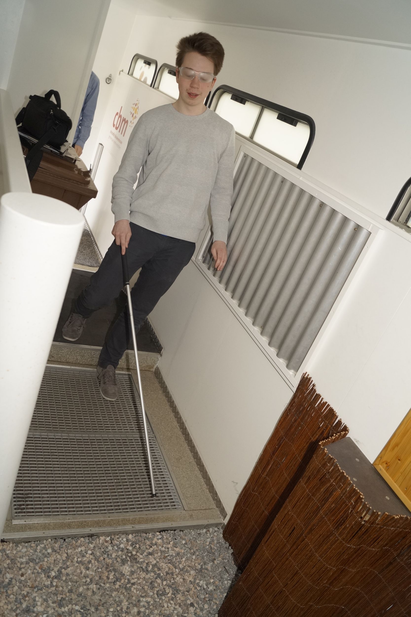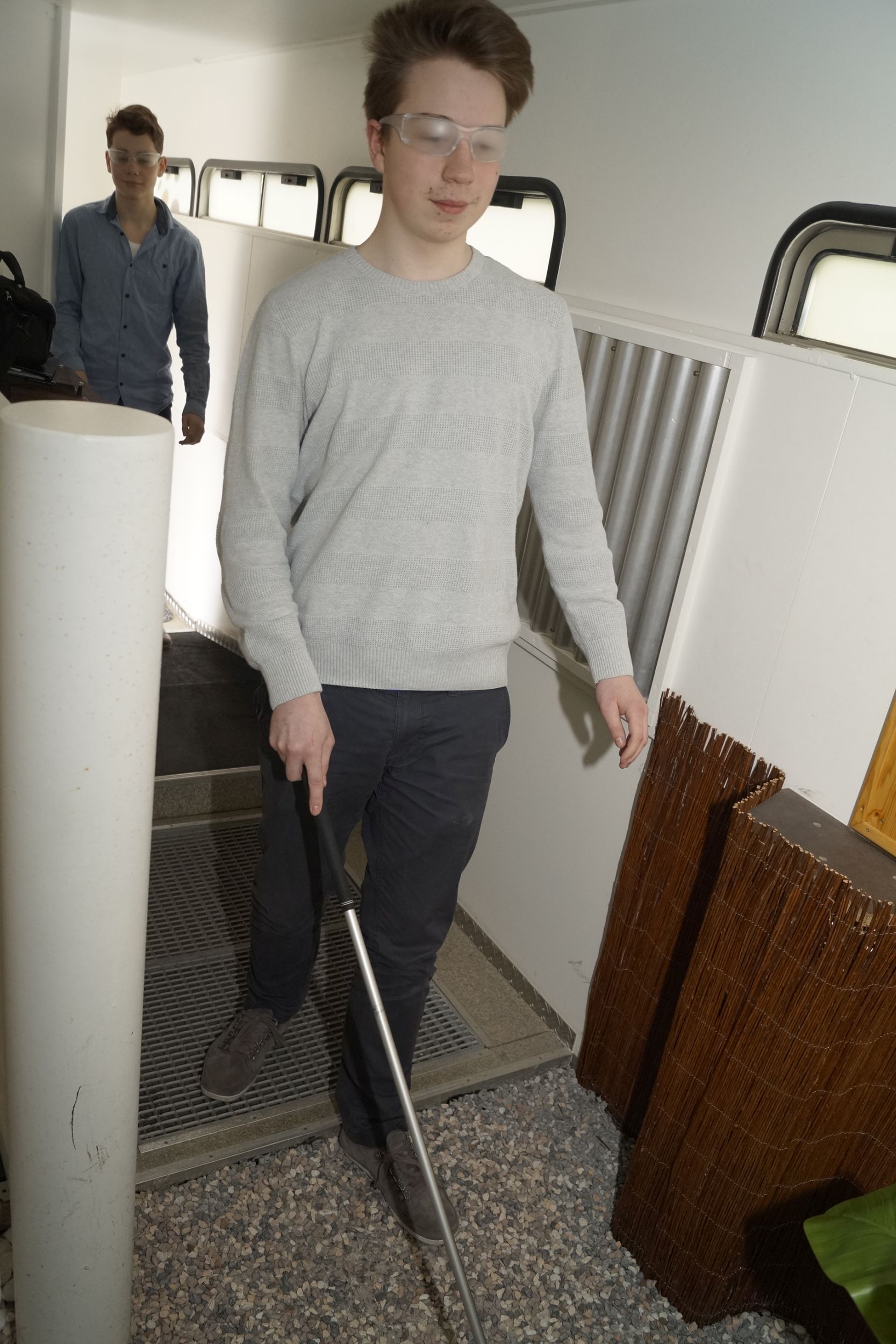 Zu Beginn durften wir durch einen in einem LKW aufgebauten Parcours laufen – und das blind! Nach einer kurzen Erläuterung, wie wir mit dem Blindenstock umzugehen hätten, wurden uns Brillen aufgesetzt, mit denen die Augenerkrankung ,,Grauer Star“ simuliert wurde. Da wir nur hell und dunkel unterscheiden konnten, konnten wir uns schwer vorstellen, wie der Parcours aussah. Nur durch Ertasten fanden wir den Ausgang. Es war ein ganz anderer Eindruck den wir bekamen, als wir sehend hindurch gingen.