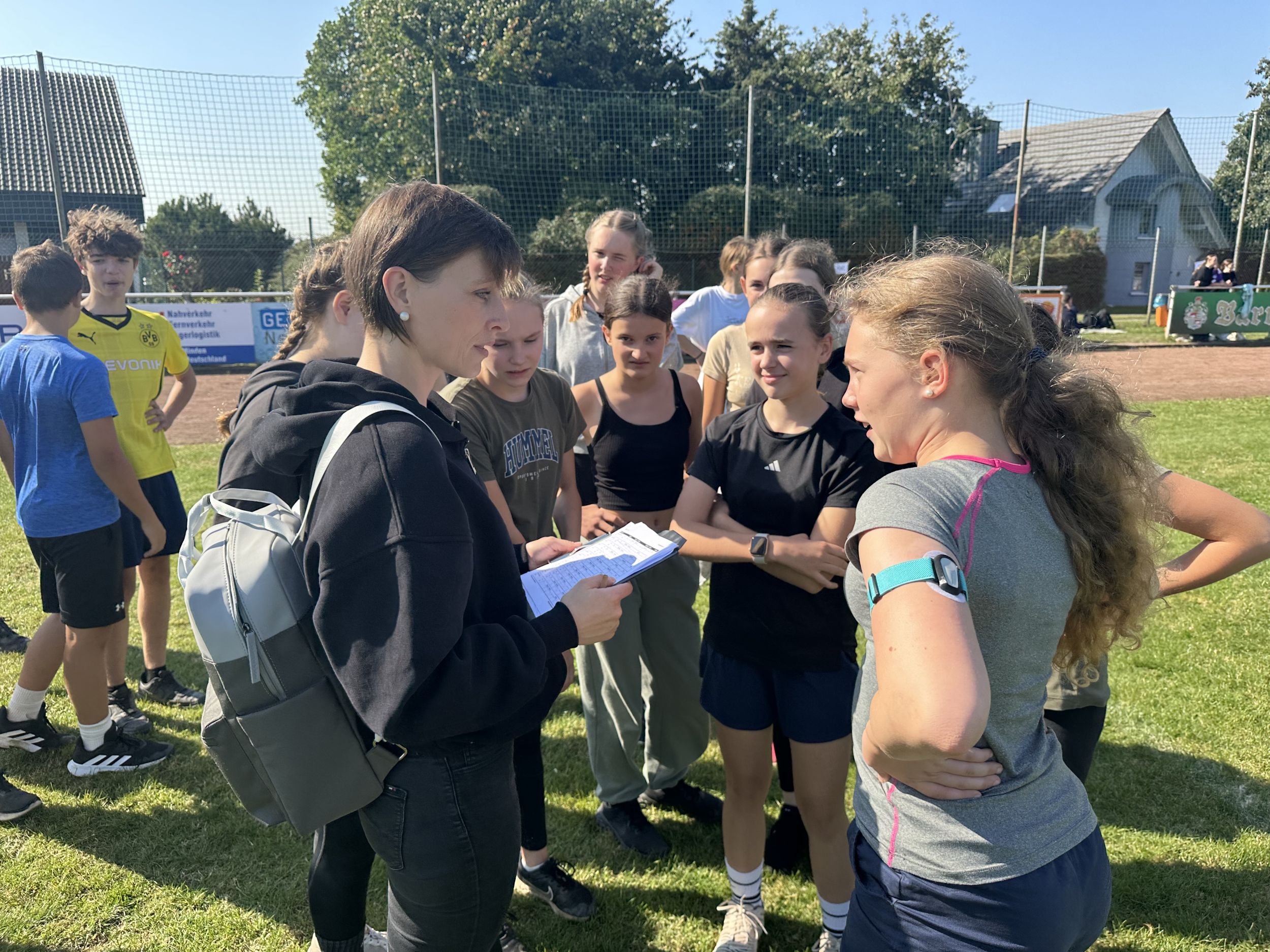 Während die Lehrkräfte und Schülerinnen und Schüler der Q2 die Riegen führten, Lauf-, Sprung- und Wurfstationen betreuten, im Wettkampfbüro alle Ergebnisse verwalteten oder am Grill- und Verlaufsstand für eine gute Atmosphäre sorgten, erzielten die aktiven Schülerinnen und Schüler sportliche Höchstleistungen. In einem leichtathletischen Dreikampf aus einer Lauf-, Sprung und Wurfdisziplin erreichten 525 Teilnehmende insgesamt 267 Teilnahmeurkunden, 197 Siegerurkunden und 61 Ehrenurkunden. Darüber hinaus wurden 32 Schulrekorde verbessert. Nach den abschließenden Ausdauerläufen, bei denen die Läuferinnen und Läufer von der gesamten Schule lautstark angefeuert wurden, wurden die 16 Besten ihrer Altersstufe geehrt.