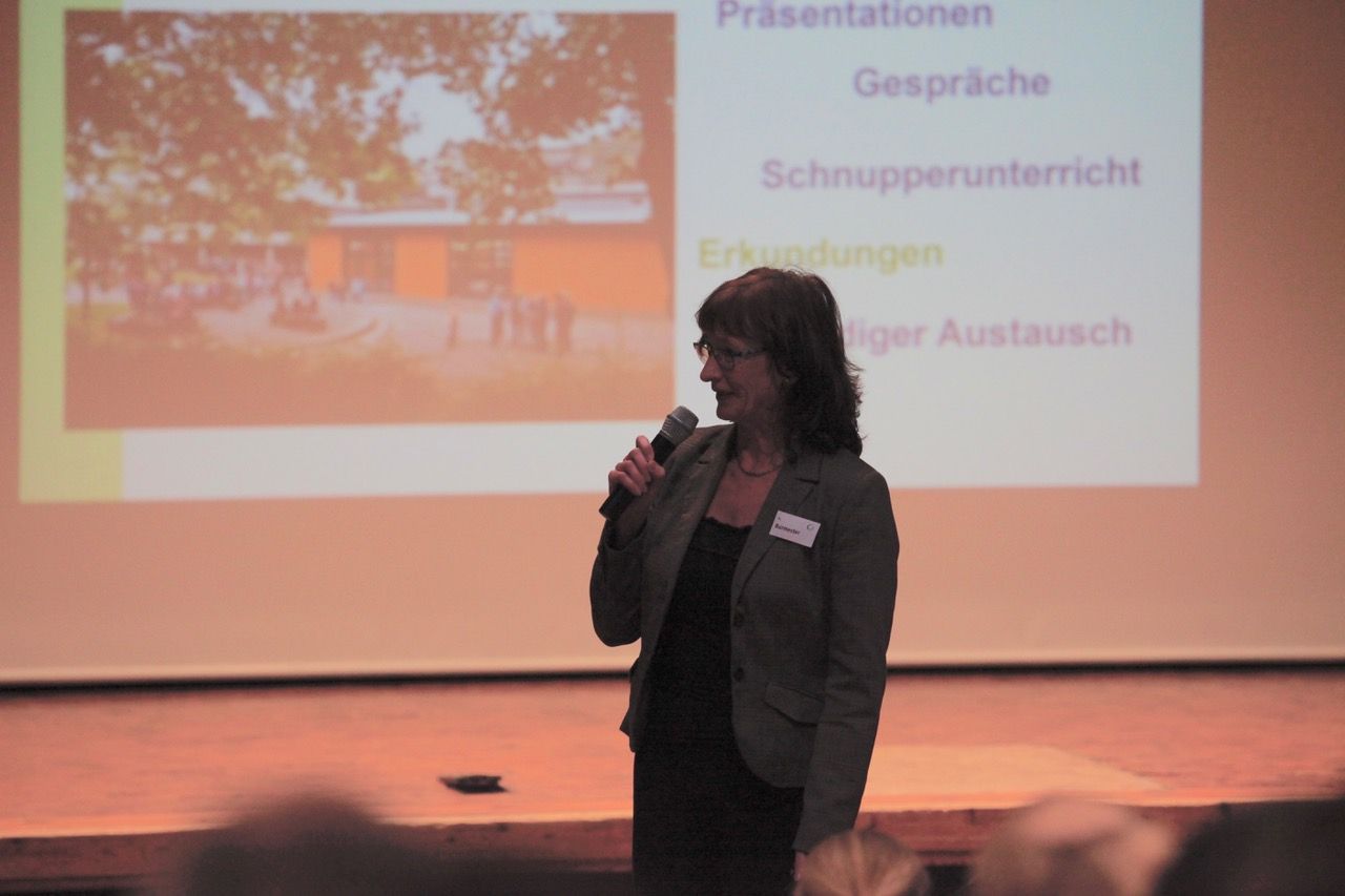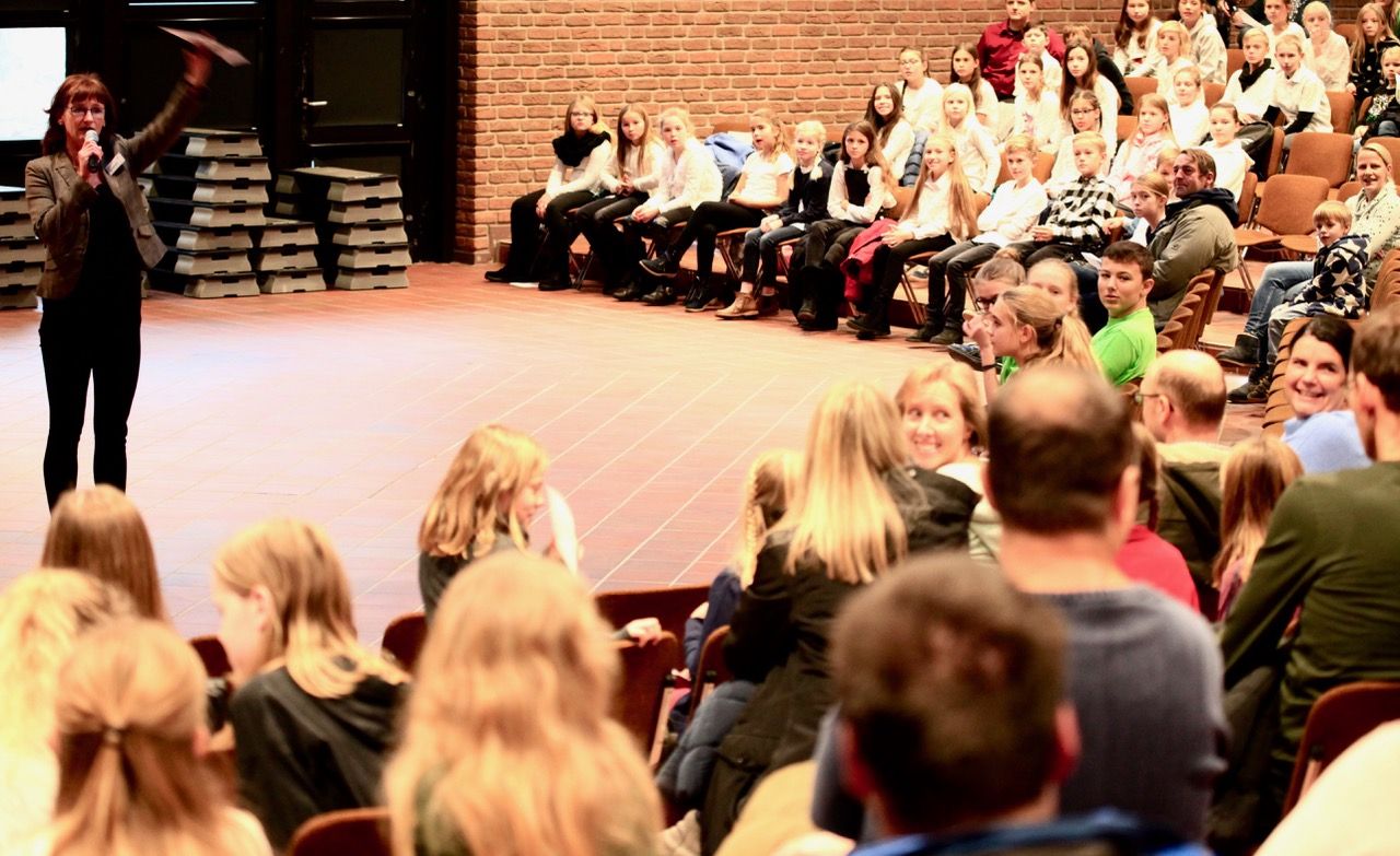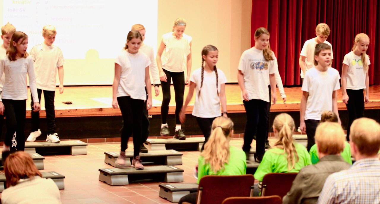 Mit viel Elan begann danach um 9.15 Uhr im Forum die allgemeine Begrüßungsveranstaltung mit dem Auftritt der Chor-AG „Fresh“, welche mit dem Lied „Lasst uns Freunde sein“ den Viertklässlern die Freundschaft anbot. Daran schloss sich – nach einer herzlichen Begrüßung durch die Schulleiterin Susanne Burmester – ein choreographisch kreativer Stepaerobikbeitrag der 6b an.