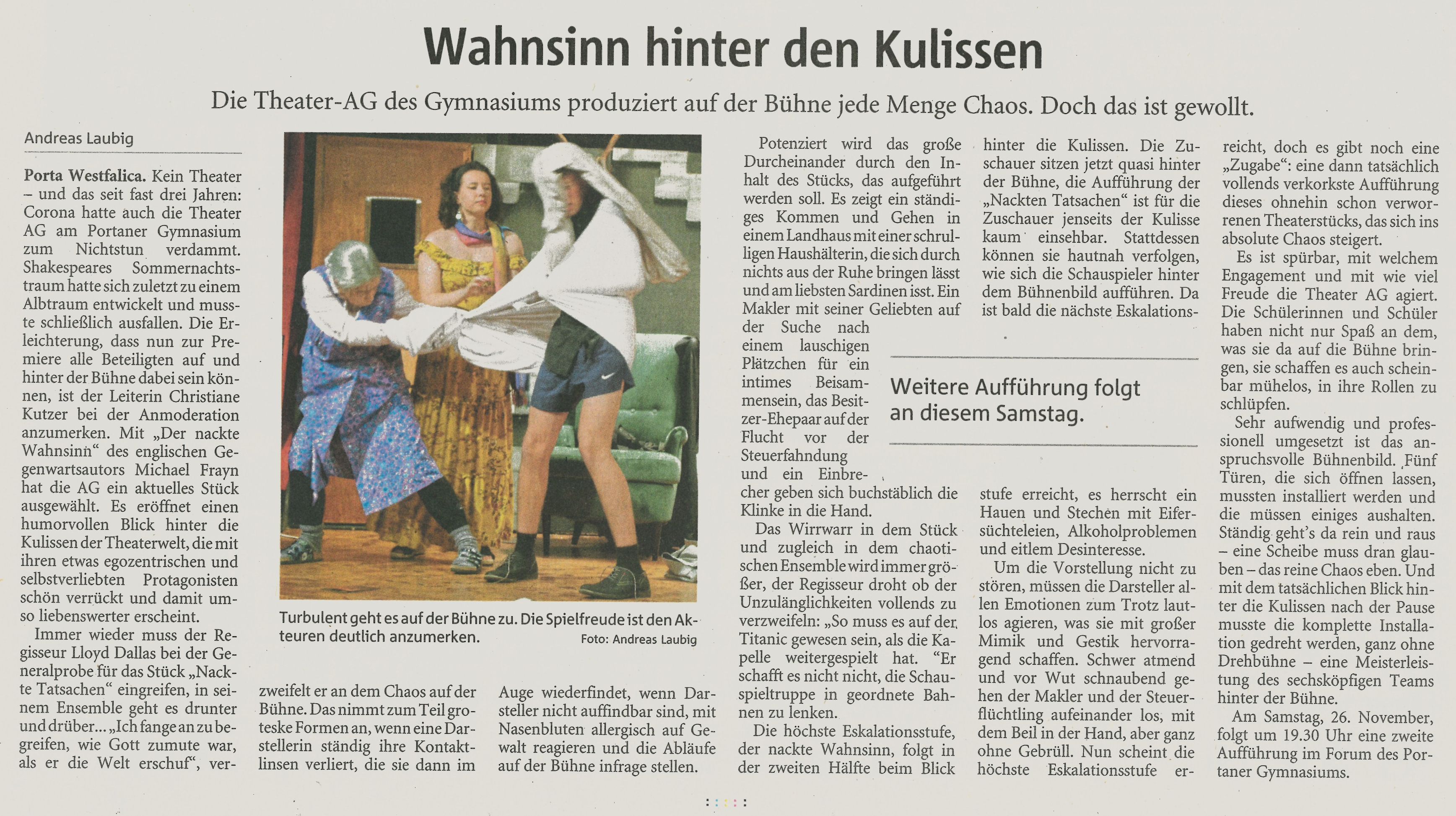 Die Theater-AG hat seit langer Pandemie-Pause wieder ein Stück aufführen können. Voller Vorfreude kündigten wir die Aufführungen hier an. Nun sind die Aufführungen gelaufen und Publikum und Mitwirkende sind sehr zufrieden – auch das Mindener Tageblatt: Lesen Sie den Bericht hier.