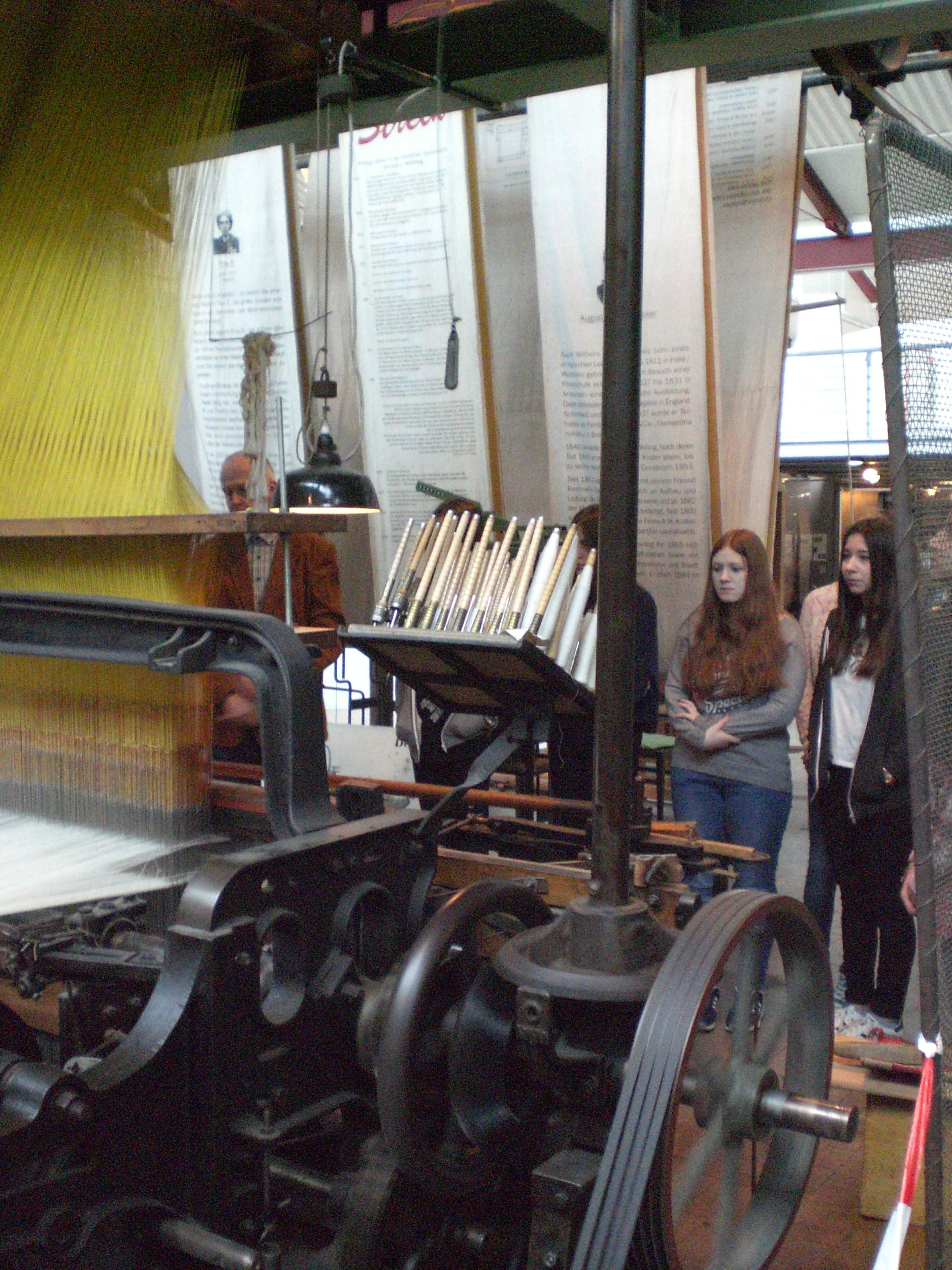 Zunächst bekamen wir einen Einblick in die Stadt Bielefeld mit einem 80 qm großen Luftbild der Stadt in der Jetztzeit. Danach ging es weiter in die Epoche der Industrialisierung mit den Veränderungen der Arbeitswelt und der Lebensumstände für die Menschen in der Region. Wir sahen eindrucksvolle Maschinen und historische Produkte der wichtigsten Industriezweige – Spinnerei, Weberei, Wäscheproduktion, Maschinenbau, Nähmaschinen- und Zweiradindustrie. Am besten hat uns die Maschinenvorführung (Spinnmaschine und Webstuhl) gefallen, weil man sich gut in die Situation der jungen Arbeiter hineinversetzen konnte und die Komplexität der Maschinen erleben konnte. Die Lautstärke, die in einer solchen Fabrik geherrscht haben muss, konnten wir uns so ebenfalls gut vorstellen. Schon ein einziger Webstuhl war so laut, dass man sich nicht mehr verstehen konnte.