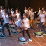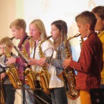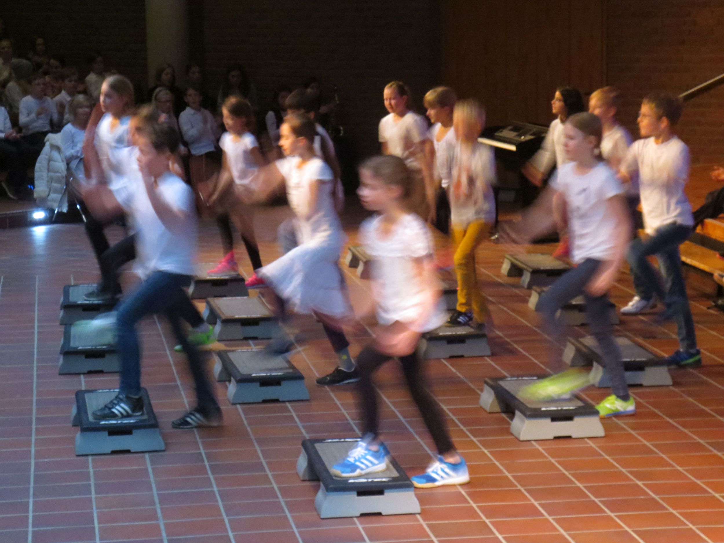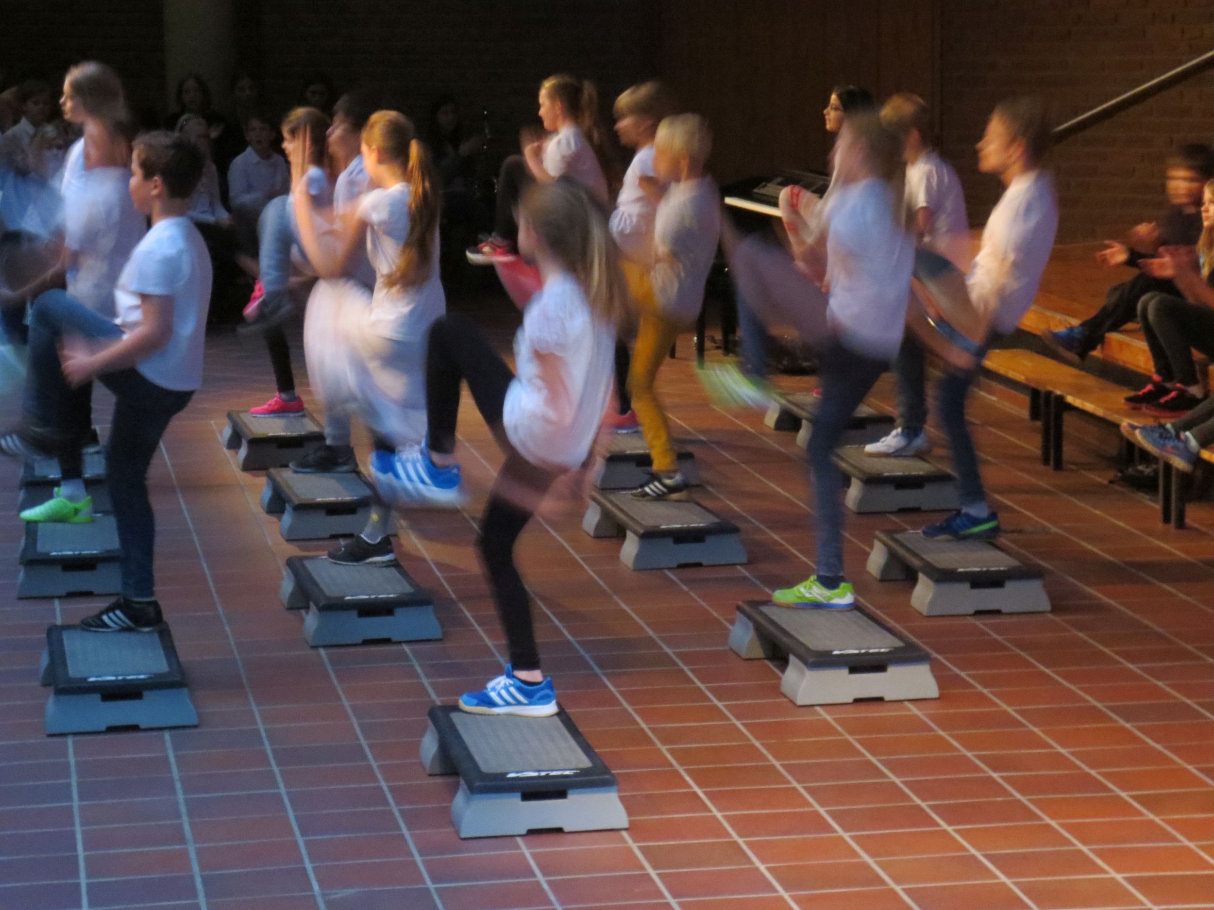 Zur Orientierung bekamen die kleinen Besucher einen Flyer ausgeteilt, mit welchem sie Stempel sammeln konnten. Sie nahmen mit ihren Eltern im Forum Platz, um ab 9.15 Uhr an der allgemeinen Begrüßungsveranstaltung teilzunehmen, welche ebenfalls musikalisch mit dem Auftritt der Chor-AG „Fresh“ begann. Nach den zugewandten Begrüßungsworten der Schulleiterin Susanne Burmester ging es im Forum sportlich zu. Die Klasse 5A präsentierte eine Kombination aus Aerobik und Step-Aerobik, welche für beschwingte und lockere Atmosphäre sorgte. Nachdem die Schulleiterin den Ablauf und die Angebote des Vormittags vorgestellt hatte, wurden die Gäste musikalisch mit den Instrumentalgruppen der Blech- und Holzbläser in die erste Etappe des Schnupperunterrichtes „hinausgeschmissen“.