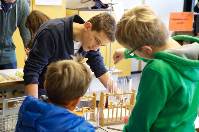 Ihre Eltern hatten die Möglichkeit, sich bei Kaffee, Kuchen oder einer Waffel in der Schulstraße gemütlich zusammenzusetzen, zu unterhalten, sich eingehend zu informieren oder eine Führung durch das Gebäude der Schule zu machen. Mitarbeiter der VHS und zahlreiche Lehrkräfte standen den Eltern jederzeit zur Verfügung. Aber auch Schülerinnen und Schüler kamen als Informanten und Helfer zum Einsatz, indem die „Schulspatzen“ den Gästen halfen, den Schnupperunterricht zu finden oder die Pfadfinder (ausgestattet mit grünen T-Shirts) jederzeit zur Stelle waren, falls sich jemand verirrt hatte.