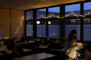„Und jetzt ist die 8A auch noch verschwunden“, wunderte sich Klassenlehrer Jan Voß am 1. Dezember vor der ersten Stunde, als er bemerkte, dass der Klassenraum dunkel und leise war. Die Überraschung war umso größer, als seine Schüler/innen sehr wohl im Raum waren und es sich mal so richtig weihnachtlich gemütlich gemacht hatten.