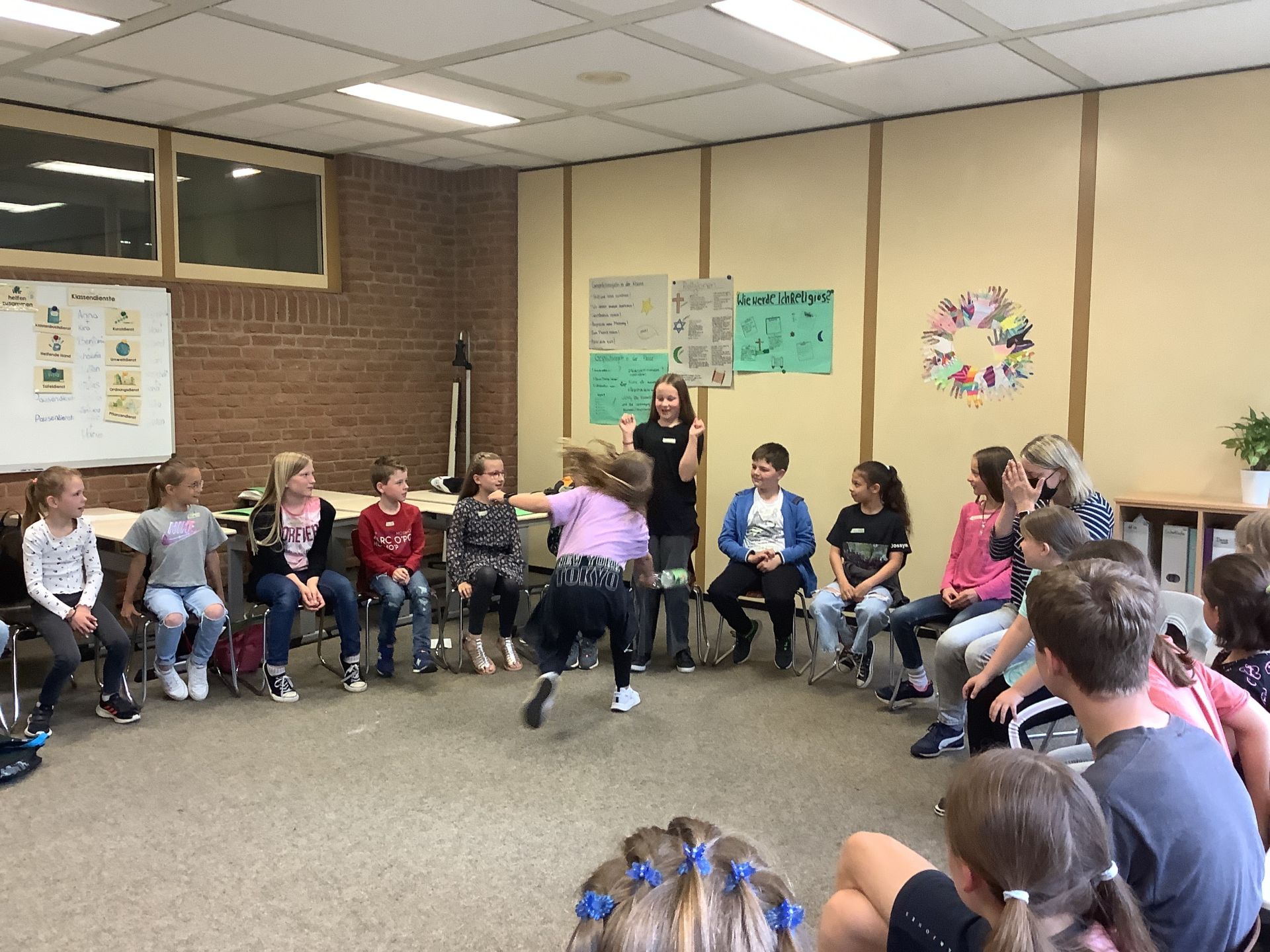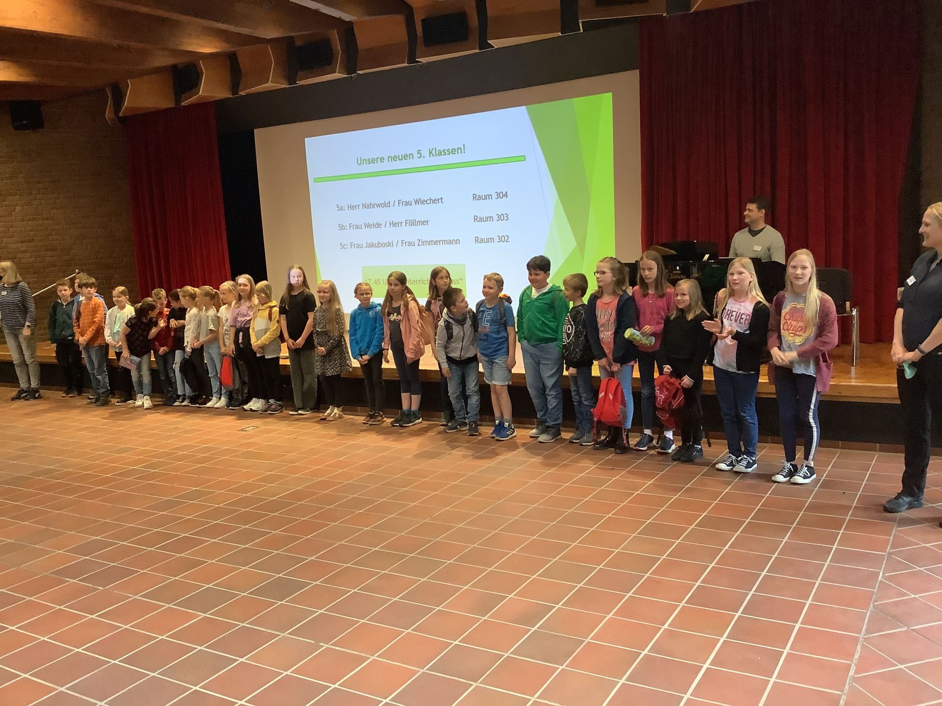 Nach einer sportlichen und musikalischen Begrüßung durch einige unsere Fünftklässlerinnen und Fünftklässler und den einführenden Worten der Schulleiterin Susanne Burmester lernten unsere zukünftigen Schülerinnen und Schüler nicht nur ihre Klassenlehrerinnen und -lehrer und die Paten der SV, sondern auch ihre zukünftigen Mitschülerinnen und Mitschüler kennen. Sehr bald verließen dann die zukünftigen Klassen 5A, 5B und 5C das Forum und verbrachten gemeinsame Zeit bei Spiel und Spaß in den neuen Klassenräumen.