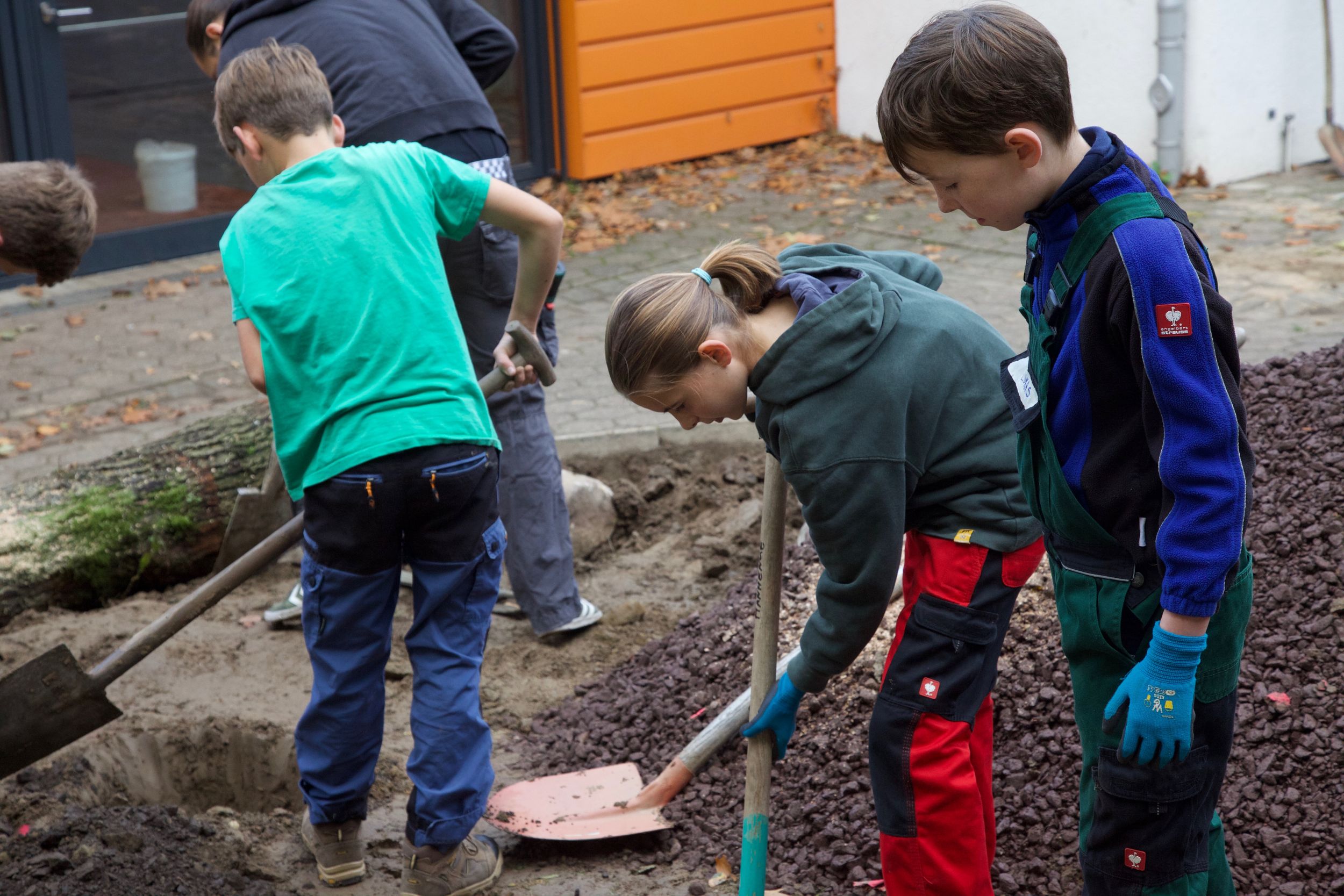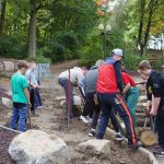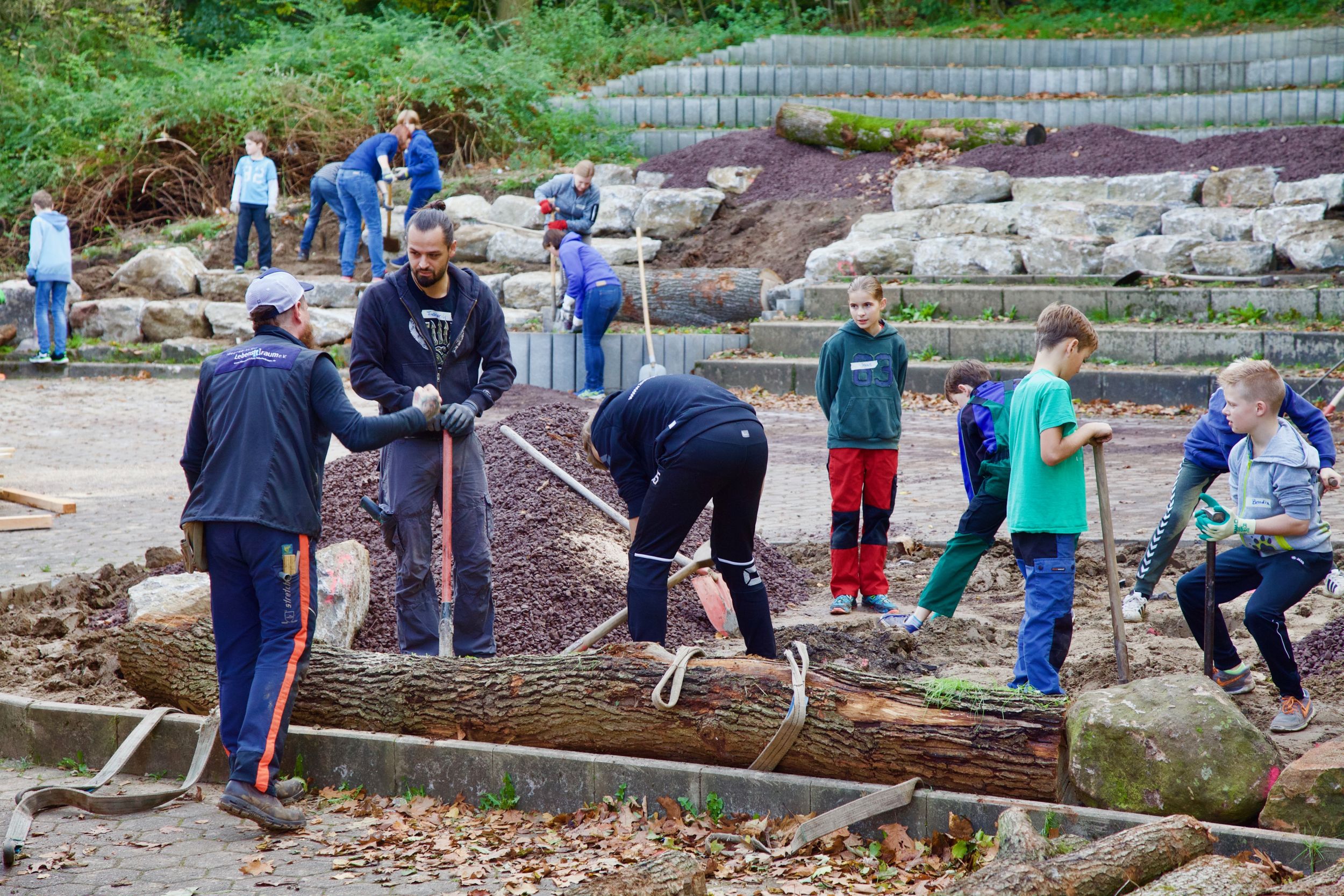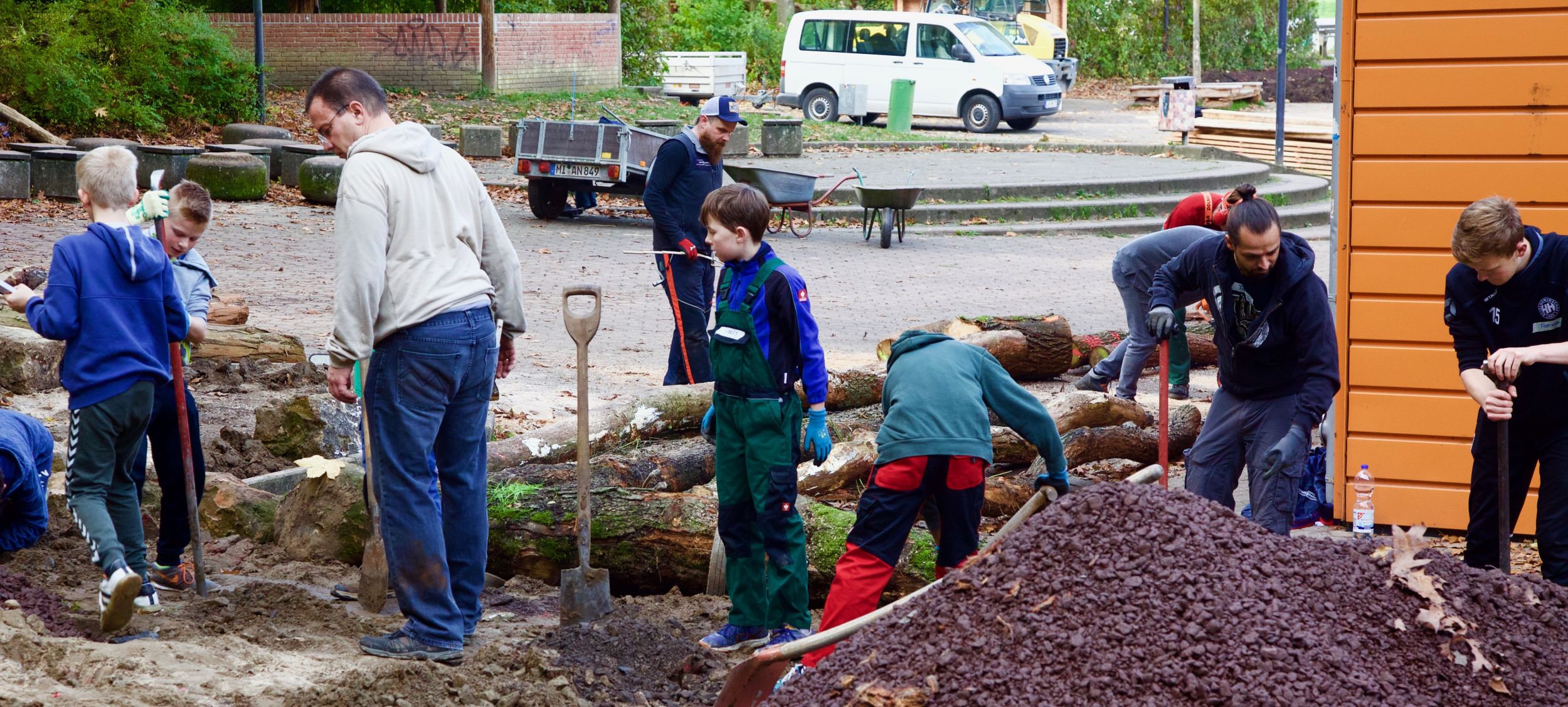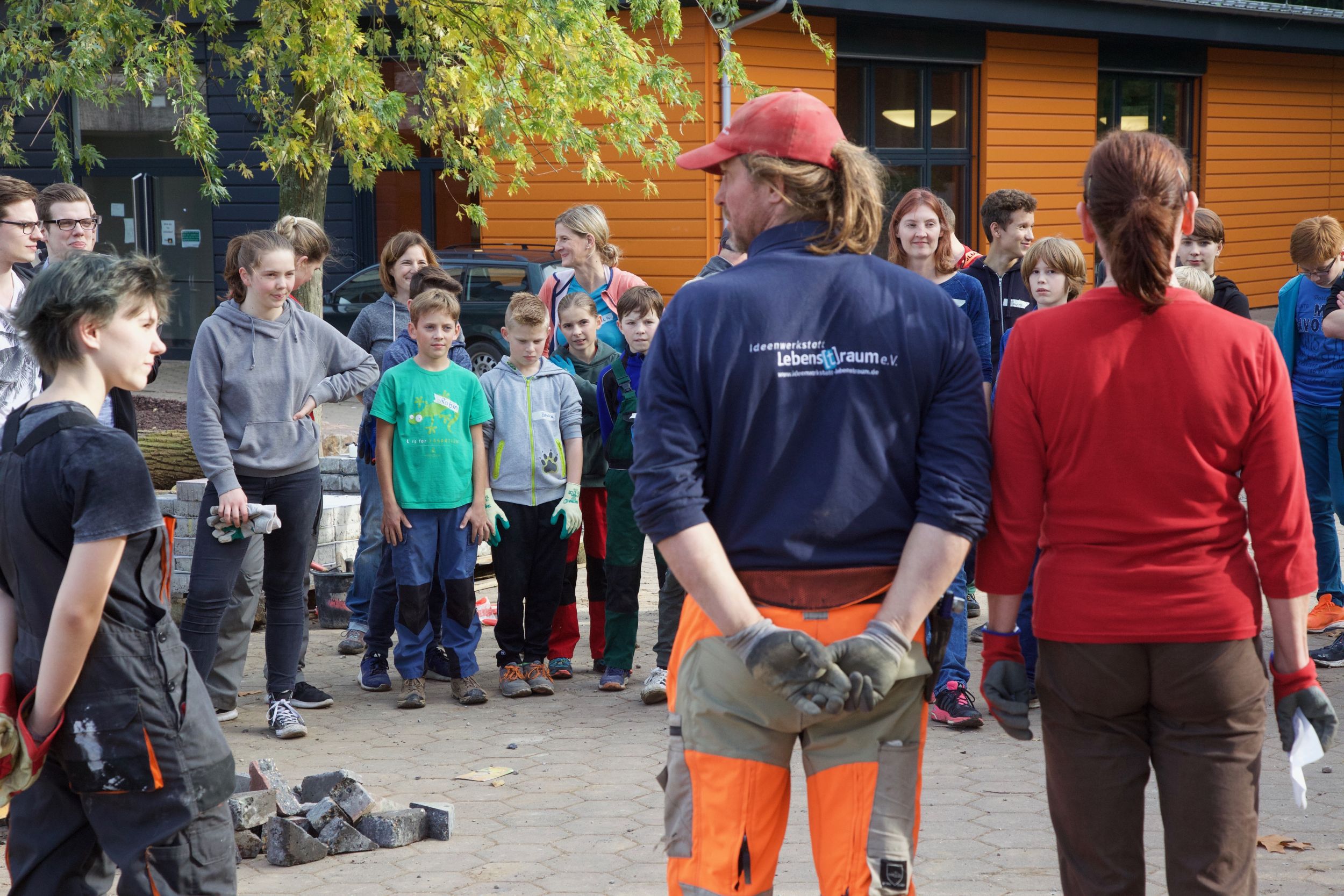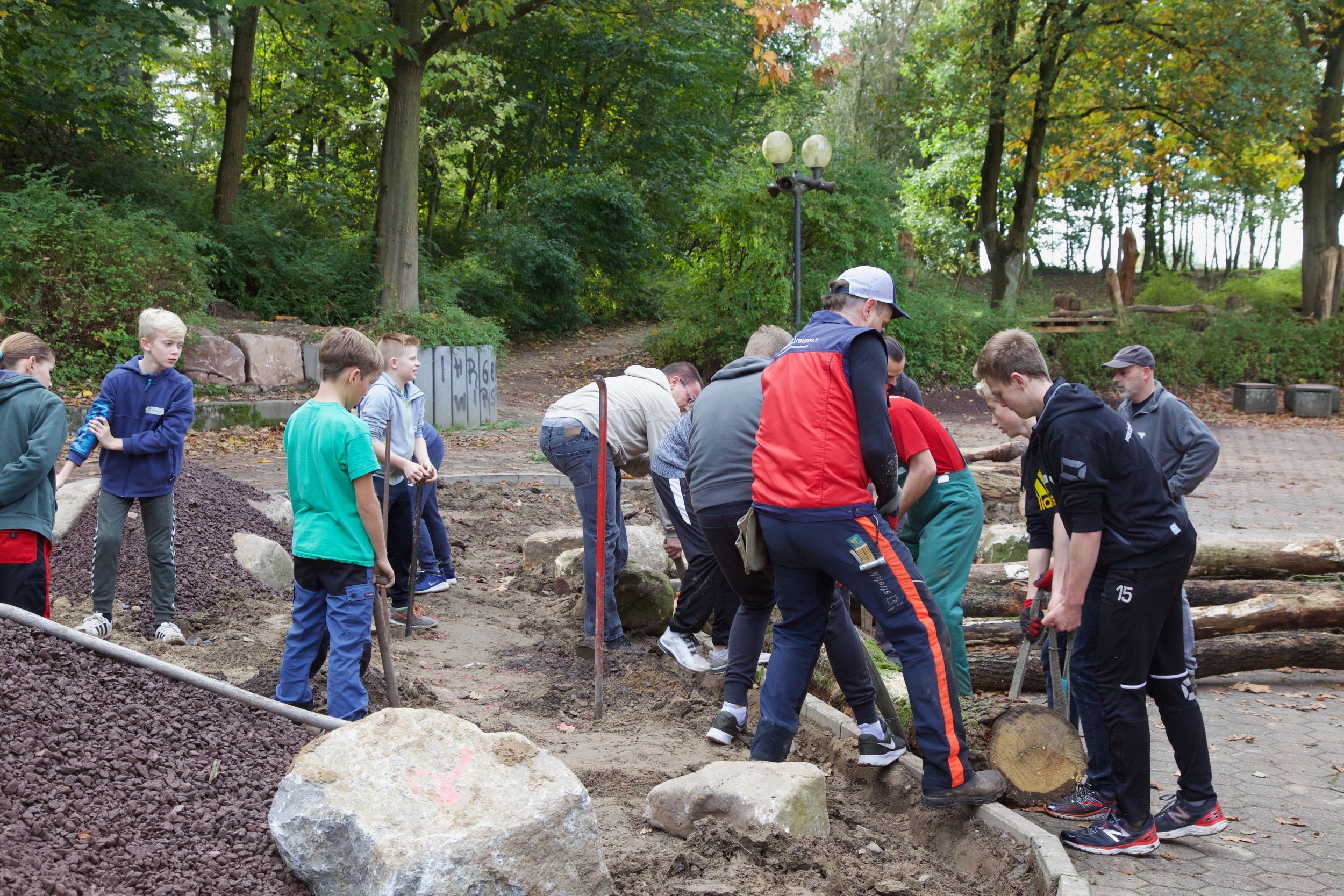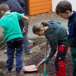 Der neu gestaltete Schulhof nimmt Formen an. Schüler, Eltern und Lehrer buddelten für Pflasterwege und schufen Sitzgelegenheiten bei der Mitmachaktion am 13. und 14. Oktober 2017.