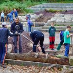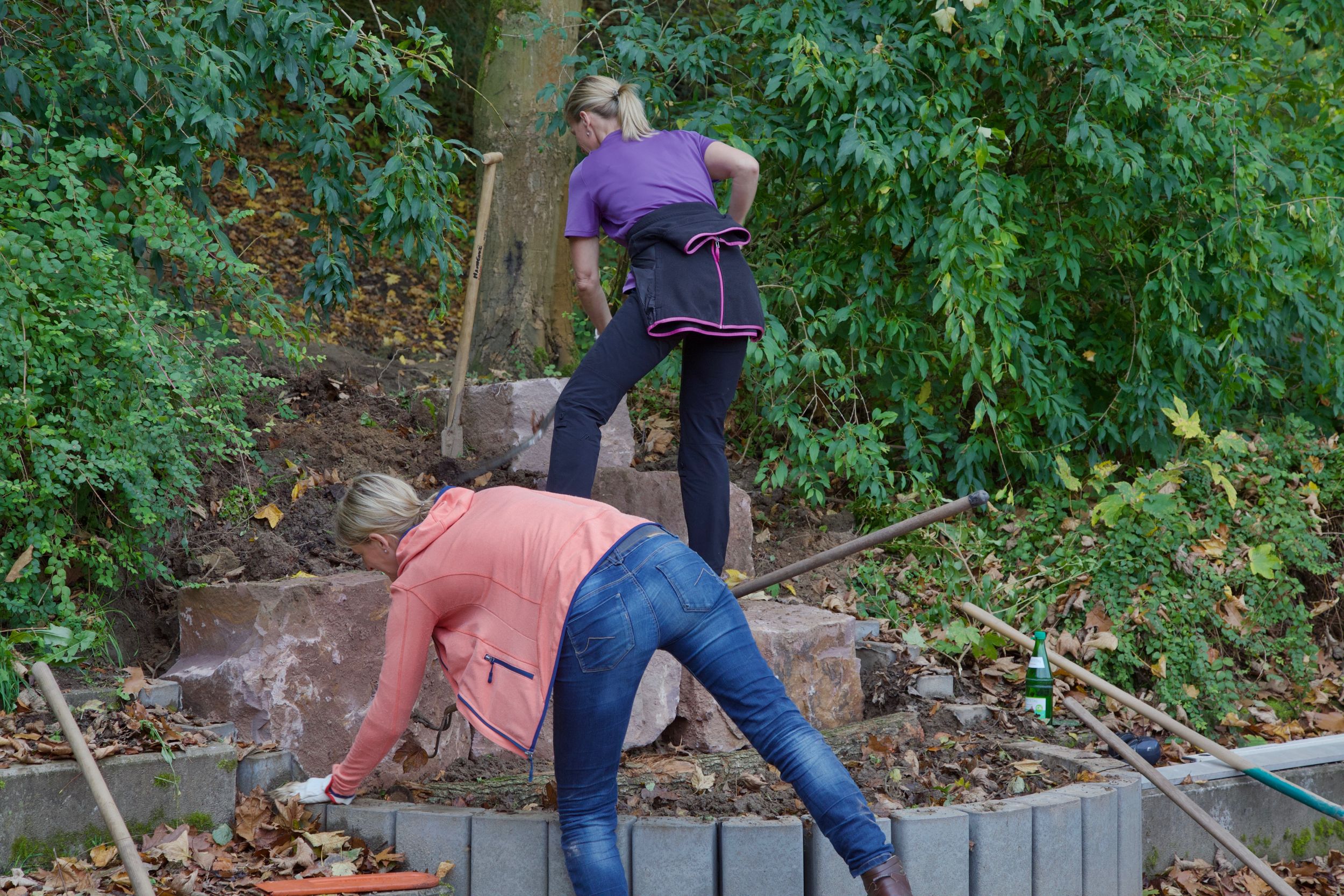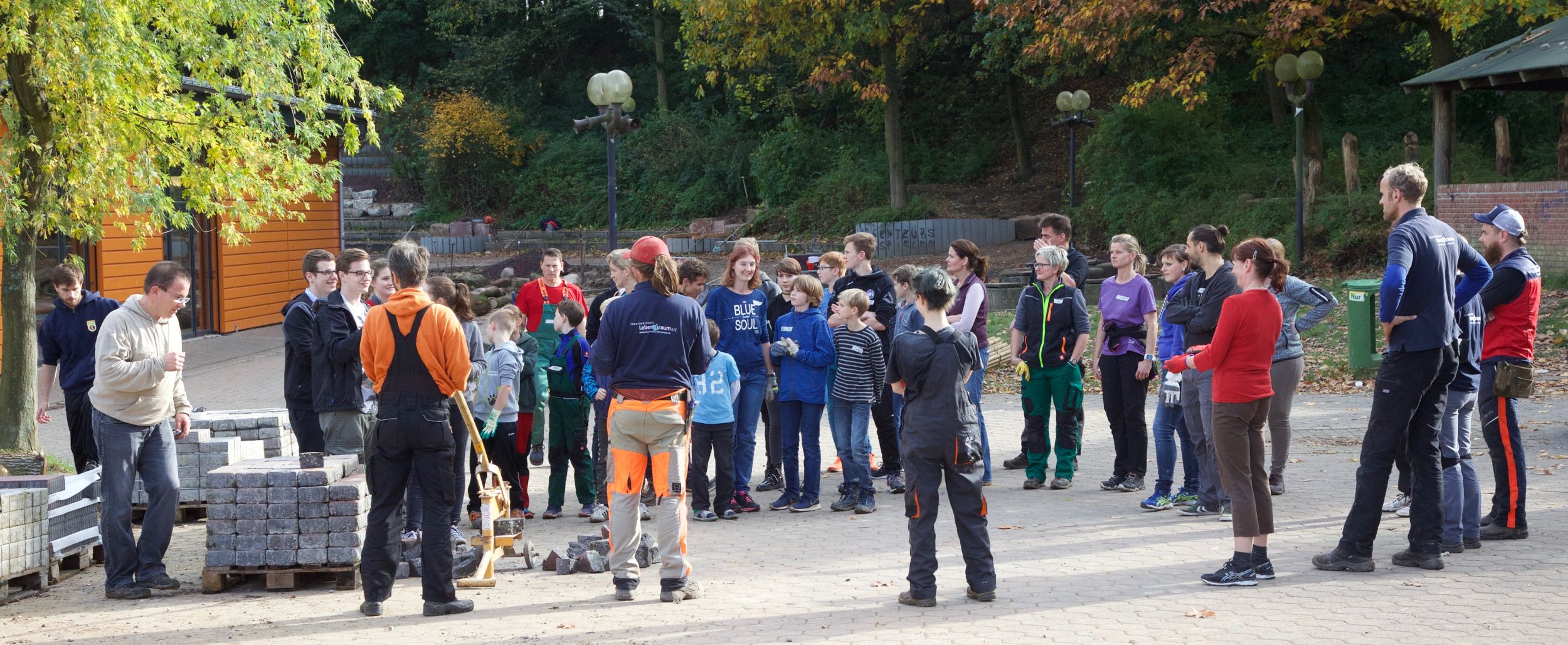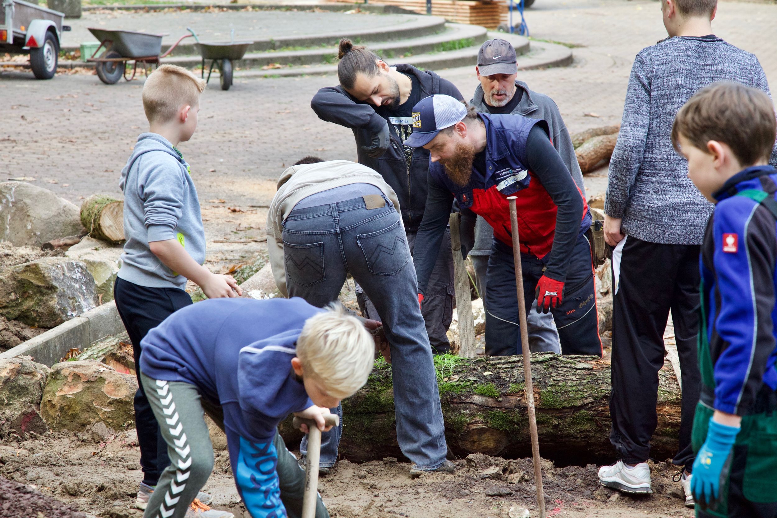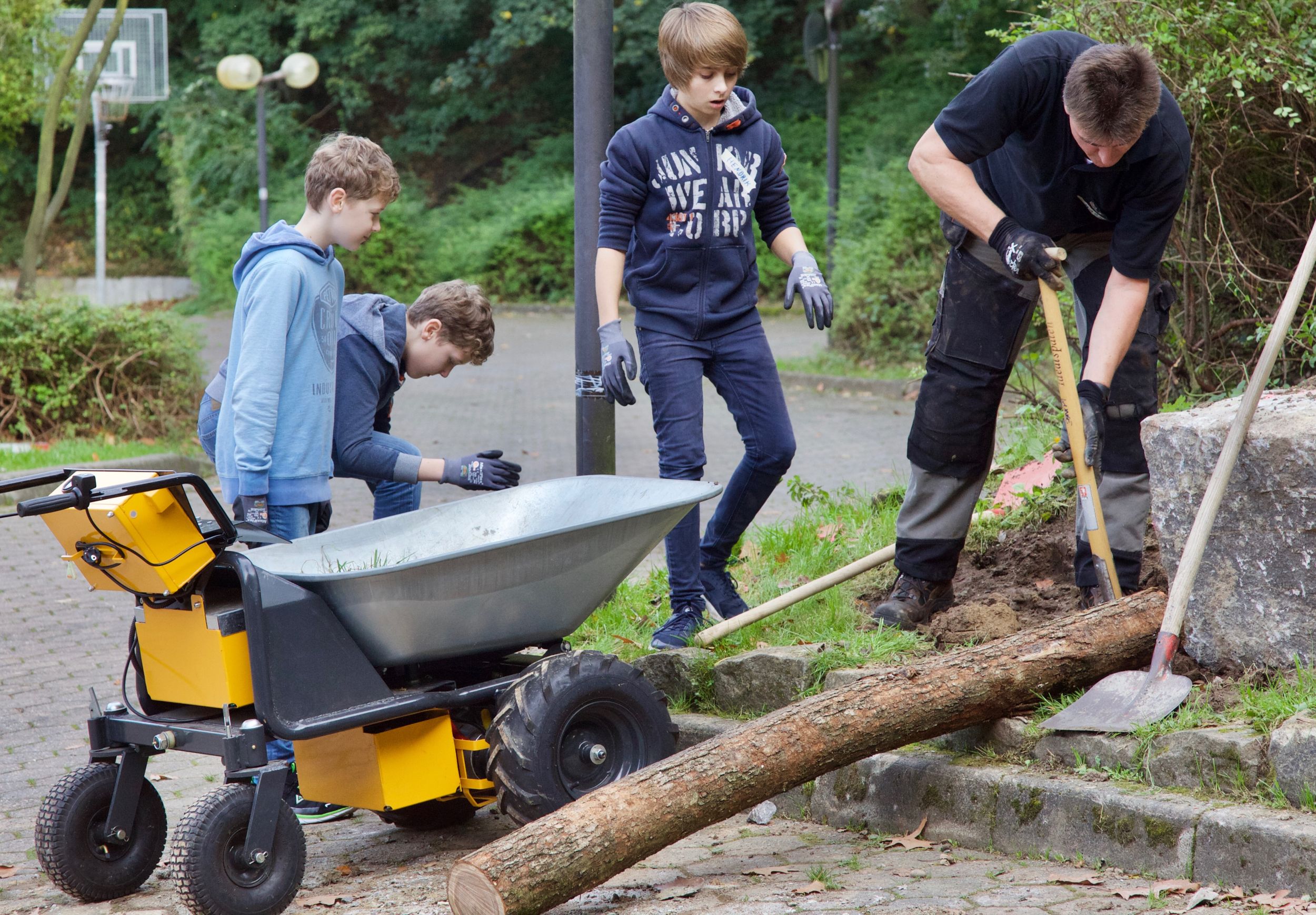 Der neu gestaltete Schulhof nimmt Formen an. Schüler, Eltern und Lehrer buddelten für Pflasterwege und schufen Sitzgelegenheiten bei der Mitmachaktion am 13. und 14. Oktober 2017.