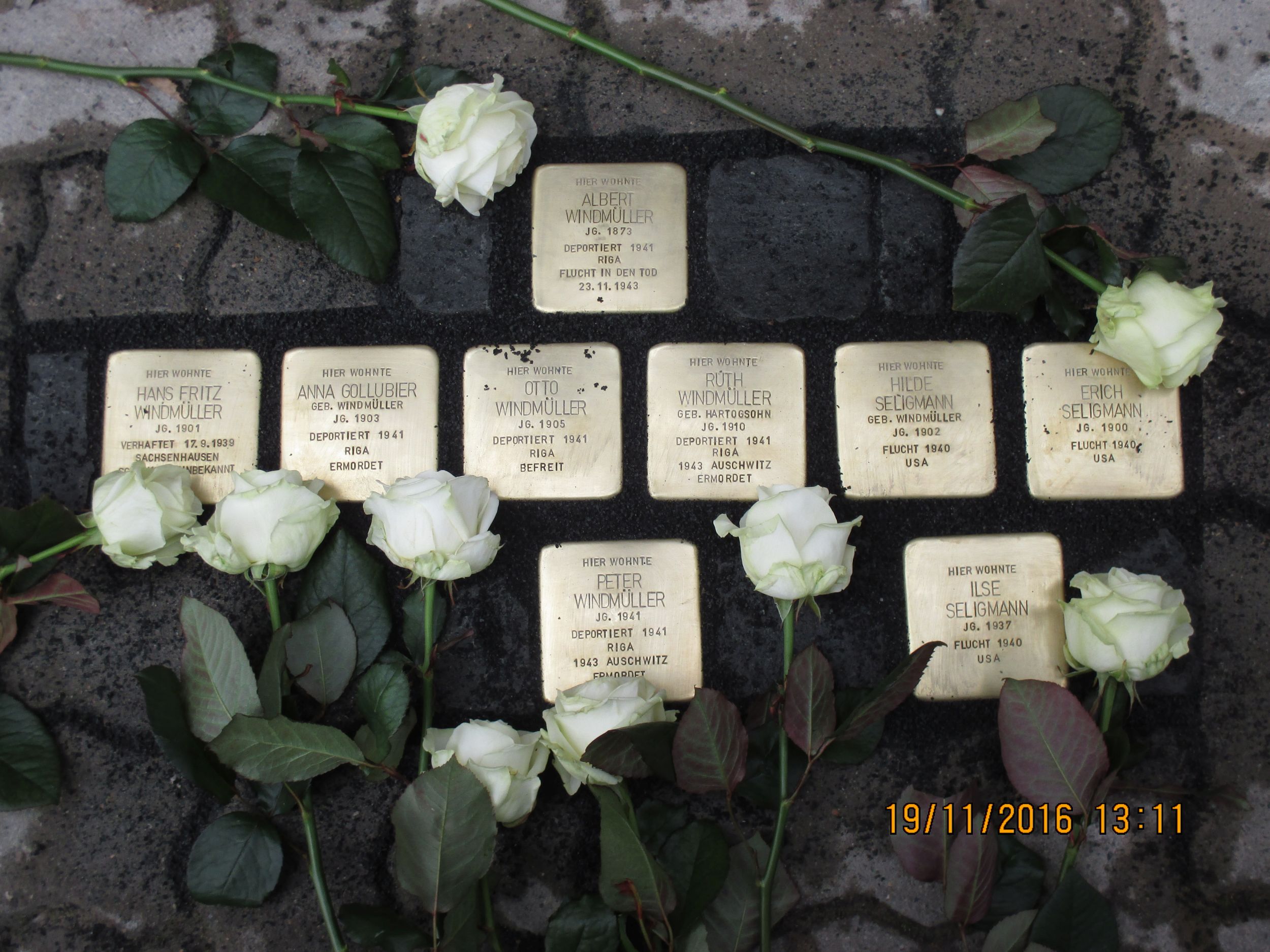 Die Stolpersteine für die Familie Windmüller (Albert Windmüller, Hans Fritz Windmüller, Hilde Seligmann geb. Windmüller, Erich Seligmann, Ilse Seligmann, Anna Gollubier geb. Windmüller, Ewald Gollubier, Peter Windmüller, Otto Windmüller und Ruth Windmüller geb. Hartogsohn) wurden vor dem Haus mit der Hausummer 80 an der Hauptstraße in Hausberge verlegt. Abschließend legten die Schüler und Schülerinnen des Gymnasiums, der Realschule und der Gesamtschule zum Gedenken an die Familie neun weiße Rosen nieder.