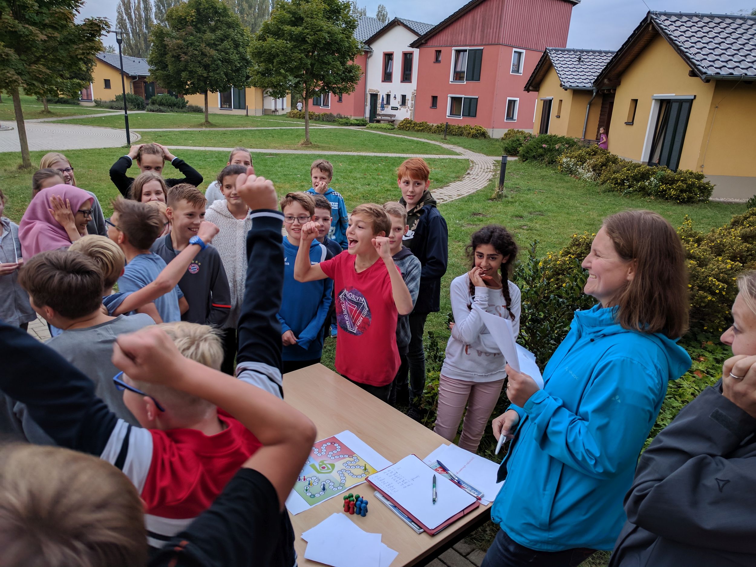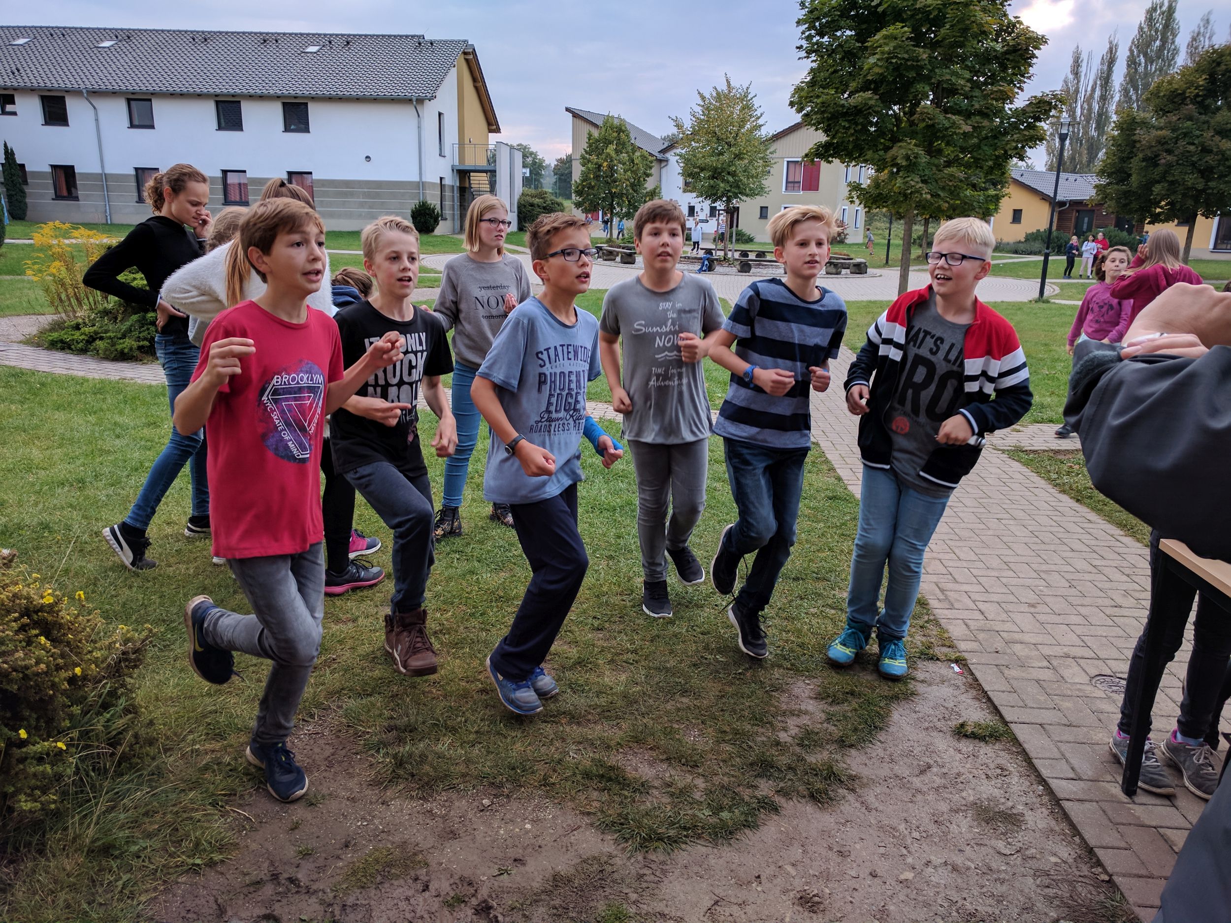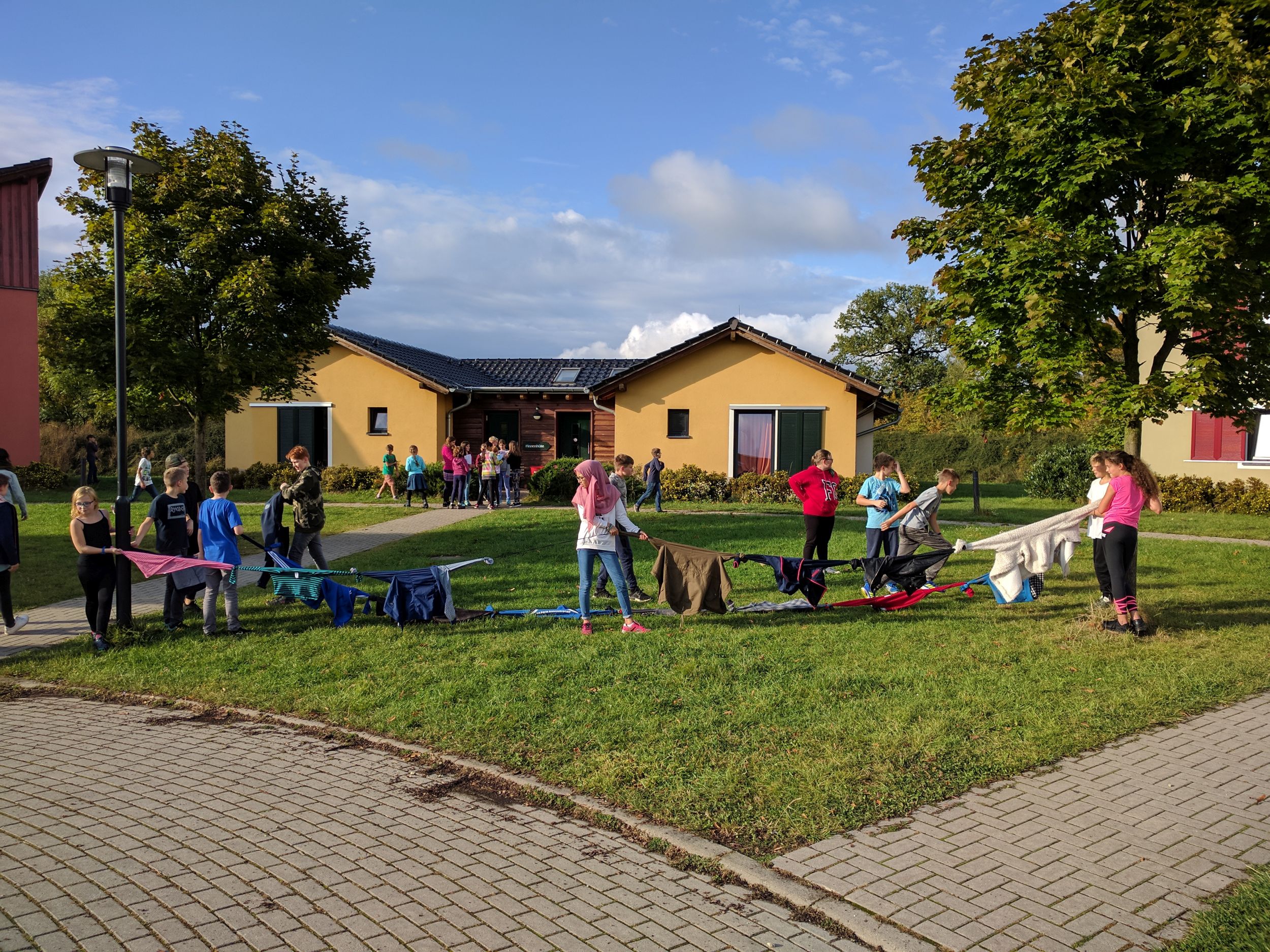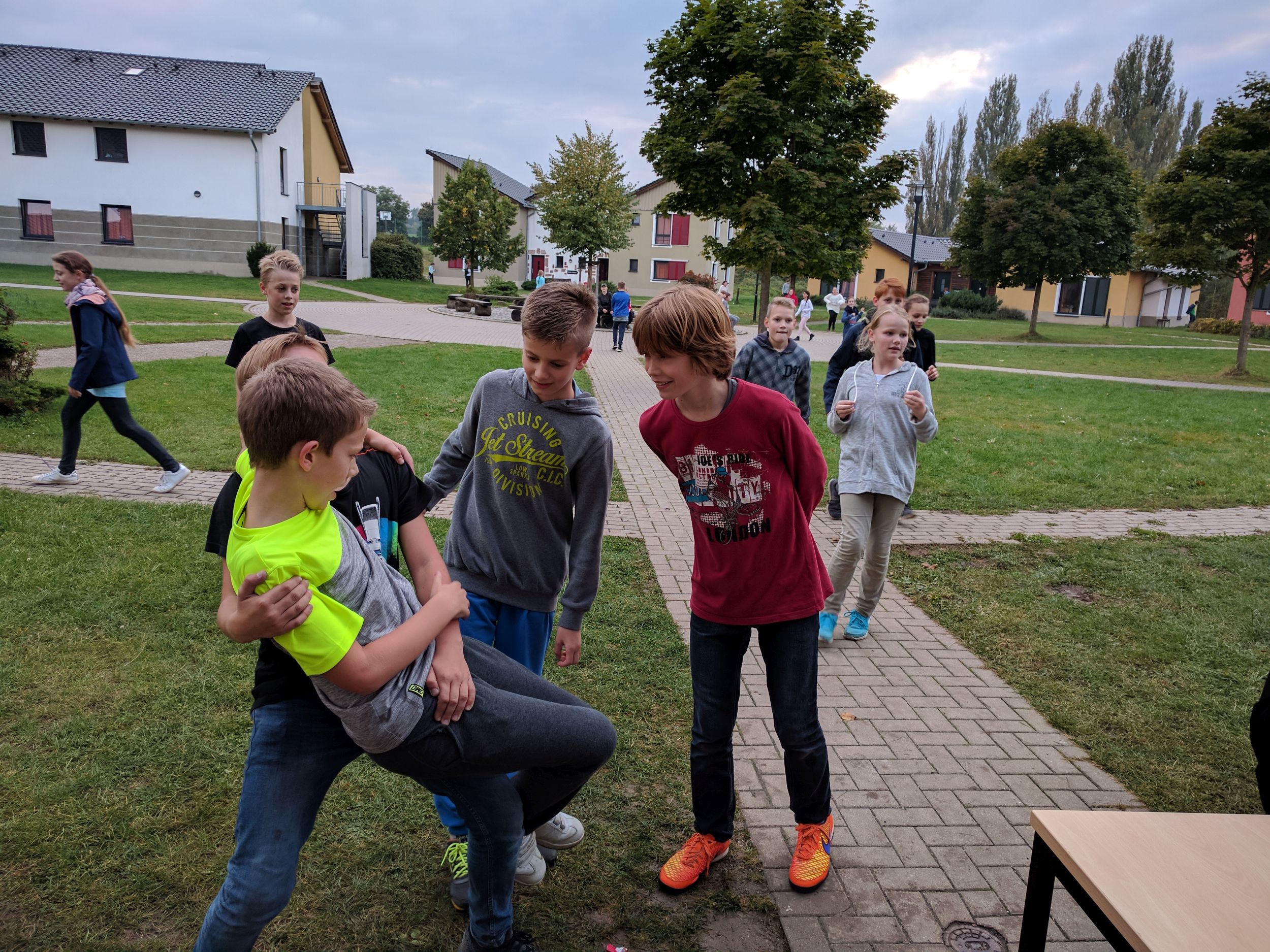 Wir sind mit zwei Bussen losgefahren. Dabei ging ein Sitz kaputt. Ca. fünf Stunden später kamen wir an der Unterkunft „Euroville“ in Naumburg an. Zunächst mussten wir essen. Dann konnten wir endlich in unsere Zimmer und auspacken. Am Abend um ca. 18 Uhr haben wir auf dem Gelände ein Gemeinschaftsspiel gespielt. Um 19 Uhr gab es Abendessen und danach haben wir weitergespielt, am Ende hat eine Jungsgruppe aus der 6B gewonnen. Danach hatten wir Freizeit. Wir waren zum Beispiel auf dem Spielplatz, Volleyballplatz oder in unserem Bungalow und haben Gemeinschaftsspiele gespielt. Um 22 Uhr war Nachtruhe und alle mussten in ihre Zimmer. Dann haben alle irgendwann auch geschlafen.