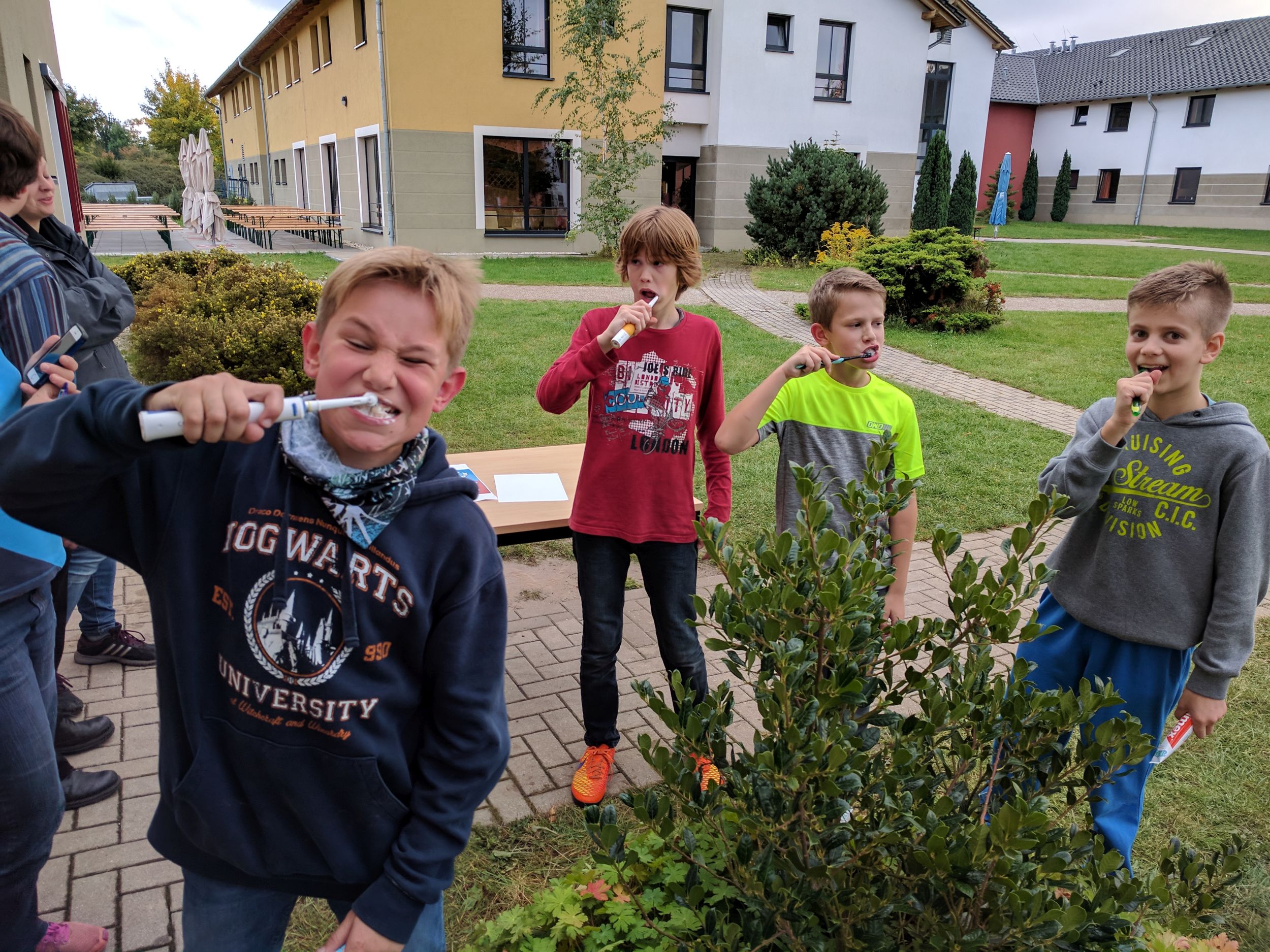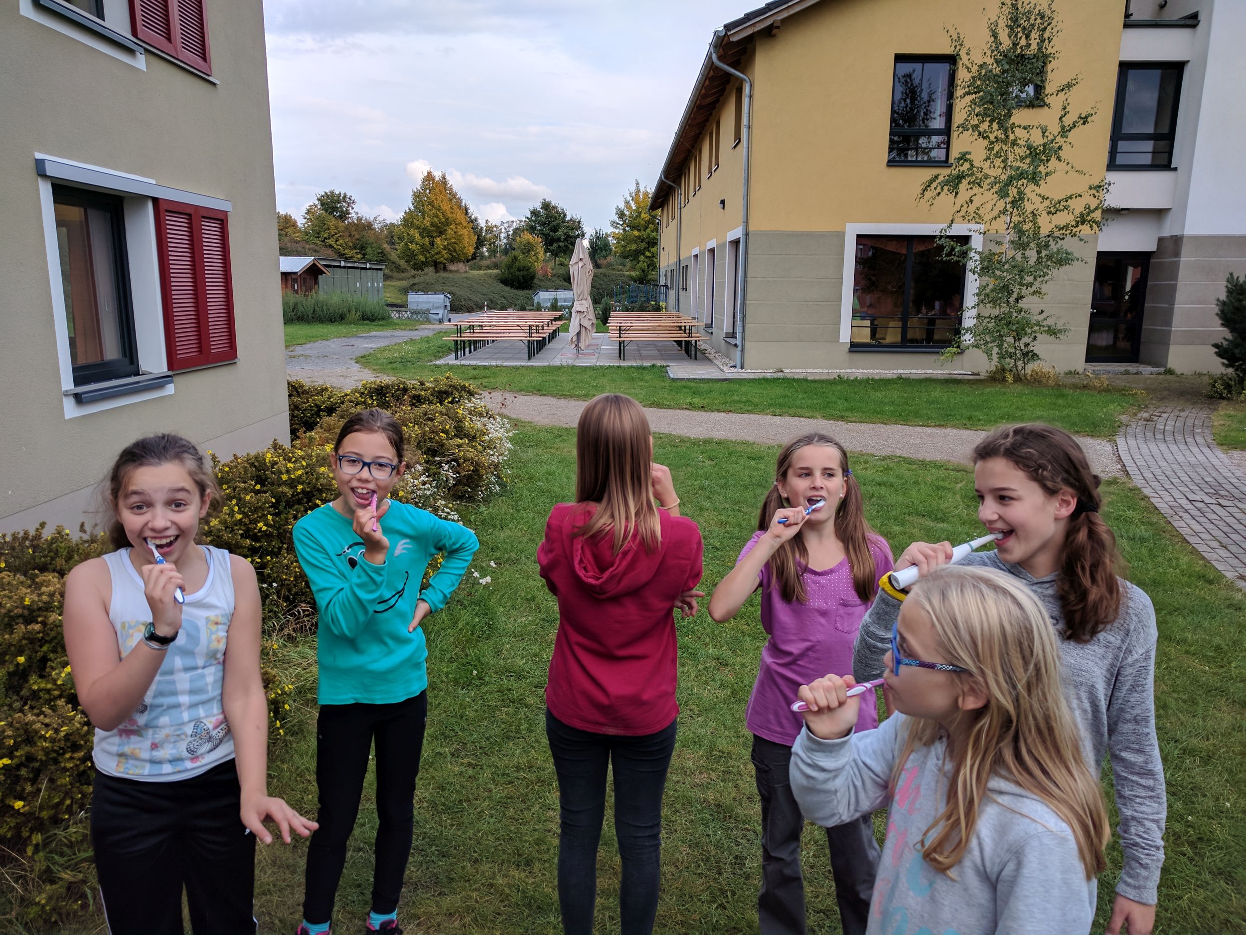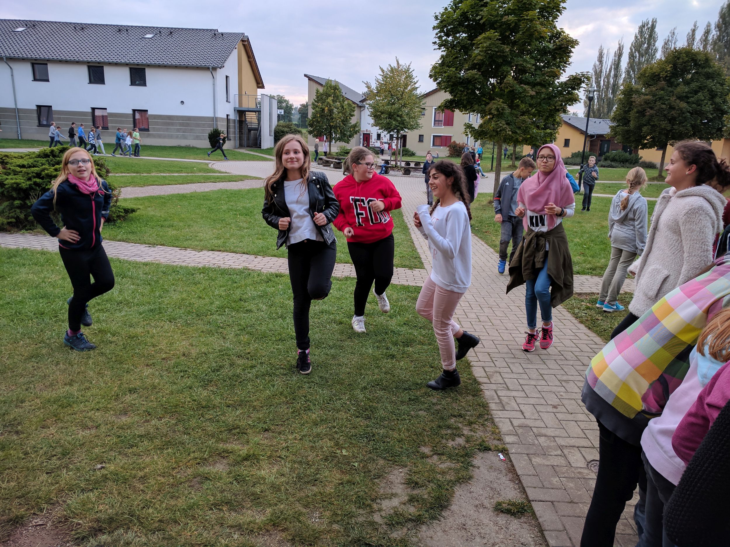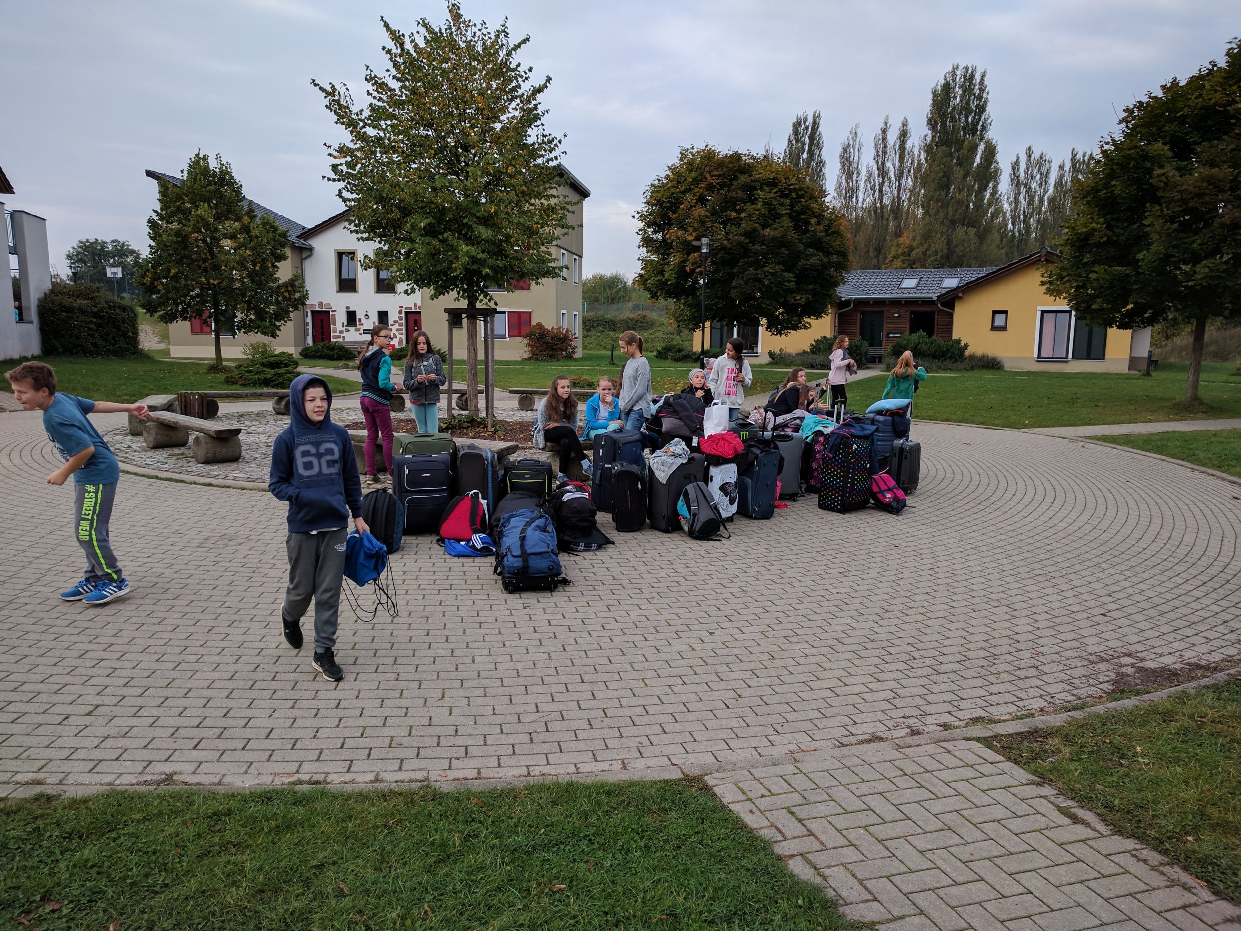 Wir sind mit zwei Bussen losgefahren. Dabei ging ein Sitz kaputt. Ca. fünf Stunden später kamen wir an der Unterkunft „Euroville“ in Naumburg an. Zunächst mussten wir essen. Dann konnten wir endlich in unsere Zimmer und auspacken. Am Abend um ca. 18 Uhr haben wir auf dem Gelände ein Gemeinschaftsspiel gespielt. Um 19 Uhr gab es Abendessen und danach haben wir weitergespielt, am Ende hat eine Jungsgruppe aus der 6B gewonnen. Danach hatten wir Freizeit. Wir waren zum Beispiel auf dem Spielplatz, Volleyballplatz oder in unserem Bungalow und haben Gemeinschaftsspiele gespielt. Um 22 Uhr war Nachtruhe und alle mussten in ihre Zimmer. Dann haben alle irgendwann auch geschlafen.