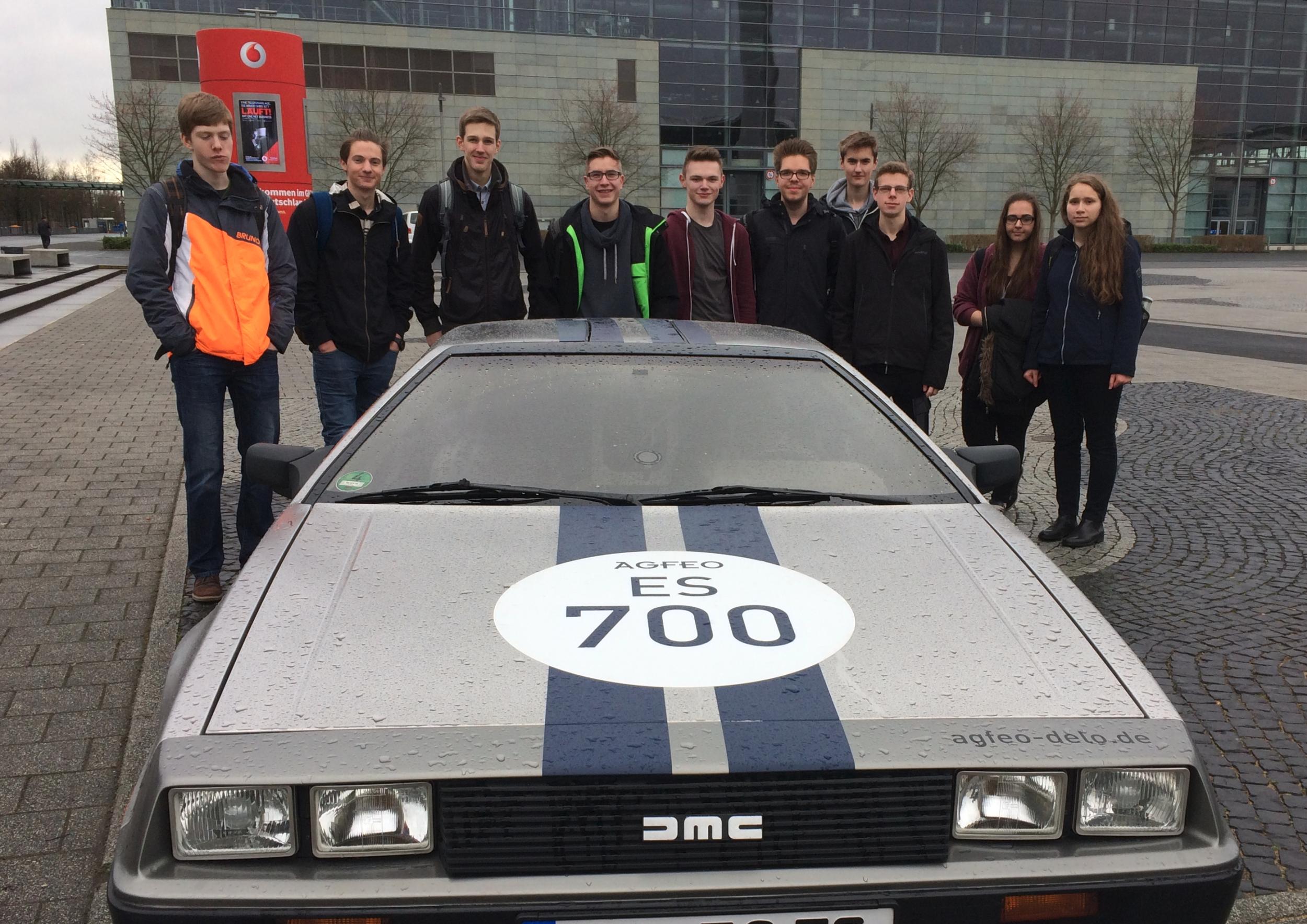 Als wäre es nicht schon eindrucksvoll genug die nahe Zukunft in den Messehallen zu sehen, stand als besonderer Service auf dem Hof des Messegeländes noch ein „De Lorean“ mit aktivem Fluxkompensator. So konnten die LK-Schüler noch einen Ausflug in die ferne Zukunft machen … doch wie es dort aussieht, darf noch nicht verraten werden!