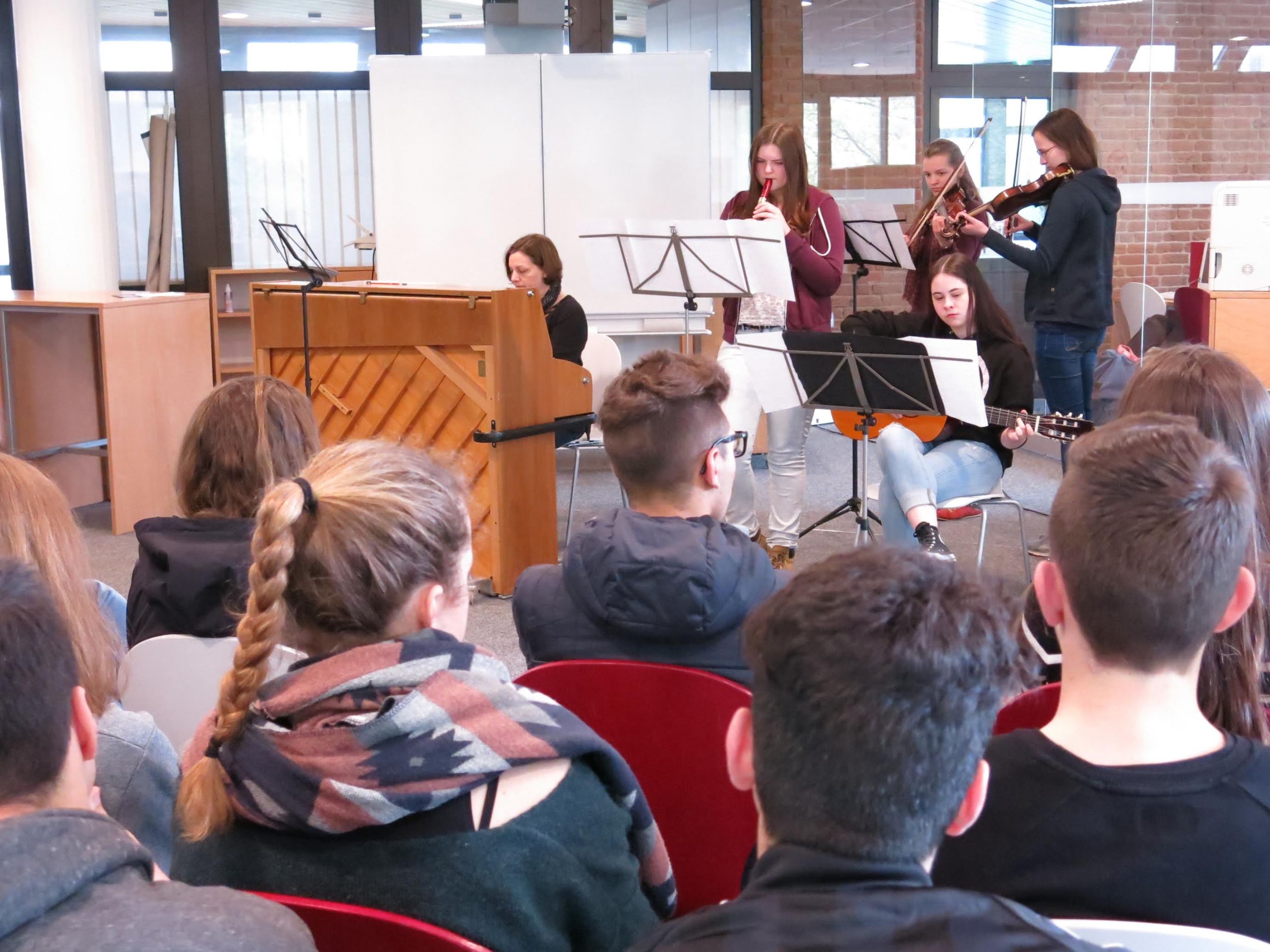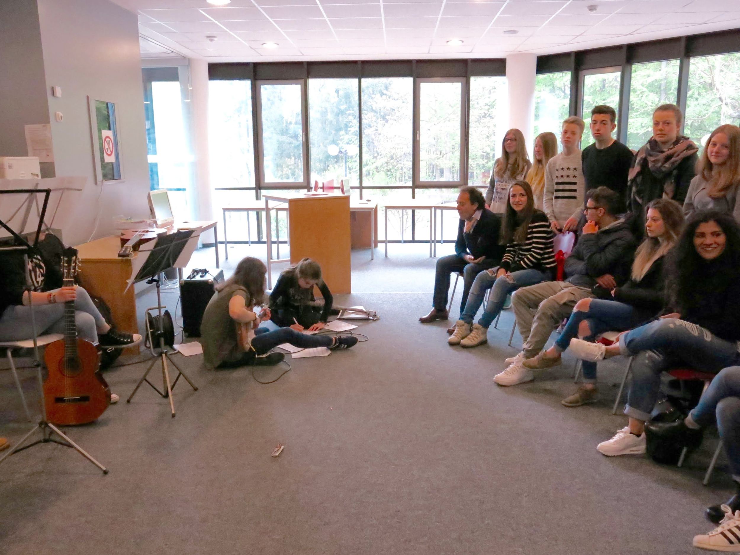 Bei Temperaturen um den Gefrierpunkt erreichte die Gruppe spätabends am Mittwoch, 27.04. die Schule. Am Freitag, 29.04. wurden die Schülerinnen und Schüler im Selbstlernzentrum vom stellvertretenden Schulleiter Dr. Stefan Braun begrüßt. „Für die Begegnung unserer Schülerinnen und Schüler, der italienischen und deutschen, gilt sicherlich das, was Wilhelm von Humboldt über das Kennenlernen von anderen Kulturen schreibt: Es geht dabei um die Gewinnung eines neuen Standpunktes, einer neuen Weltansicht,“ so Dr. Braun. Auch Michela Trevi und Alexander Muntschick, Organisator des Austauschs auf deutscher Seite, dieses Jahr unterstützt von Kristina Klauss und Anna-Lena Jürgensmeyer, richteten Worte an die Gäste. Es gab einen kontrastreichen und stimmungsvollen musikalischen Rahmen, der von Christiane Seiler und Schülerinnen ihrer AG sowie von Jessica-Eyleen Fink und Nora Thiel aus der Klasse 9D gestaltet wurde. Ein anschließendes Willkommensfrühstück wurde dann in der Schulstraße eingenommen – bevor die Südtirolerinnen und Südtiroler die Gelegenheit hatten, am Unterricht teilzunehmen.
