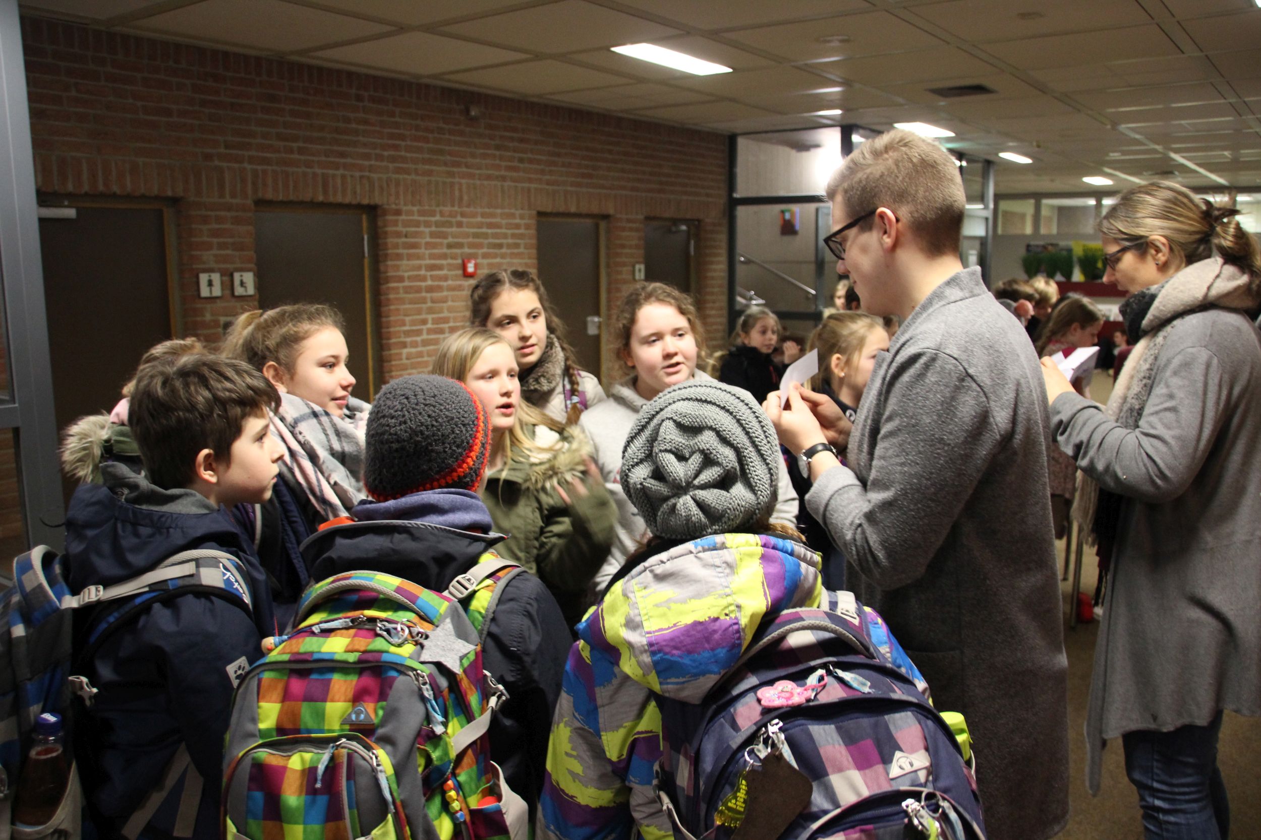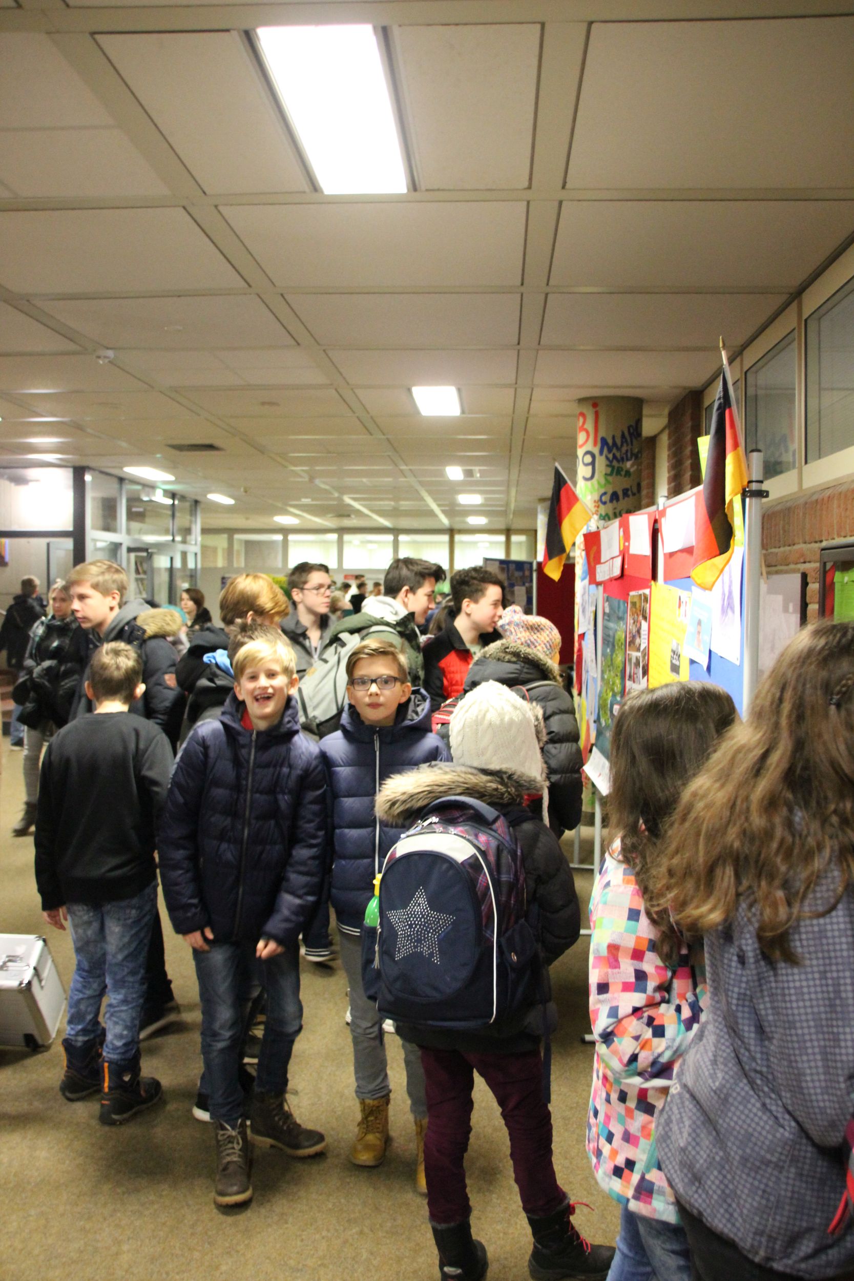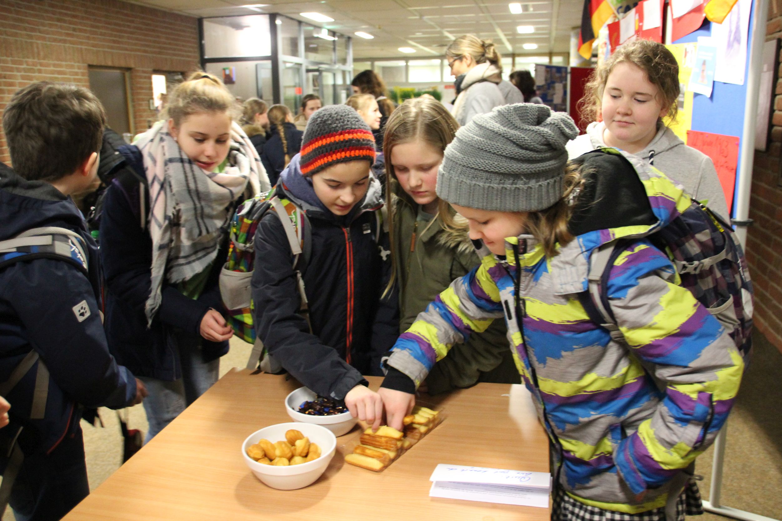 Anlässlich des 55. Jahrestages der deutsch-französischen Freundschaft (Unterzeichnung des Elysée-Vertrags im Jahr 1963) fand am Montag, den 22.01.2018, in den großen Pausen eine Mitmachaktion für Schüler/innen aller Jahrgangsstufen statt. Bei deutsch-französischer Musik konnten sie ihr Wissen über Frankreich und die deutsch-französischen Beziehungen bei einem Wissensquiz unter Beweis stellen und wurden für richtige Antworten mit typisch französischen Köstlichkeiten wie Madeleines belohnt.
