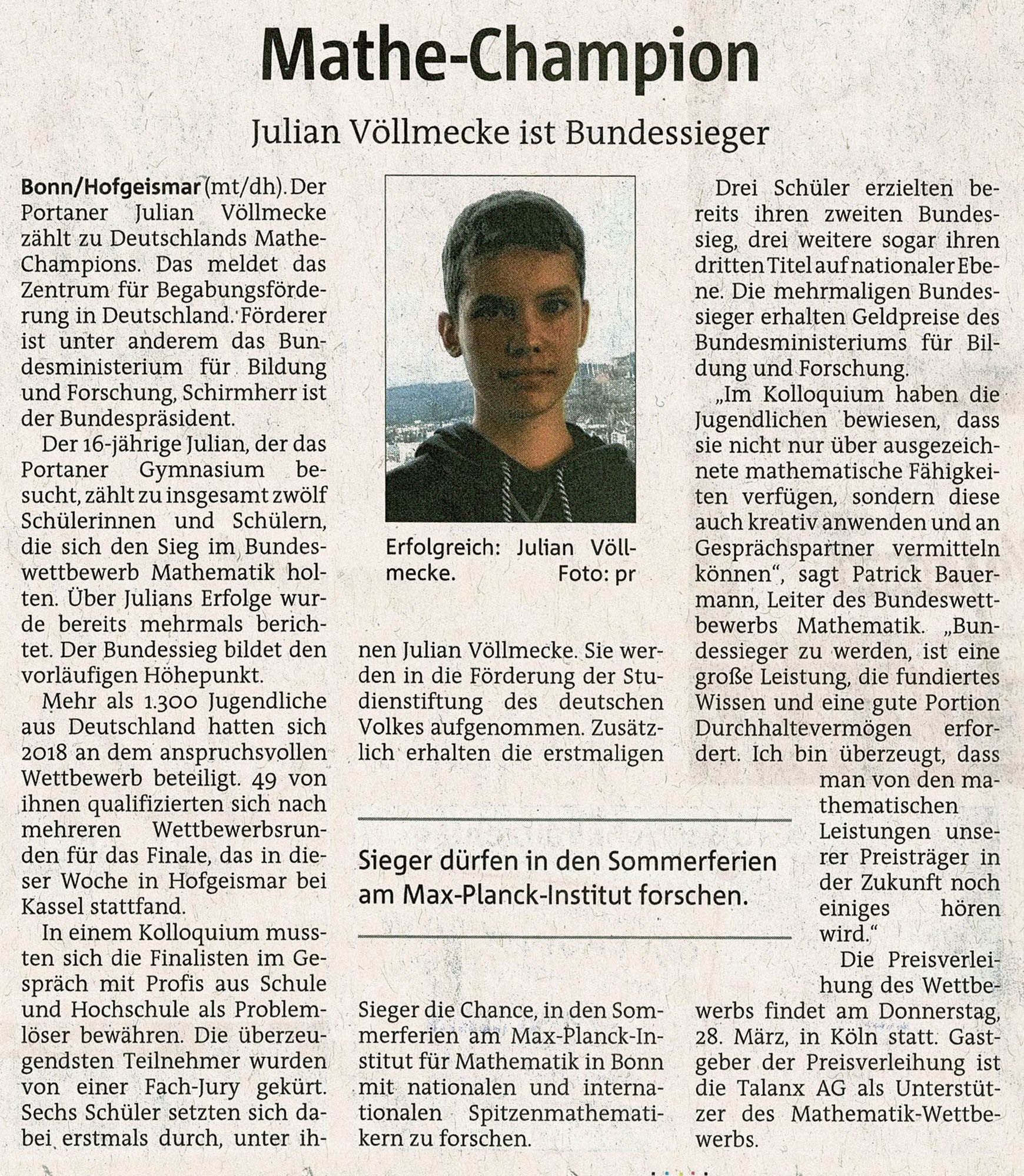 Im Finale des Bundeswettbewerbs Mathematik (BWM) konnte Julian Robin Völlmecke (15-jähriger Schüler der EF unseres Gymnasiums) wieder ganz hervorragende Ergebnisse und so den außergewöhnlichen Bundessieg erringen.
