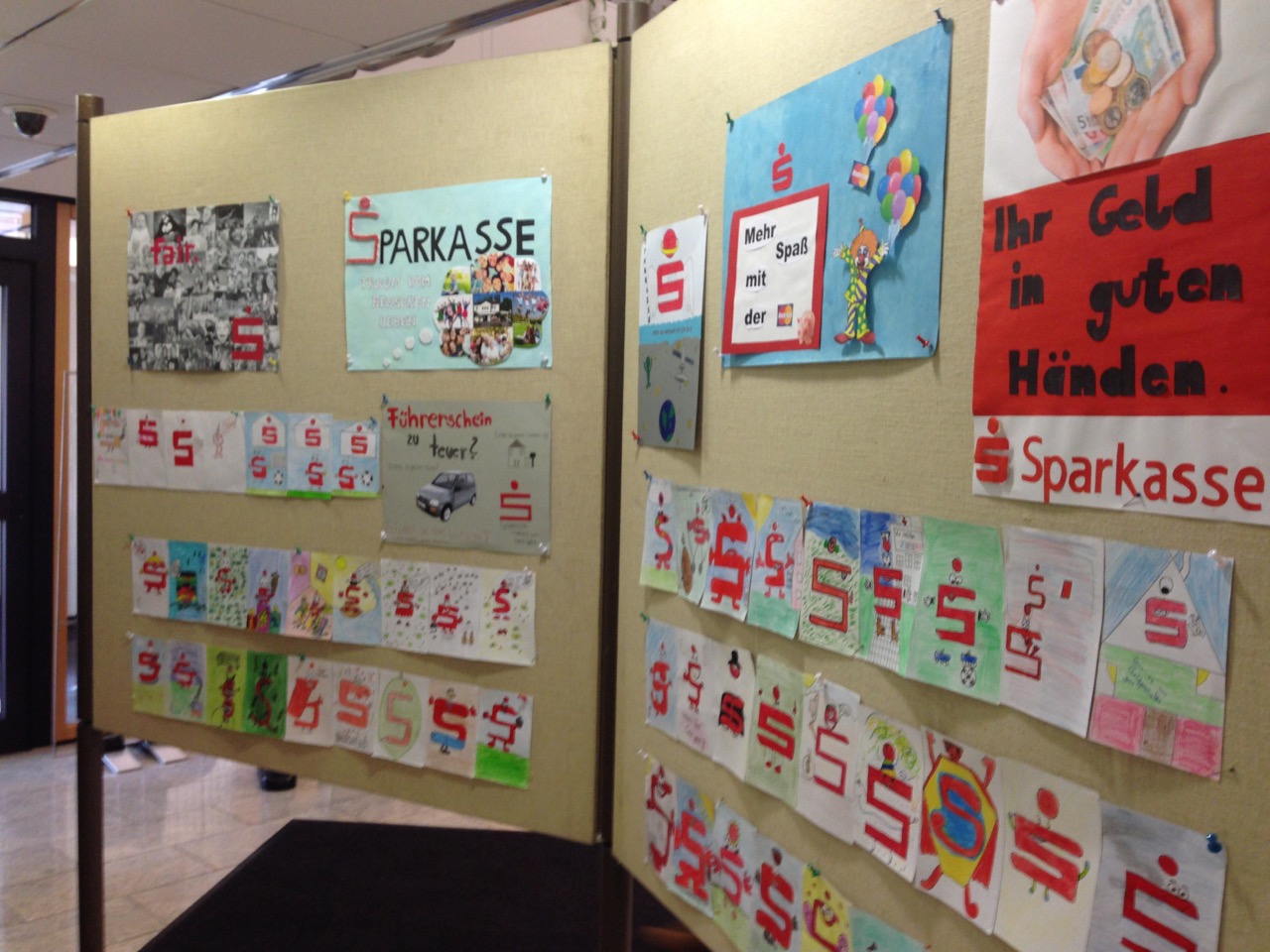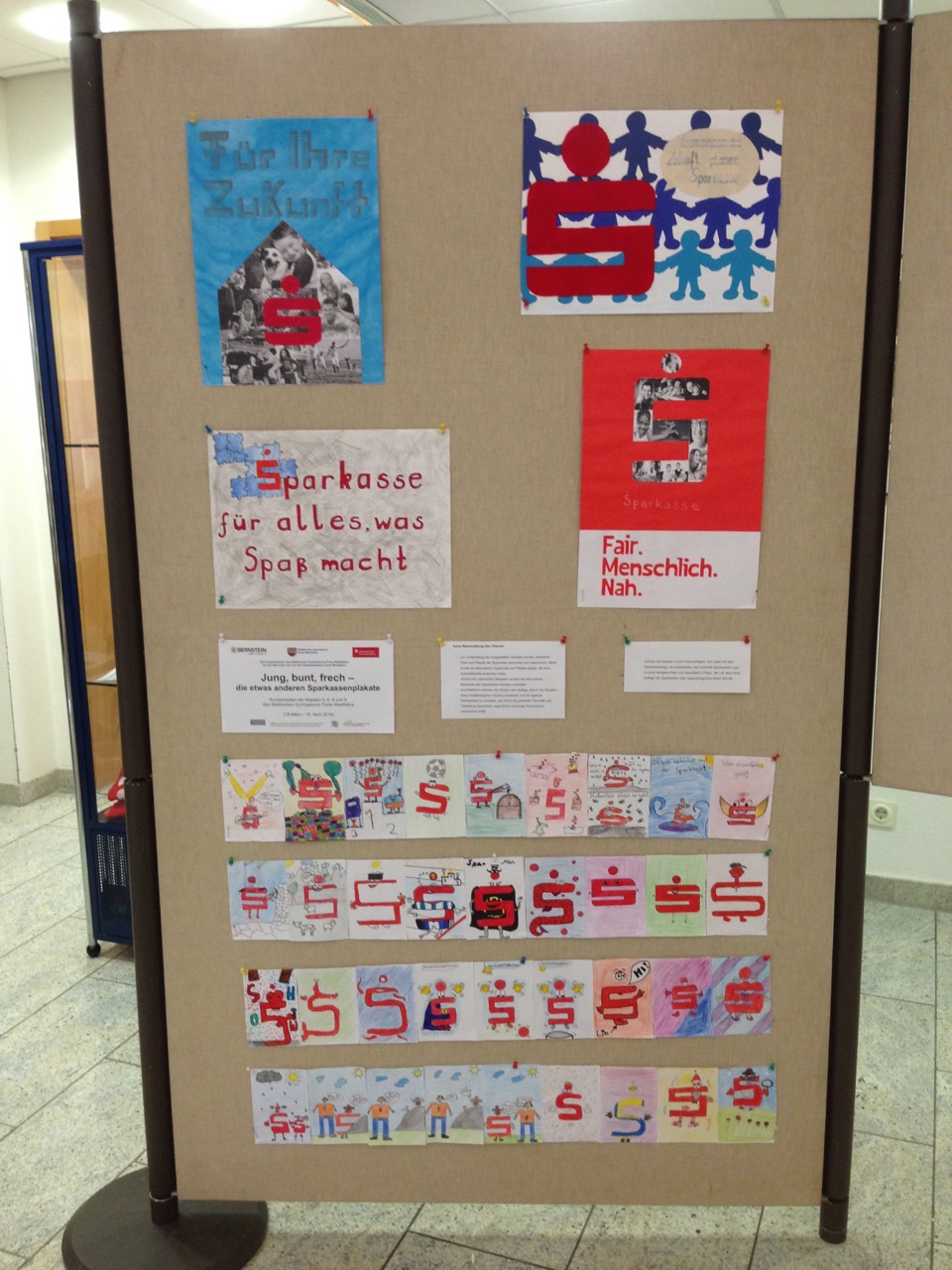 Die jüngeren Schüler der Klassen 5 und 6 beschäftigten sich mit dem S-Logo der Sparkasse und entwickelten es zu einer lebendigen Comic-Figur, die eine neue Auflage der Sparbücher und Jugendmagazine zieren könnte. Herr Kuczera zeigte sich von den Arbeiten begeistert und kündigte an, die schönen Plakate nach der Ausstellung für eine Collage im Treppenhaus des Sparkassen-Gebäudes verwenden zu wollen.