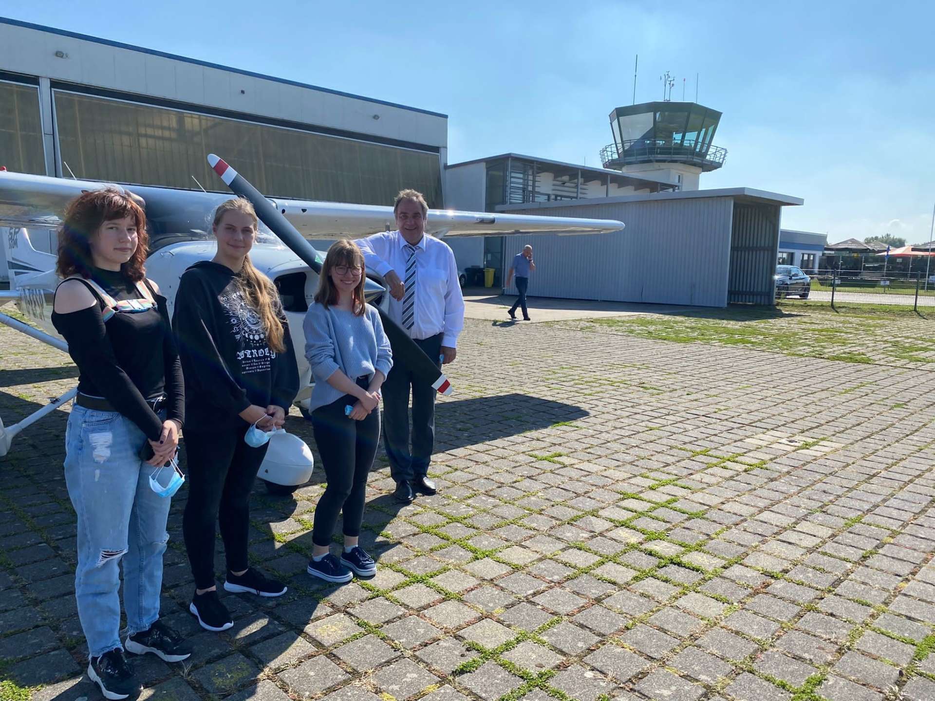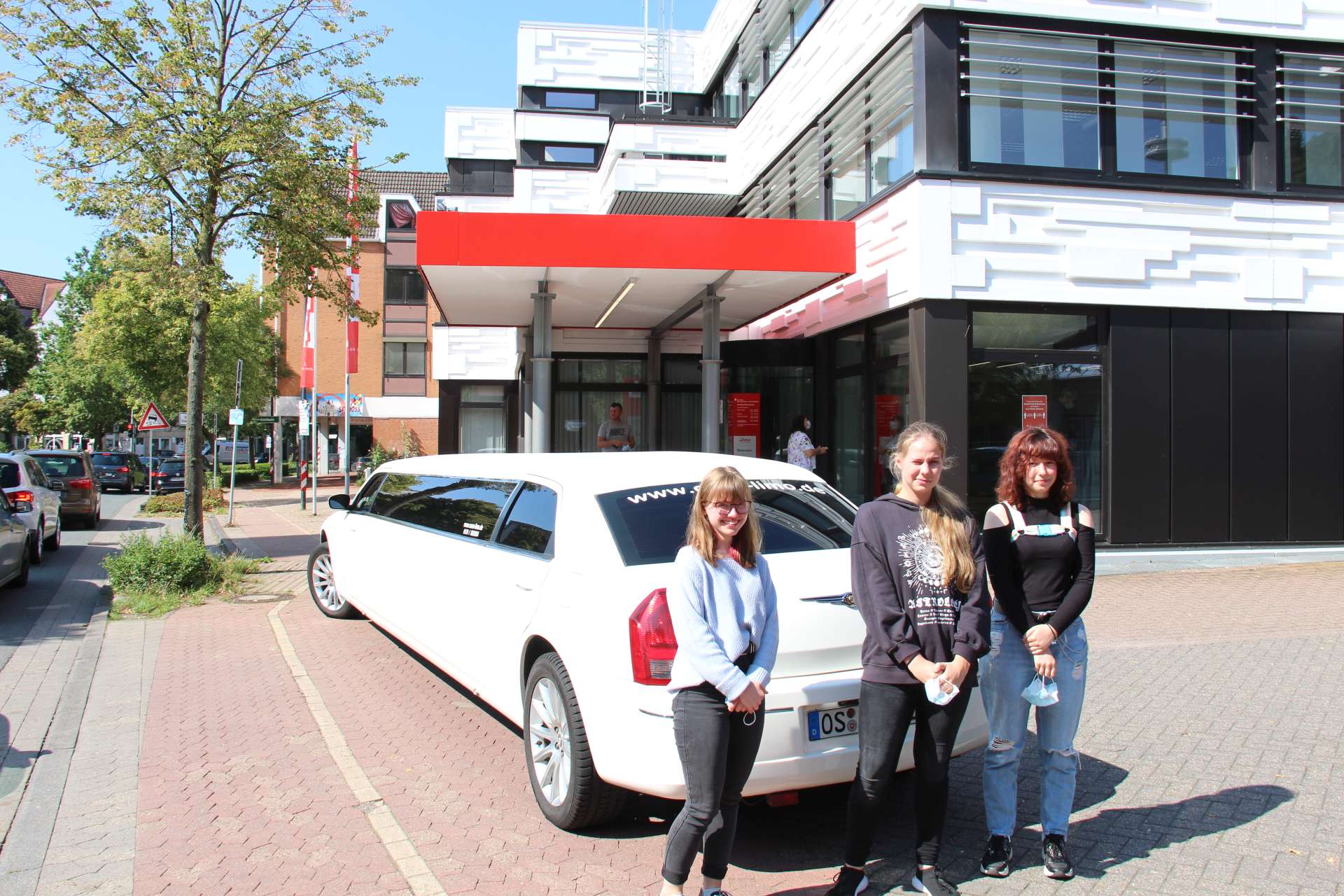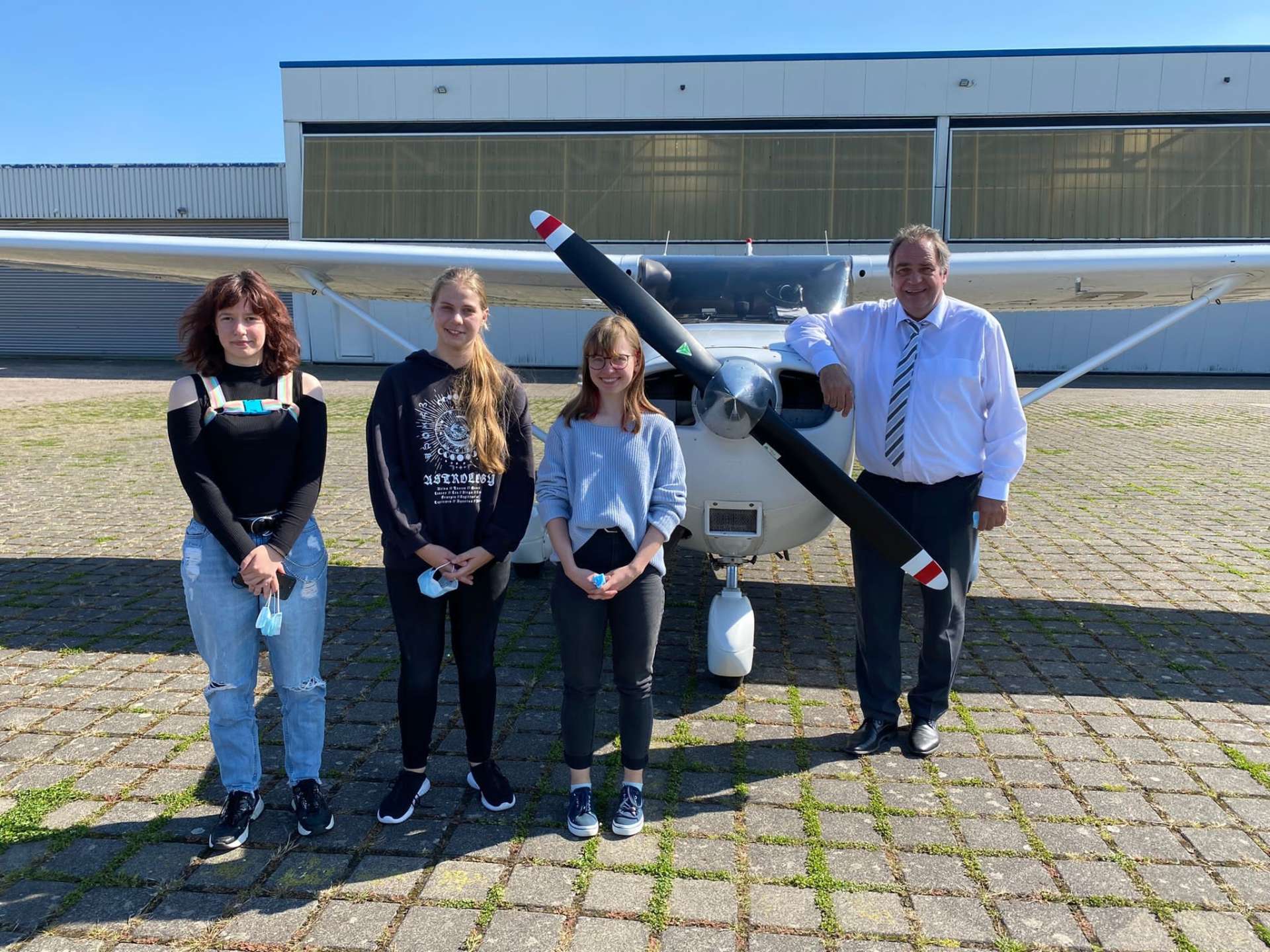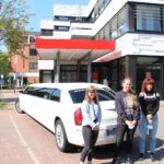 Da unsere Schülerinnen den ersten Platz in NRW belegten, schenkte unser Kooperationspartner, die Sparkasse Bad Oeynhausen-Porta Westfalica, den drei Schülerinnen einen Rundflug in einem Kleinflugzeug mit anschließendem Dinner. Und nicht nur das: Der Weg zum Flughafen wurde standesgemäß in einer Stretch-Limousine zurückgelegt. Auf den Fotos sind unsere Schülerinnen mit Herrn Kuczera von der Sparkasse zu sehen.