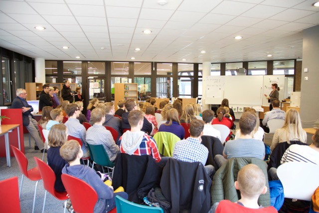Am 20.11.2014 um 12.20 Uhr war es endlich so weit – unsere Schulleiterin Frau Burmester lüftete das große Geheimnis, das die Schulgemeinde des Gymnasiums Porta in den letzten Wochen umtrieb: Der Ausgang der Logo-und-Slogan-Wahl wurde im Selbstlernzentrum bekannt gegeben. Frau Burmester machte es zunächst spannend, nannte die ermittelten Stimmenzahlen für die je drei Vorschläge von wählbaren Logos und Slogans und forderte die Schülerinnen und Schüler dann auf: „Ratet, welche Logos und welche Slogans zu den jeweiligen Stimmenzahlen passen!“ Die Aufregung stieg – und schließlich wurde in Anwesenheit des Entwicklers der Logos und Slogans, Herrn Lukas Vladi, des Rätsels Lösung offenbart: Logo-Gewinner ist das in zwei eleganten Bögen angedeutete grüne „G“ – stehend für „Gymnasium“. Herr Vladi erläuterte, dass dieses Zeichen, in Zukunft untrennbar mit unserer Schule verbunden, auch im Sinne eines Miteinanders zweier ineinander greifender Hände verstanden werden kann und die Bögen in ihrer kontrastiven Anordnung Dynamik und Entwicklung in eine offene Zukunft verkörpern. Und der Slogan? „Wissen steckt an“ ist das neue Motto unserer Schule.