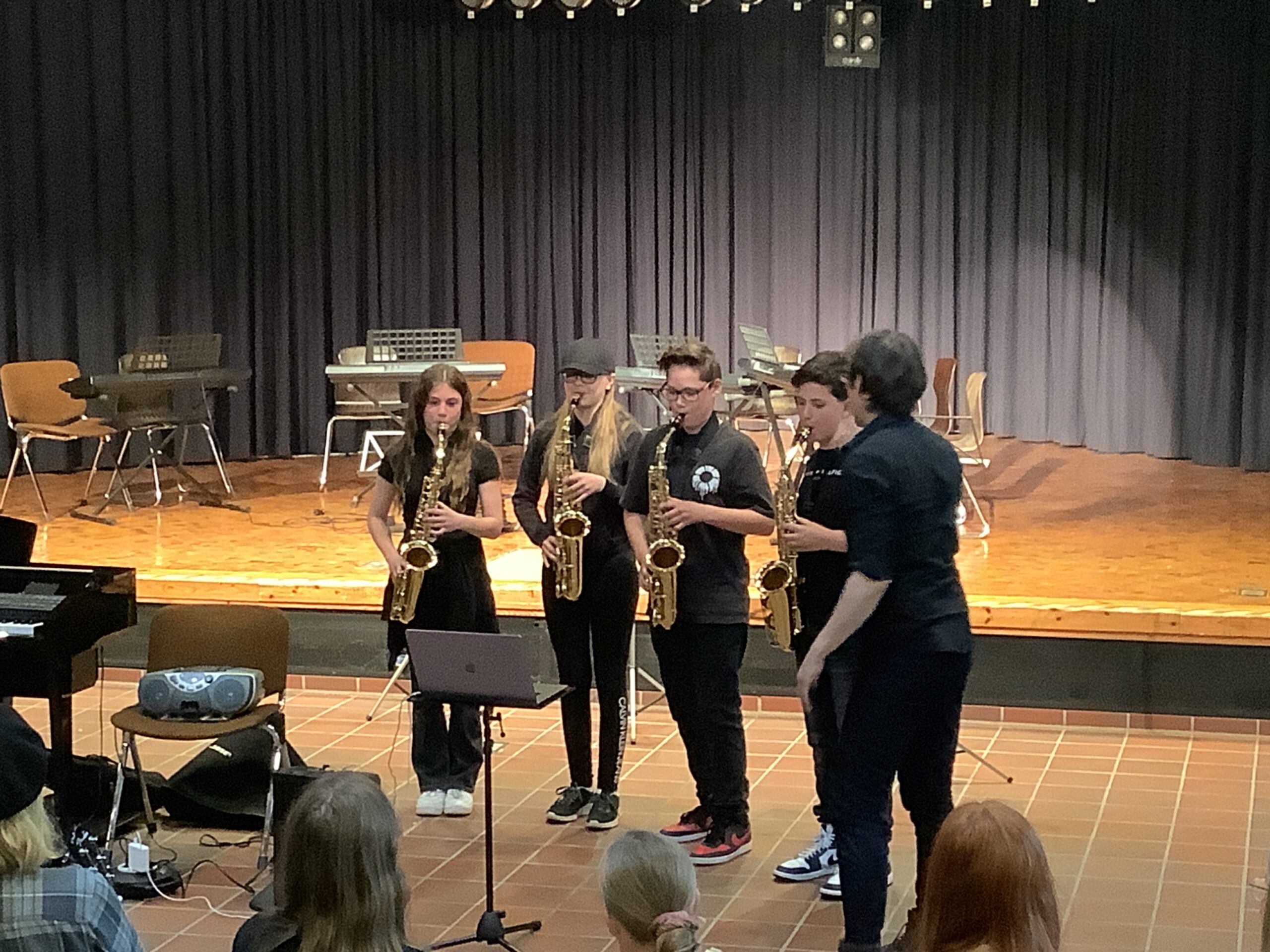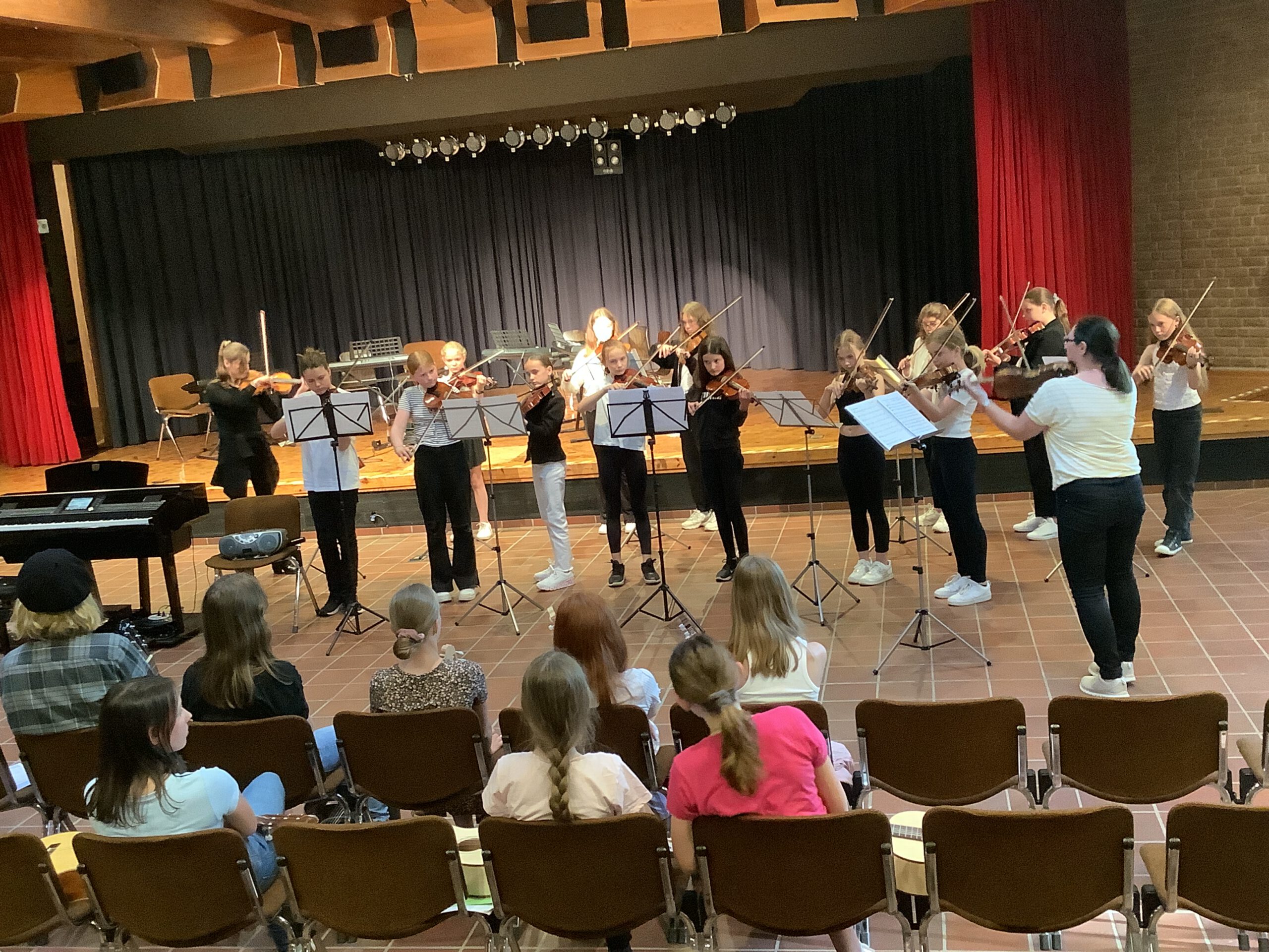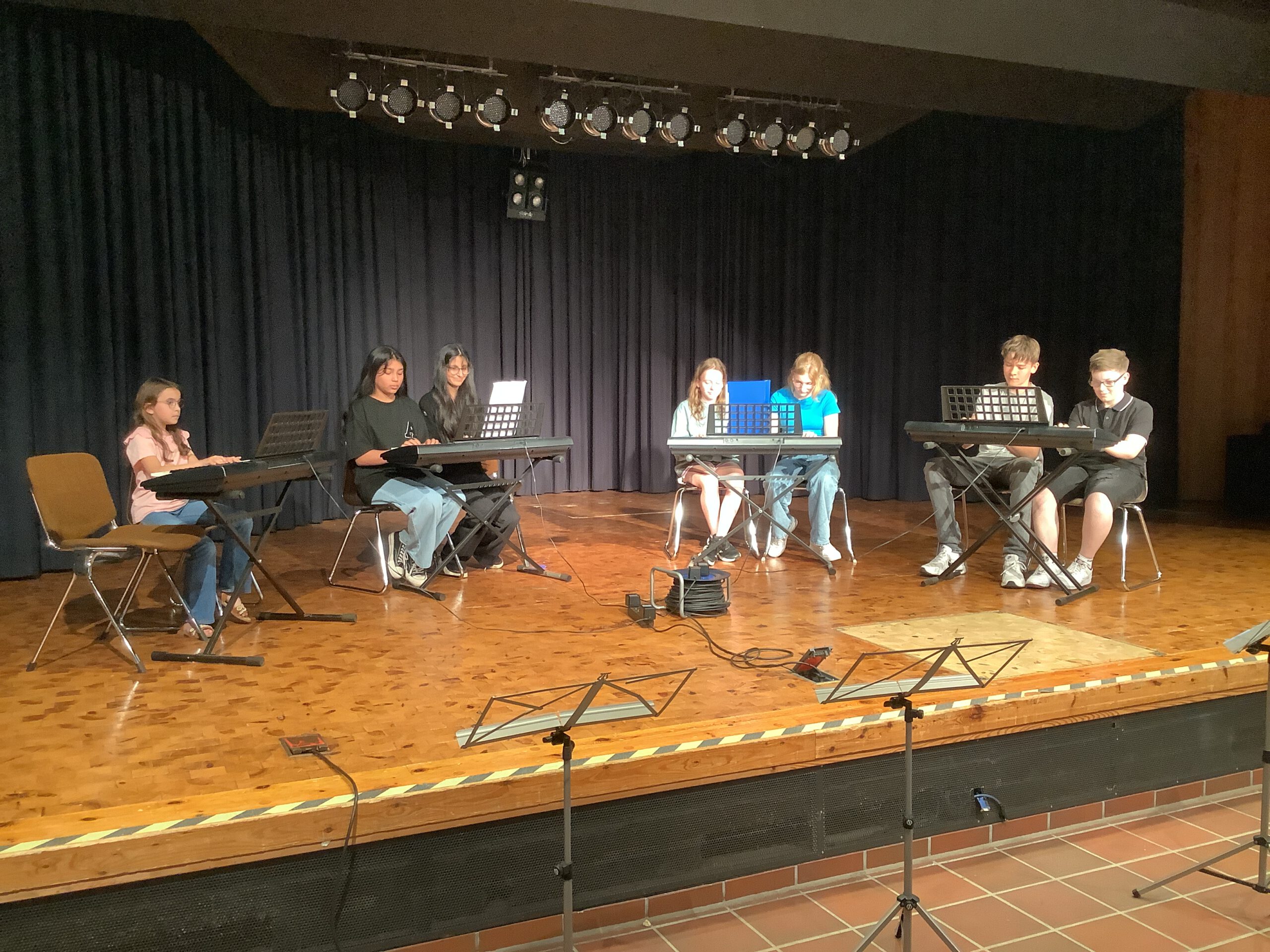 Die Luft ist am Mittwoch, dem 31. Mai nicht nur warm, sondern auch voll Musik! Nach 1,5 Jahren Instrumentalunterricht im nicht ganz normalen Schulunterricht zeigen unsere Sechstklässler, was sie so alles gelernt haben. Im kleinen Konzert führten unsere Schüler*innen in ihren Gruppen gemeinsam einstudierte Stücke auf, deren Darbietung mit kräftigem und herzlichem Applaus honoriert wurde.