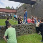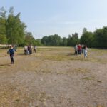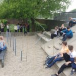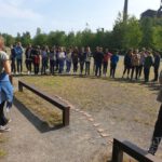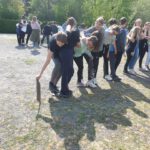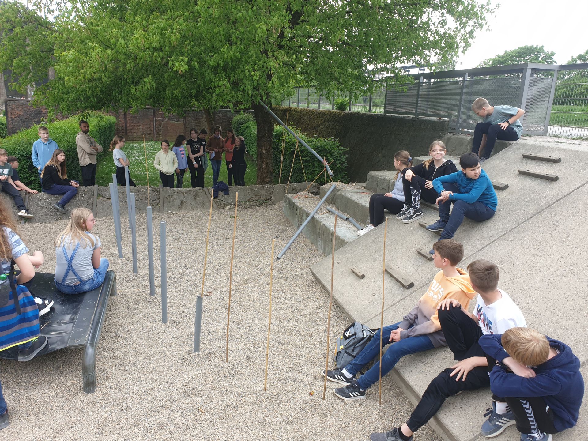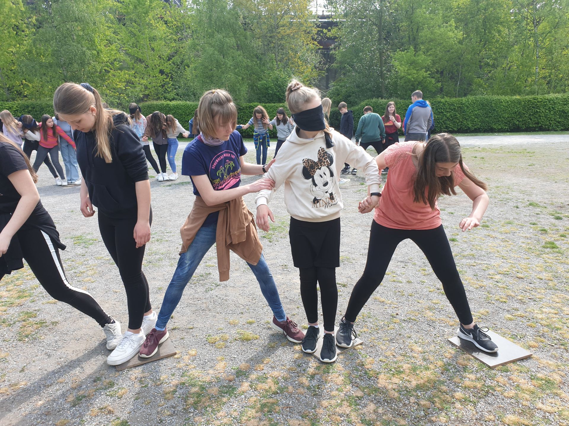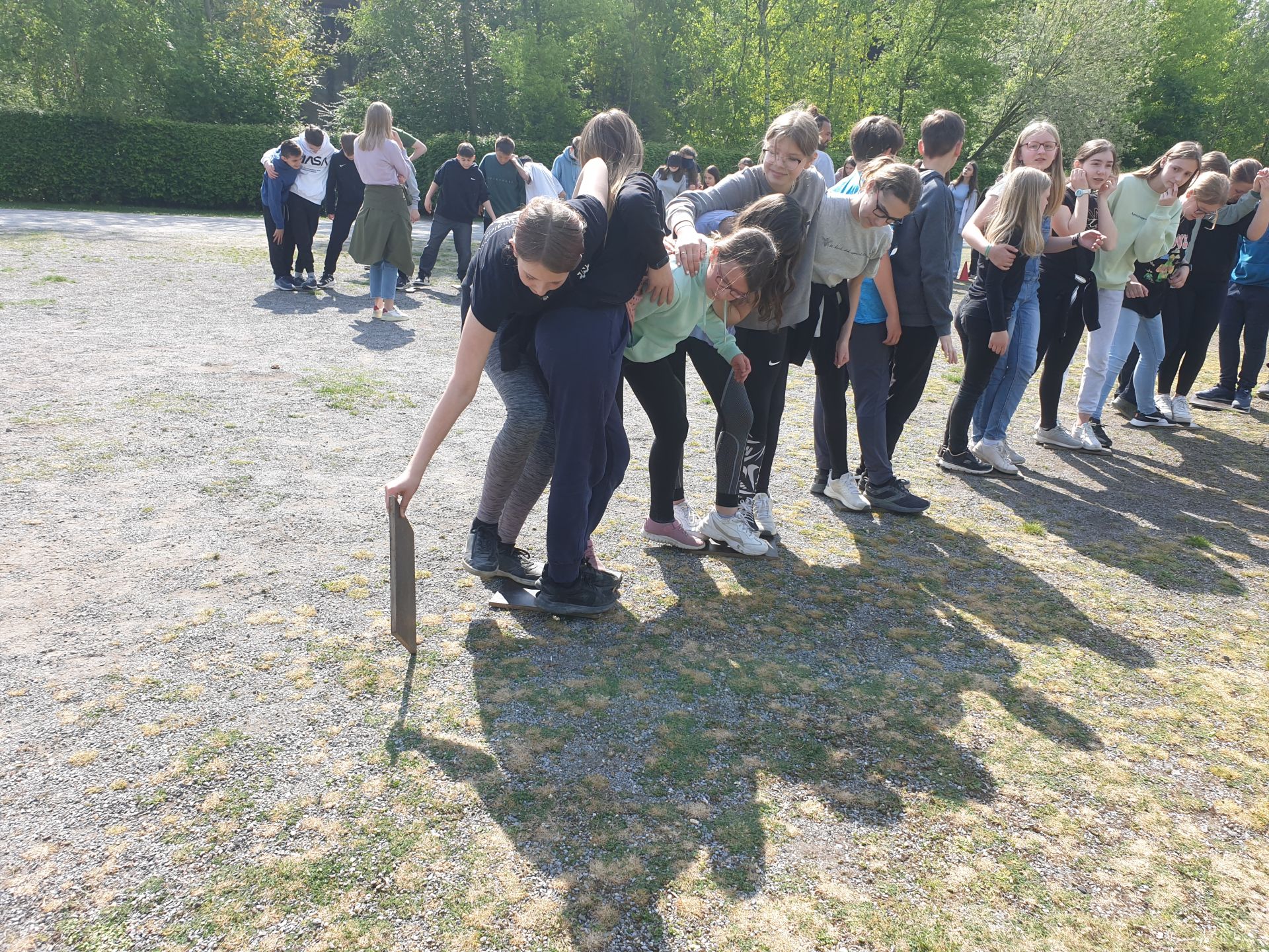 Am nächsten Vormittag war Teambuilding angesagt: Auf dem Gelände des Landschaftsparks spielten wir einige Spiele, um unsere Klassengemeinschaft zu stärken, z.B. „Titanic“: Bei diesem Spiel mussten wir mit Hilfe von immer weniger Holzplatten eine lange Strecke überwinden, ohne jemals den Boden zu berühren oder den Kontakt zu den Platten zu verlieren. So standen wir dann irgendwann auch mal zu viert auf einer Platte, was für großes Gelächter sorgte. Nach dem Mittagessen gab es eine Konstruktionsaufgabe: In kleinen Gruppen bauten wir aus Rohren, Gummibändern, Stöcken und anderen Hilfsmaterialien kreative Bahnen für einen Golfball. Dazu musste auch eine unterhaltsame Geschichte präsentiert werden. Die Ergebnisse an den unterschiedlichsten Schauplätzen (Brücken, Büschen, Bäumen, Industrieanlagen) konnten sich wirklich sehen und hören lassen. Nach dem Abendessen wartete ein gemütliches Lagerfeuer auf uns und wir ‚grillten‘ Marshmallows. Dazu gab es Spiele und später noch eine nächtliche Rutschpartie im Park.