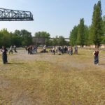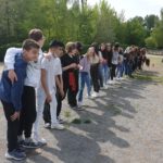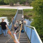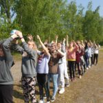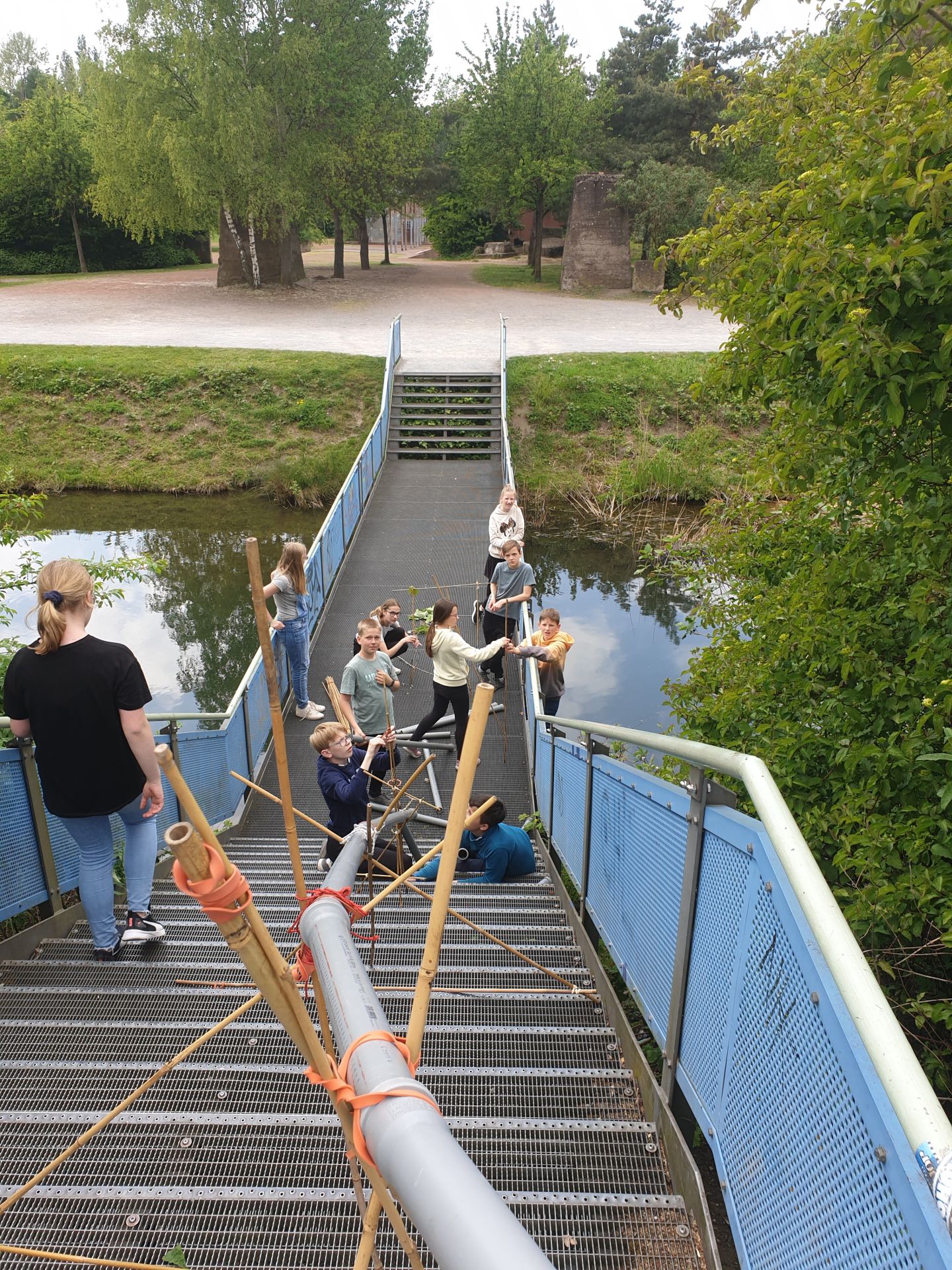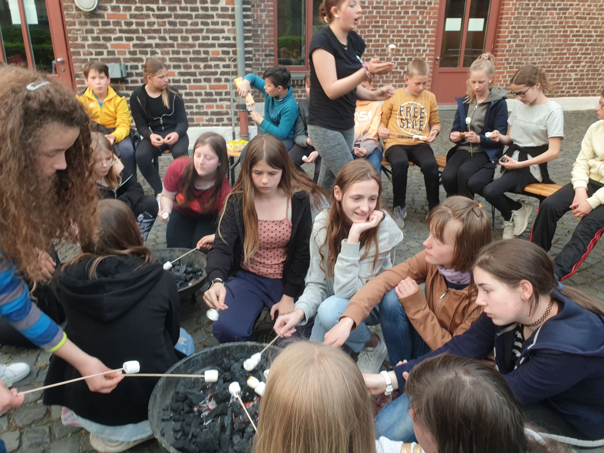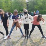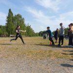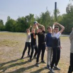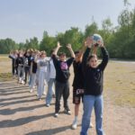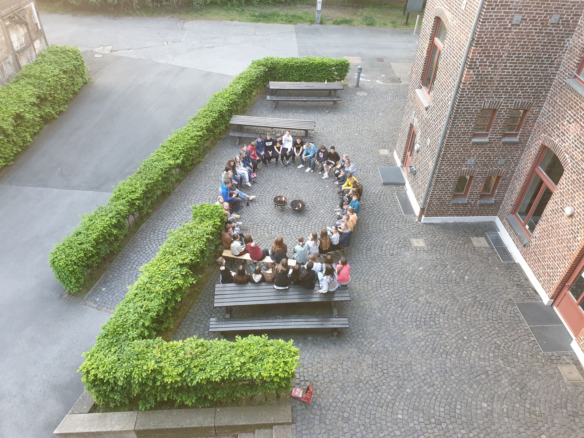 Am nächsten Vormittag war Teambuilding angesagt: Auf dem Gelände des Landschaftsparks spielten wir einige Spiele, um unsere Klassengemeinschaft zu stärken, z.B. „Titanic“: Bei diesem Spiel mussten wir mit Hilfe von immer weniger Holzplatten eine lange Strecke überwinden, ohne jemals den Boden zu berühren oder den Kontakt zu den Platten zu verlieren. So standen wir dann irgendwann auch mal zu viert auf einer Platte, was für großes Gelächter sorgte. Nach dem Mittagessen gab es eine Konstruktionsaufgabe: In kleinen Gruppen bauten wir aus Rohren, Gummibändern, Stöcken und anderen Hilfsmaterialien kreative Bahnen für einen Golfball. Dazu musste auch eine unterhaltsame Geschichte präsentiert werden. Die Ergebnisse an den unterschiedlichsten Schauplätzen (Brücken, Büschen, Bäumen, Industrieanlagen) konnten sich wirklich sehen und hören lassen. Nach dem Abendessen wartete ein gemütliches Lagerfeuer auf uns und wir ‚grillten‘ Marshmallows. Dazu gab es Spiele und später noch eine nächtliche Rutschpartie im Park.