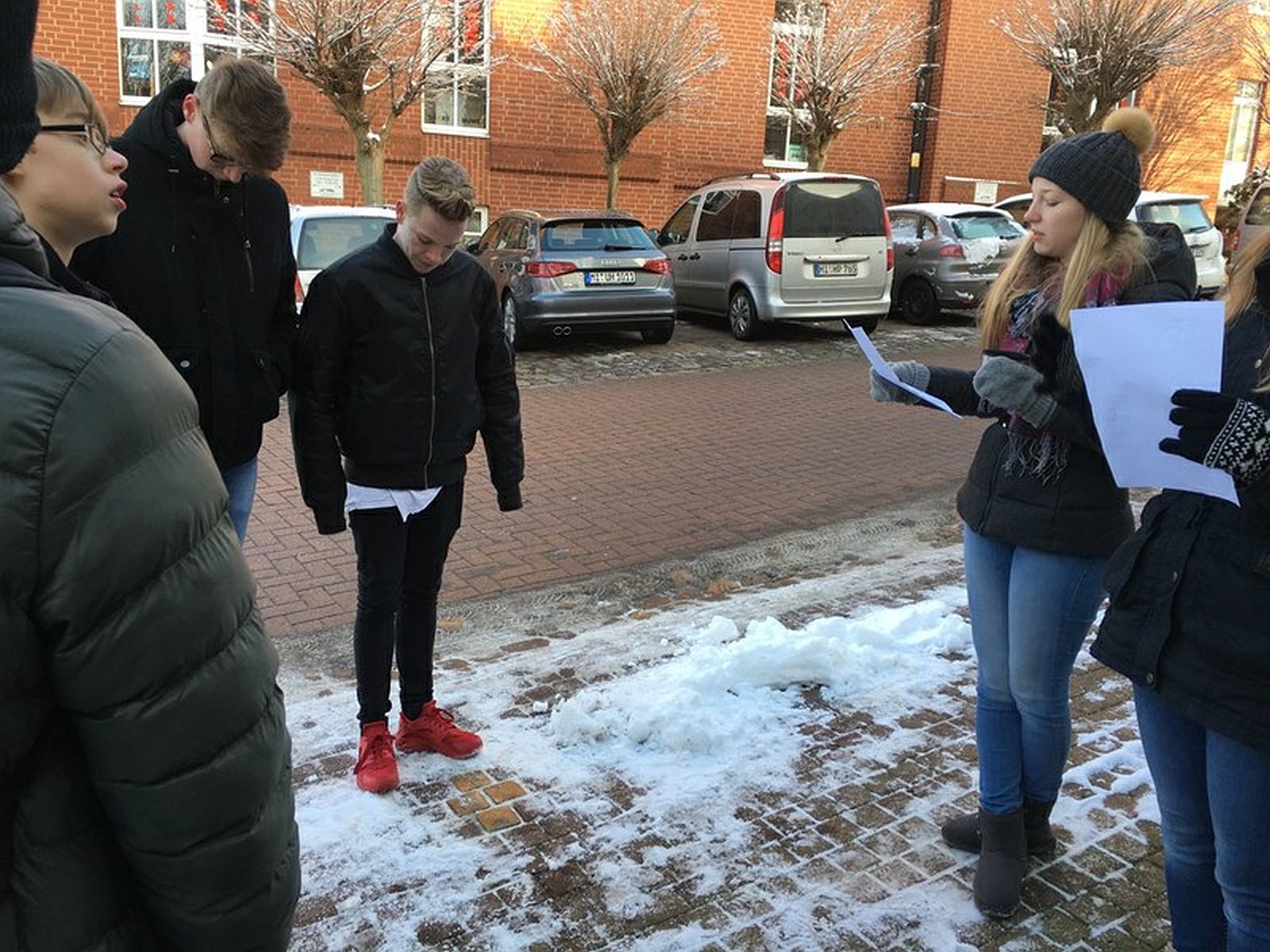 Anschließend wurden das Mahnmal am Grünen Markt in Hausberge sowie die kürzlich verlegten Stolpersteine an der Hauptstraße besichtigt. Dabei wurde unter den Schülern die Bedeutung einer Erinnerungskultur thematisiert. „Warum erinnern wir eigentlich?“ – so die Frage einer Q2-Schülerin an ihre Mitschüler. „Um das Geschehen nicht zu vergessen“, „um aus den Fehlern der Vergangenheit zu lernen“, aber auch „um den Opfern eine Ehre zu erweisen“, antworteten die Neuntklässler. Die besondere Bedeutung der Auseinandersetzung mit der Geschichte wurde schließlich an einem Zitat auf dem Mahnmal am Grünen Markt festgemacht. „Nicht-Wissen-Wollen ist die bedingungslose Kapitulation“ – so die Aufschrift. Denn nur wer sich mit den Ereignissen vergangener Zeit befasst, ist schließlich auch imstande, die Zukunft verantwortungsvoll mitzugestalten!