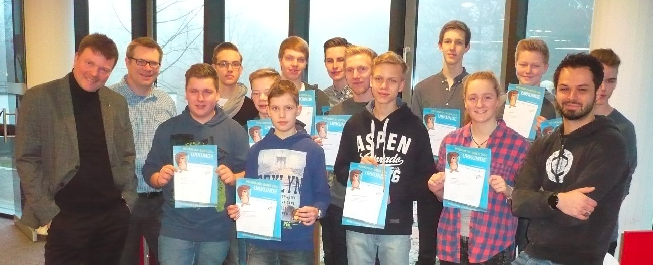 Letzte Woche fand die Ehrung besonderer Leistungen im Informatikbiber-Wettbewerb statt. Die Informatiklehrer freuen sich über die außerordentlich erfolgreiche Teilnahme. Die Schüler Julian Robin Völlmecke, Dennis Kriete, Lisa Millmann, Lukas Behrens, Marius Bombelka, Colin Brand, Yannick Buchholz, Lars Luthe, Jörn Begemann und Lars Rohlfing erhielten zu ihren Urkunden besondere Kugelschreiber oder USB-Sticks als kleine Sachpreise. Die Schüler Niklas Hämmerling und Timo Kriete zeigten mit Erreichen der vollen Punktzahl eine überragende Leistung und bekamen als Sachpreis ein nicht ganz gewöhnliches Informatikbuch.