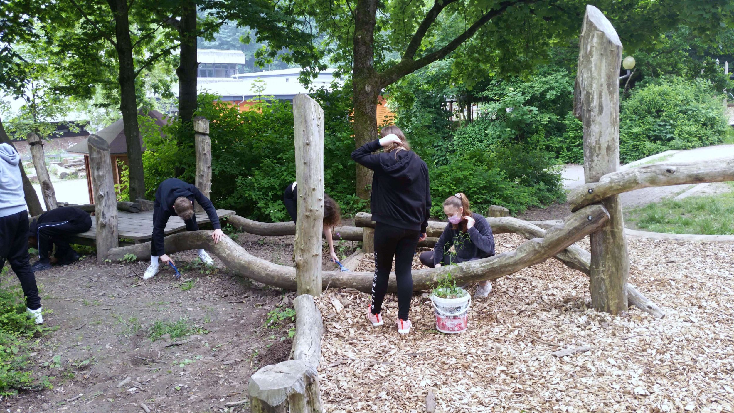 Ein naturnaher Schulhof bietet Platz für Mensch … und Natur. Dabei sammelt sich im Lauf der Zeit nicht nur Unrat an, sondern auch verschiedene Pflanzenarten möchten gerne die Spielgeräte erobern. Zeit für weitere naturnahe Aktionen.