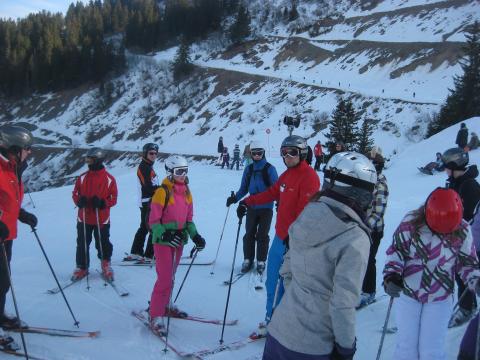 In dem kleinem Ort Châtel angekommen wurden die Schüler und Schülerinnen erst Mal auf Grund der geringen Schneemengen im Tal enttäuscht. Trotzdem bezog man gespannt in dem urgemütlichen Haus ‚le Savoy‘ endlich ihre Zimmer. Nach kurzer Vorstellung der Betreuer des Hauses (Teamer) und der Skiregeln fielen alle erschöpft in die Betten. Am Morgen wurden alle von einem motivierten Teamer mit einem kleinen Lied (‚Hakuna matata‘ oder ‚Probiers mal mit Gemütlichkeit‘) geweckt und dann ging es endlich auf die Piste, wo die Schüler ihren Fähigkeiten entsprechend in Gruppen aufgeteilt wurden. Die Anfängliche Enttäuschung über die Schneeverhältnisse war rasch gewichen, denn die Pisten waren überraschend gut präpariert und es ließ sich gut fahren. Vor allem bei den Anfängern ging es am Anfang dank vieler tollpatschiger Stürze spaßig zu. Doch alle machten täglich große Fortschritte und am Ende fuhren alle Gruppen zusammen die Pisten hinunter. Die Schüler und Schülerinnen halfen sich untereinander, so dass die Anfänger nicht nur von ihren Skilehren nützliche Tipps erhielten, sondern auch von ihren Mitschülern. Hierdurch wurden große Fortschritte aller Gruppen erzielt. Es wurde jeden Tag sehr viel gelacht – alle hatten eine Menge Spaß.
