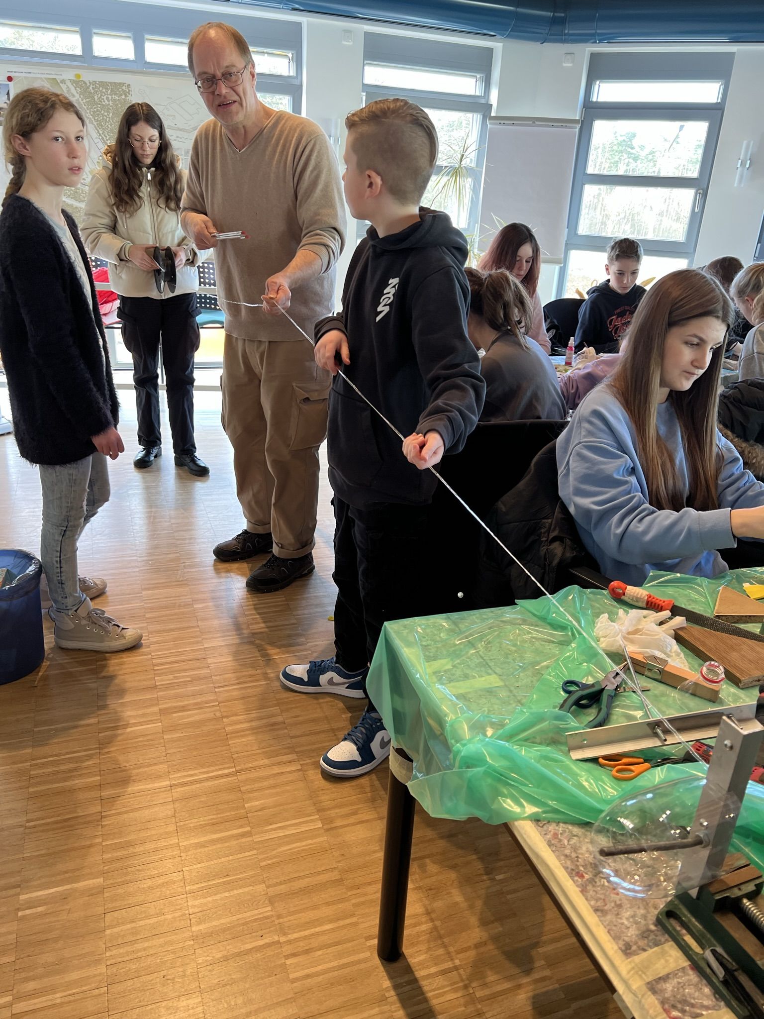 Zum Einstieg zeigte er uns einen Kurzfilm über das Plastikproblem in unserer Umwelt, über welchen wir anschließend diskutierten. Im Anschluss daran wurde unsere Klasse in zwei Gruppen aufgeteilt. Die eine Gruppe hat aus altem Restholz neue Kunstwerke erschaffen, während die andere Gruppe unter anderem Plastik geschmolzen und u.a. zu Gitarrenplättchen weiterverarbeitete. Am Ende versuchten wir aus einer Plastikflasche ein möglichst langes Plastikband herzustellen. Unser Band war über 40 Meter lang und somit das längste, das jemals bei diesem Workshop hergestellt wurde!