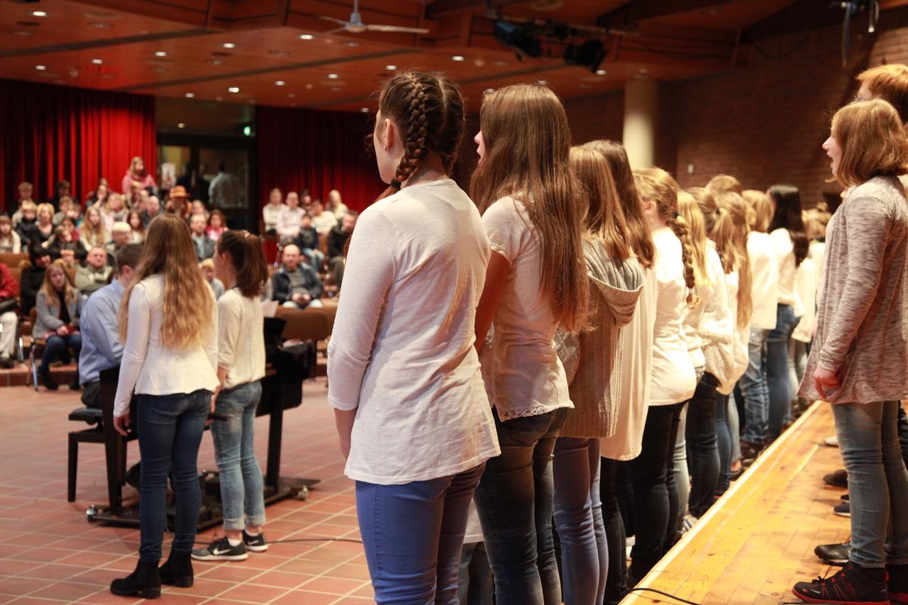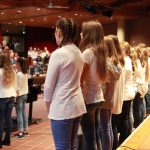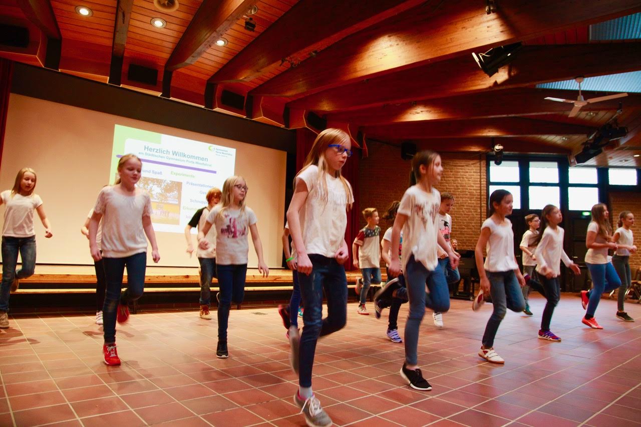 Schwungvoll und fröhlich begann dann um 9.15 Uhr im Forum die allgemeine Begrüßungsveranstaltung mit einem Auftritt der Chor-AG „Fresh“, bei der schon alle Anwesenden begeistert mitklatschten. Daran schloss sich – nach einer herzlichen Begrüßung durch die Schulleiterin Susanne Burmester – eine im wahrsten Worte ebenfalls mitreißende Aerobiknummer der 5a an.