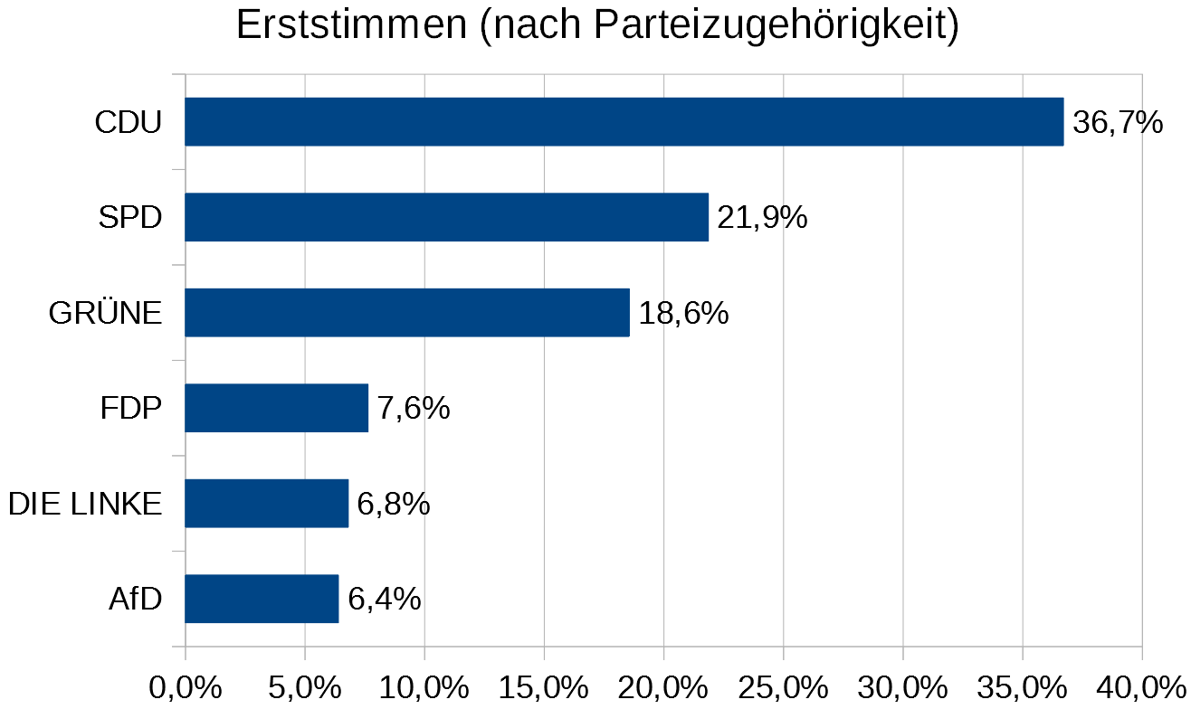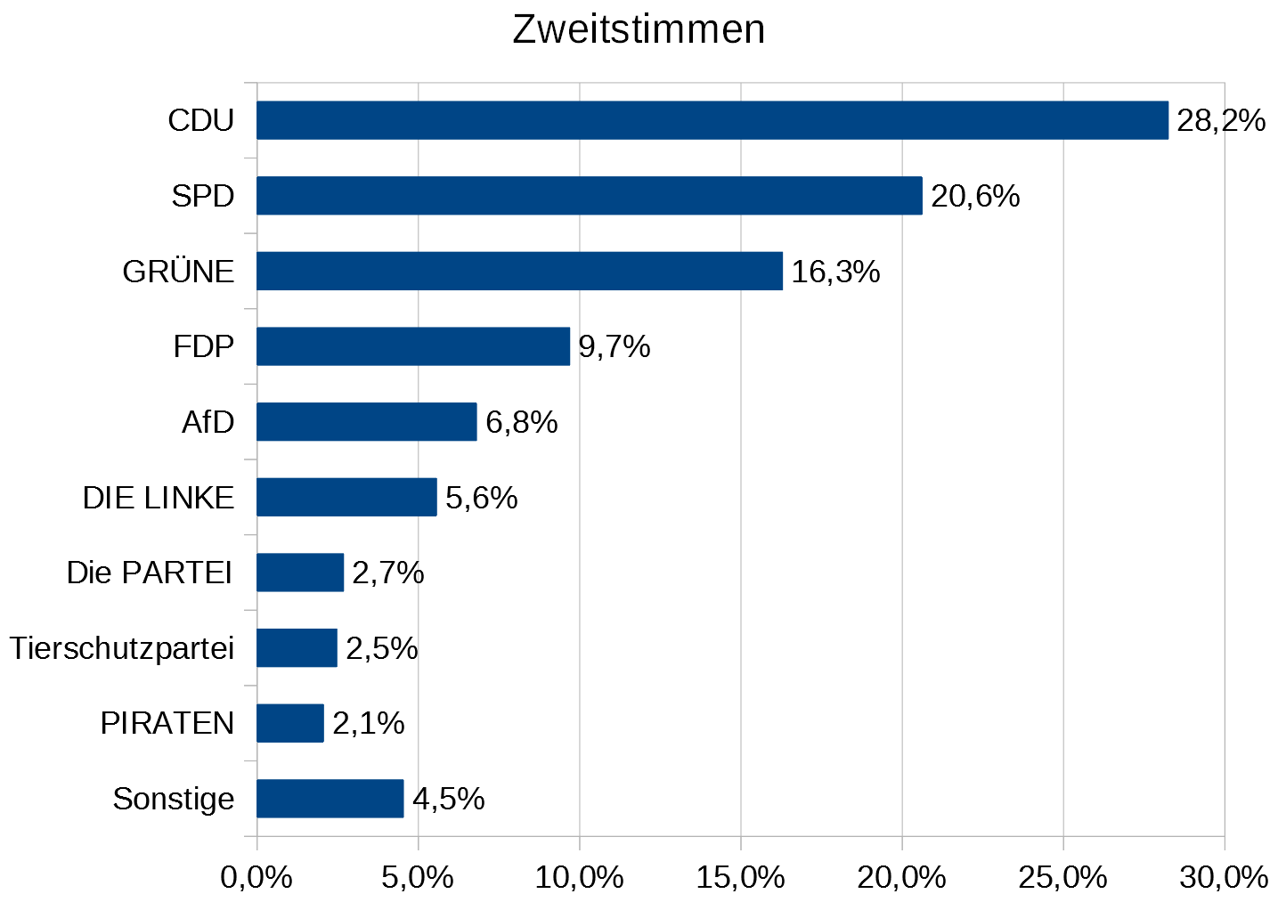 Sowohl bei den Erststimmen für die Kandidat_innen als auch bei den Zweitstimmen siegt die CDU vor der SPD, den Grünen und der FDP. Insgesamt wählten 485 Schüler_innen zwischen 10 bis 17 Jahren. Hierunter befinden sich auch einige Schüler_innen der benachbarten Realschule, die in den Pausen die Gelegenheit zur Wahl nutzten, da ein U18-Wahllokal allen Jugendlichen zur Verfügung steht.