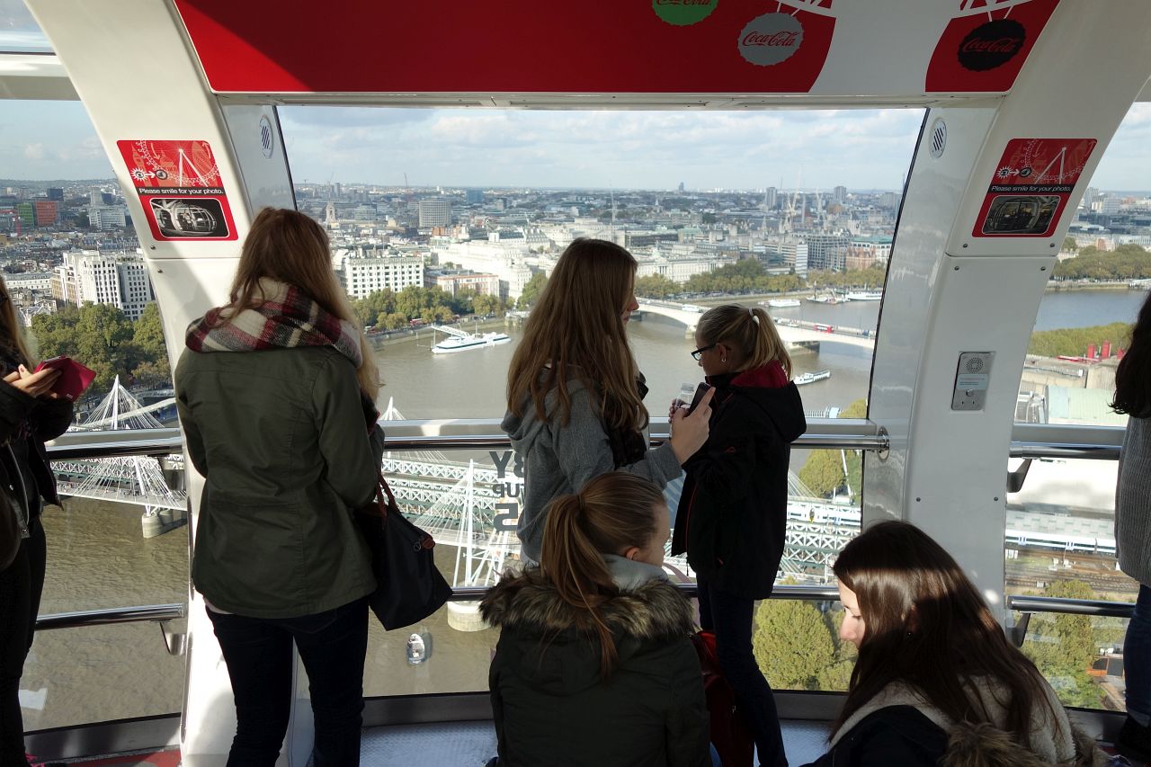 Am nächsten Tag trafen wir um 8 Uhr am Treffpunkt, fuhren ins Zentrum und machten eine etwa dreistündige Stadtrundfahrt in unserem Bus mit einer Londoner Stadtführerin. Die Stadtrundfahrt war sehr informativ wir haben alles gesehen, was man sehen muss. Wir haben auch erfahren, dass eine 8-Quadratmeter-Wohnung im Stadtzentrum über 200.000 Pfund kostet. Nach der Busfahrt hatten wir eine kurze Mittagspause. Wir trafen uns anschließend am London Eye, dem berühmten Riesenrad, und teilten uns auf. Die meisten gingen ins Eye, aber manche auch ins SeaLife-Aquarium, was sich direkt in der Nähe befindet. Da es beim London Eye technische Probleme gab, hatten wir einen besonders langen Aufenthalt in unseren Kapseln. Doch zum Glück schien die Sonne und die meisten von uns genossen den Blick auf London und die Themse. Nach einem Spaziergang vorbei an weiteren Sehenswürdigkeiten und über die Millenium Bridge bis hin zu Covent Garden, fuhren wir mit der Tube (die Londoner U-Bahn) zur Victoria Station und von dort mit dem Zug zurück zu unseren Gastfamilien, wo wir gegen etwa 20 Uhr eintrafen.