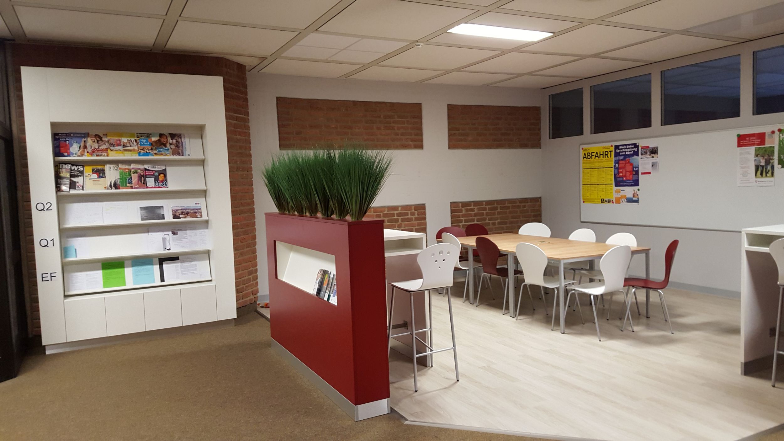 Dabei haben die Schülerinnen und Schüler tolle Ideen eingebracht, wie z.B. die Steckdosenelemente zum Aufladen von Handys und Laptops. Herr Meier hat mit seinen Entwürfen einmal mehr überzeugt: hell mit farbigen Tupfern präsentiert sich der neue Raum für die Schülerinnen und Schüler. Im neuen, größeren Regal finden sie viele Informationen rund um die Studien- und Berufswahlorientierung.