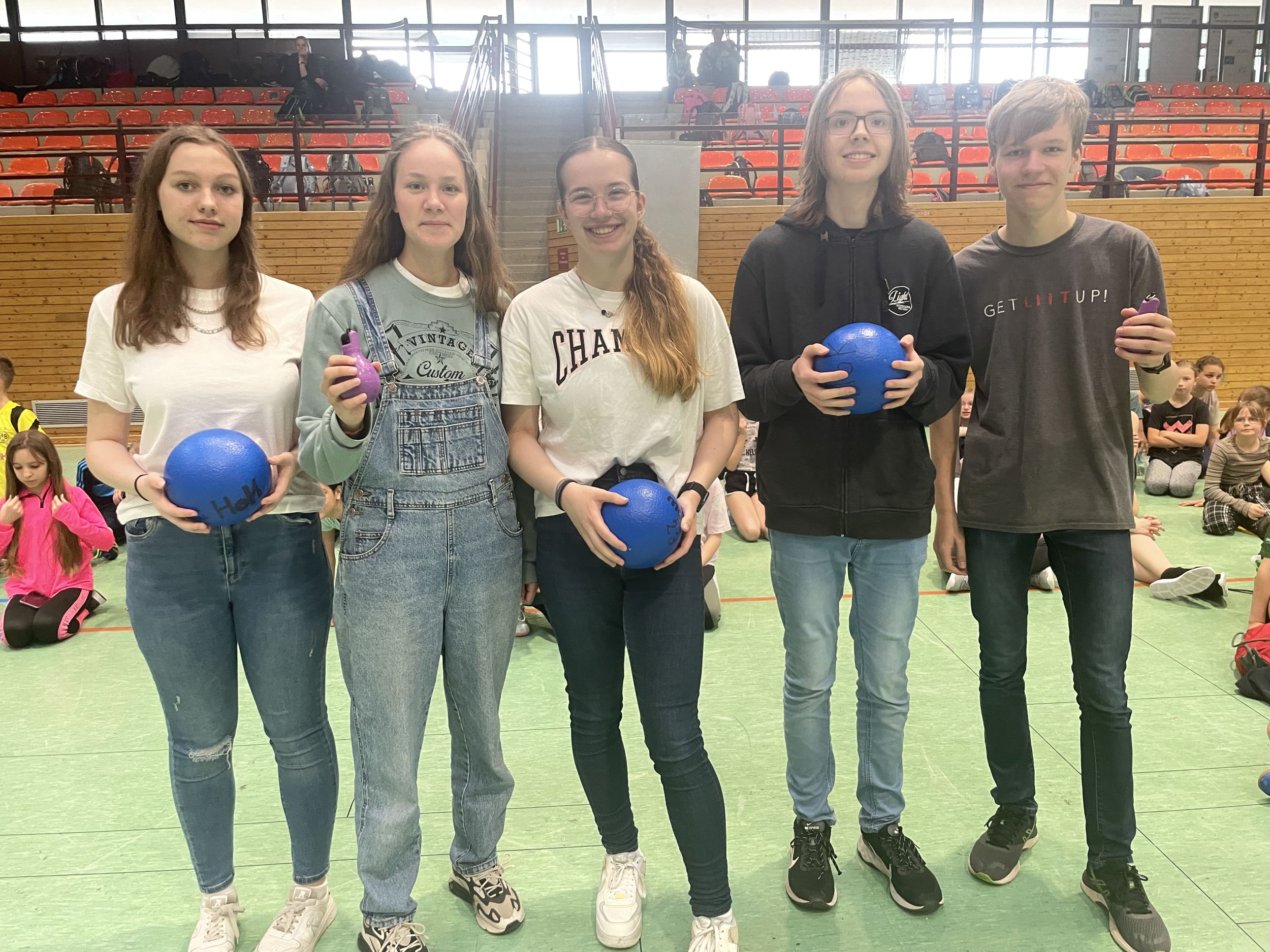 Zur Unterstützung der Schiedsrichter und Klassen waren auch einige Paten der 5. Klassen gekommen. Zum Glück, denn sie halfen tatkräftig bei der Betreuung der 90 Fünftklässler*innen und feuerten sie während der Spiele lautstark an.