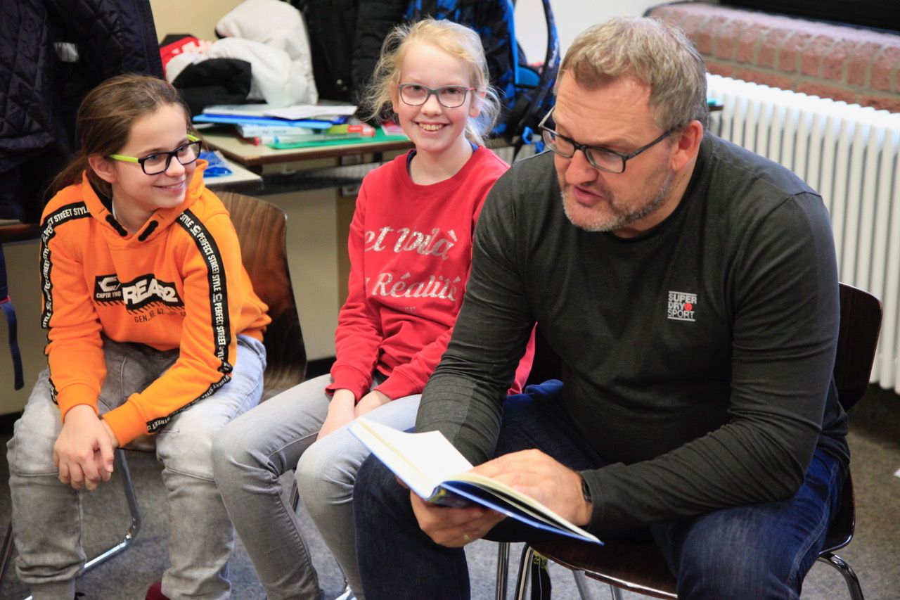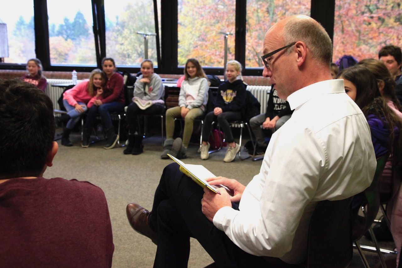 Ob Henning Mankells Klassiker „Der Hund, der unterwegs zu einem Stern war“, der im Norden Schwedens spielt, „Meine wunderbar seltsame Woche mit Tess“, ein Mädchen sucht ihren Vater, von Anna Woltz oder „Was du niemals tun solltest, wenn du unsichtbar bist“ von Ross Welford – so unterschiedlich wie die Bücher, waren auch die Vorleser/innen: Der stellvertretende Schulleiter und Deutschlehrer Dr. Stefan Braun, die Deutschlehrkräfte Christiane Kutzer und Olaf Küster, Schulsekretärin Bettina Burkardt, die Oberstufenschülerinnen Magdalena Bestvater, Chiara Knittel und Nicole Pestunova sowie schon zum sechsten Mal Bürgermeister Bernd Hedtmann zogen jede/r auf ihre/seine Art die jungen Zuhörer/innen in ihren Bann.
