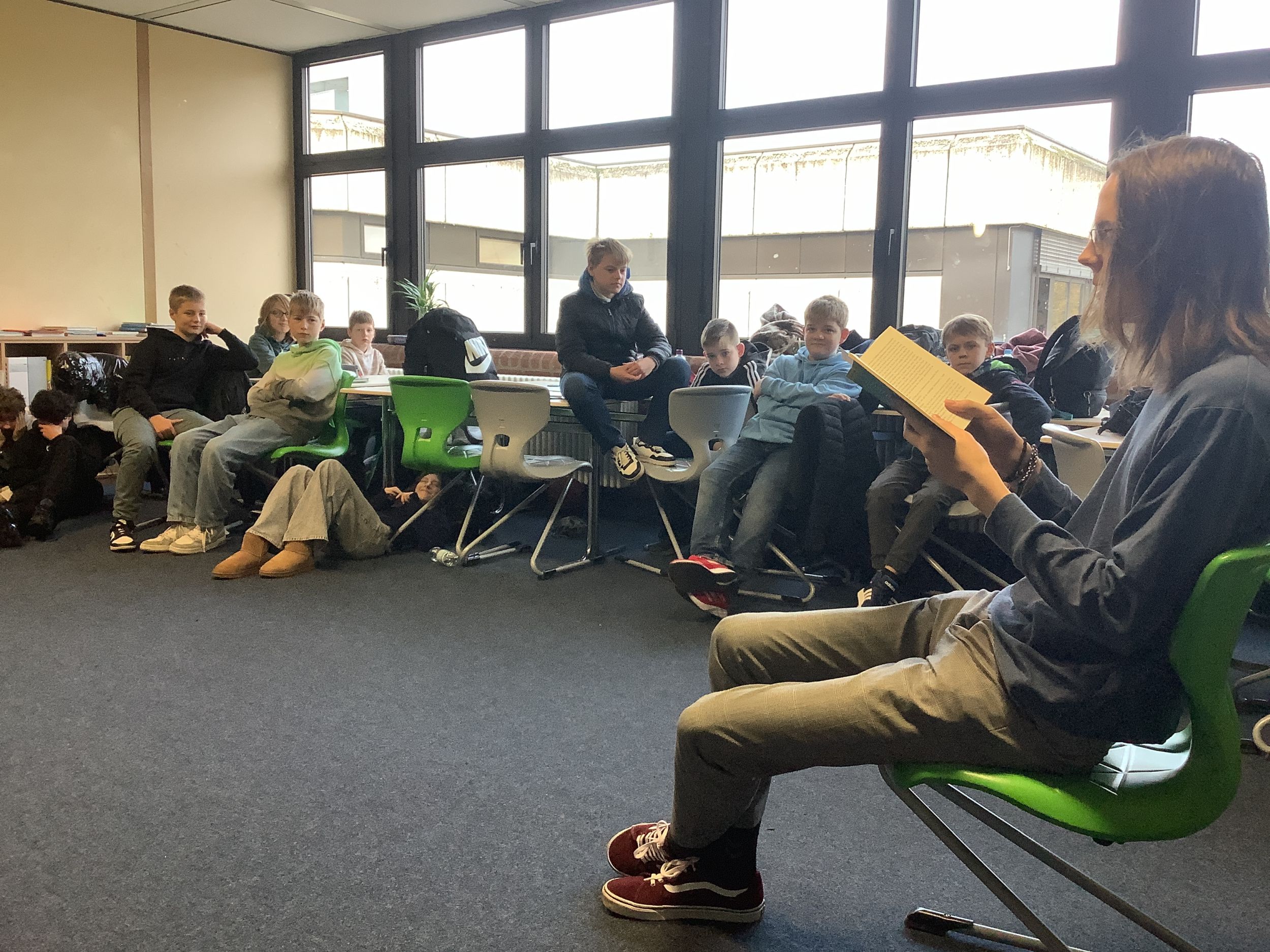 Die Palette der Bücher reichte von Michael Endes Klassiker „Wunschpunsch“ bis zum „Flüsterwald“ von Andreas Suchanek und Timo Grubing. Einige Zuhörende erlebten sogar die Premiere, dass ein Lehrer des Gymnasiums, Olaf Küster, einen Auszug seiner selbst verfassten Reihe „Die Bolzplatzkicker“ zum Besten gab: Für Ben, Luca, Mia und Sara, ist der Start in die fünfte Klasse sehr aufregend. Sie sind alle fußballbegeistert, gründen ein eigenes Team und nehmen schließlich an der Schulmeisterschaft teil. Wir sind schon gespannt auf den Anfang Dezember erschienen zweiten Band der Reihe und wünschen Olaf Küster viel Freude und Erfolg in seinem „Zweitberuf“ als Schriftsteller!